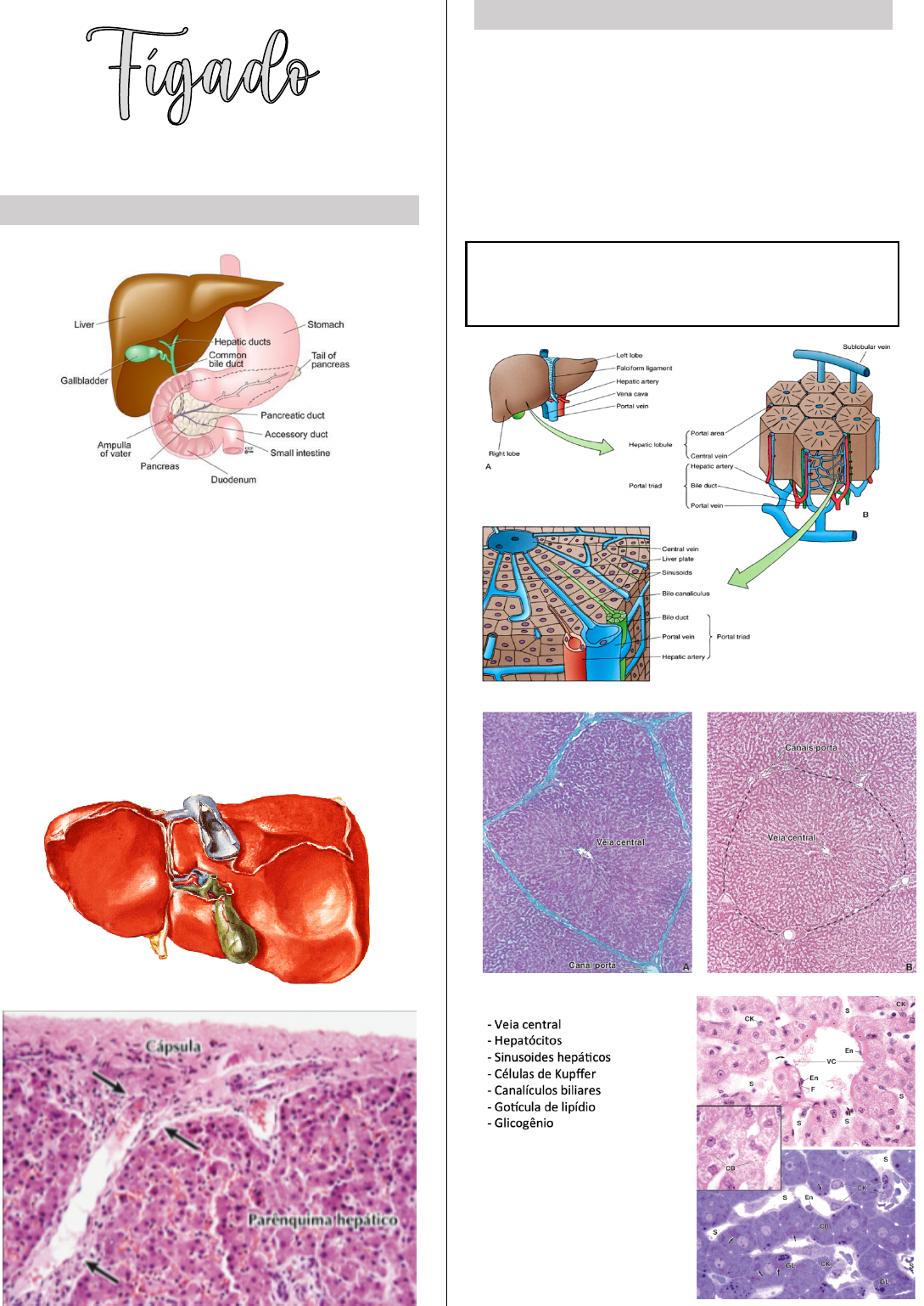HISTOLOGIA INTRODUÇÃO Um órgão exócrino e endócrino, tem a função de: auxiliar o equilíbrio da glicemia (armazena glicogênio), produção e secreção de bile, produção de fatores de coagulação sanguínea. Estroma (20%) - cápsula de tecido conjuntivo – Cápsula de Glisson. Parênquima (80%) – formado pelos hepató- citos - Os hepatócitos estão organizados formando os lóbulos. DIVISÃO Lóbulo clássico (hepático)– organizado tendo uma veia central – veia centrolobular. E nas periferias tem as tríades portais (ducto biliar, arteríola, vênula – pode ter linfático também), tem cerca de 3 a 6 por lóbulo. • Veia centrolobular, placas de hepatóci- tos, sinusóides hepáticos. OBS.: Quanto mais perto da tríade porta, mais oxigênio tem, o oxigênio que vem é do ramo da artéria hepática. Entre o capilar e hepatócito existe um espaço – espaço de disse. A bile é produzida pelos hepatócitos que vão para os ductos biliares que ficam entre esses hepatócitos e vão em direção centrifuga – para a periferia. Células de ito – síntese da vitamina a e pode produzir colágenos para fibrose. TRÍADE PORTAL O sangue sai da tríade porta e vai para veia central, a linfa vai da veia para tríade. Duplo suprimento sanguíneo: • Veia porta do fígado – sangue rico em nutrientes do TGI (75%). • Artéria hepática própria – sangue oxigenado (25%). Placa de hepatócitos: junções de oclusão, des- mossomos e canalículos biliares. Sinusoides hepáticos: células endoteliais, células de kupffer (macrófagos). Capilares sinusoides: endotélio descontínuo, lâmina basal descontínua, diâmetro aumentado e trajeto tortuoso. LÓBULO E ÁCINO HISTOLOGIA INTRODUÇÃO Vesícula biliar se localiza na fossa na face visceral do fígado. Quando é serosa tem peritônio, quando não tem é adventícia. A vesícula biliar tem peritônio, porque se não tivesse ela seria solta. Funções: armazenamento de bile. Trajeto da bile: ducto cístico -> ducto colédoco -> ampola hepatopancreática -> papila maior do duodeno. OBS.: Ação hormonal - Colecistoquinina (CCK – mucosa intestinal) – estimula a contração do músculo liso da vesícula biliar = liberação da bile na presença da gordura dos alimentos. CONSTITUIÇÃO HISTOLÓGICA Colangiócitos tem microvilosidades – dão origem aos ductos biliares. Mesotélio = tecido que forma o peritônio = tec. epitelial simples pavimentoso. Glândula mista: Porção exócrina: produção de enzimas (zimogênio – enzimas inativas). Porção endócrina: produção de hormônios Estroma (toda área de sustentação de um órgão – tecido conjuntivo) e parênquima (parte funcional do órgão – tecido epitelial). De cada ácino tem um ducto intercalar, e junção de ductos intercalar forma intralobular, que forma os lóbulos. Toda glândula endócrina terá no mínimo capilar fenestrado. Ilhotas pancreáticas: agrupamentos de células dispersas pelo órgão. Pâncreas exócrino: Pâncreas endócrino: