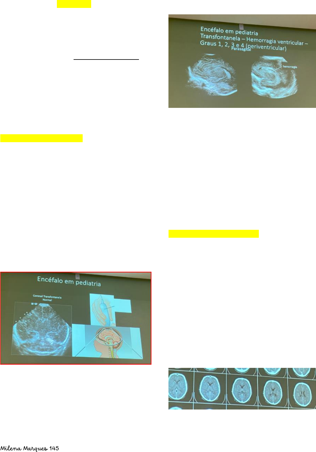 Milena Marques 145 Introdução a Imagens em Neurologia – RNM e TC. Introdução – Quais são os métodos de imagem disponíveis na neuro radiologia: • Radiografia de Crânio • Ultrassonografia de crânio → muito utilizada para avaliação de neonatos com fontanelas abertas. → avaliar a presença de hemorragia intracraniana. • TC de crânio → importante principalmente no contexto de trauma • RM de crânio → excelente para caracterizar as lesões → melhor resolução tecidual. o Difusão o Espectroscopia o Perfusão. 1 – Ultrassonografia de Crânio: • Equipamentos utilizados o Transdutor + gel, teclado, monitor, impressora • Vantagens do uso do USG: o Sem radiação ionizante o Baixo custo o Rápido o Imagens em tempo real o Maior contato do radiologista com o paciente o Muito vantajoso em criança com fontanela aberta = USG transfontanela ▪ Avaliação de hemorragia intracraniana. • Desvantagens o Método avaliador-dependente o Estudar órgãos protegidos por ossos – encéfalo do adulto o Estudar órgãos que tenha ar o Pacientes obesos • Termos utilizados no USG o Hiperecóico = mais branco – ex: sangue o Hipoecoico = mais cinza – tecidos o Anecoico = preto – ventrículos. 2 – Tomografia computadorizada: • Transforma energia de radiação ionizante em imagens – diferença de absorção entre os tecidos • Excelente resolução espacial • Vantagens o Rápido ( 5-10 minutos a depender do equipamento utilizado) o Excelente resolução espacial – permite reformatação em vários planos • Desvantagens o Contraste endovenoso (iodo) – grau alérgico e nefrotóxico o Radiação ionizante o Alto custo o Equipamento emissor de radiação ionizante Milena Marques 145 • Reformatações: sagital, coronal, axial, obliqua, curva e radial • Janelas: janela de partes moles (para visualizar o parênquima) e janela óssea. • Indicações da TC o Trauma – diferenciar hematomas, visualizar hemorragias subaracnóidea o AVCi o AVCh o Avaliação de fraturas Anatomia da TC: • Estrutura 5 – quarto ventrículo • Estrutura 9 – ponte • Estrutura 4 – bulbo • Estrutura 7 – cerebelo • Estrutura 36 – mesencéfalo Milena Marques 145 3 – Ressonância Magnética • Formação da imagem através de interação de um forte campo magnético sem emissão de radiação ionizante • Vantagens o Excelente resolução tecidual o Boa resolução espacial o Não emite radiação ionizante • Desvantagens o Maior tempo do exame o Contraste endovenoso – quelato de Gadolíneo – fibrose renal o Alto custo (maior que o da TC) • Contraste Gadolíneo ➔ relativamente seguro o Contraindicado em nefropatias (pois possui eliminação renal e a hemodiálise não elimina) o Contraindicado na gravidez o Contraindicado se alergia a gadolínio o Na lactação evitar amamentar nas primeiras 24hrs após o contraste • Quando utilizar Gadolíneo? o Revascularização da lesão o Suspeita de malignidade o Diferenciar tumor de edema o Avaliar perfusão Atenção reconhecendo tomografia x ressonância: Na TC – diferentes atenuações: ➔ Nomeclatura da TC: hiperdenso, hipodenso, hiperatenuante , hipoatenuante. • Água = cinza médio • Ar = preto ➔ hipodenso • Gordura = cinza escuro • Osso = branco ➔ hiperdenso • Meio de contraste = branco brilhante Diferenciando TC x RNM Milena Marques 145 TC RNM (T1 e T2) Calota craniana = acentuadamente hiperdenso Calota craniana = nunca hiperdenso – geralmente baixo sinal (T1 ou T2) Gordura do tecido celular subcutâneo = sempre escuro (hipodenso) Gordura do tecido celular subcutâneo = pode ser clara (se supressão – escura) Liquor = hipodenso Liquor = hiperdenso (claro) ou escuro (t2 ou t1) Substancia branca = cinza escuro (apresenta-se mais escura que o córtex porque possui mais mielina – gordura, penetrando mais radiação) Substancia branca = vai depender se é T1 ou T2 Substância cinzenta = cinza médio Substância cinzenta = vai depender se é t1 ou t2. • Planos na RNM – Sagital, coronal e axial • Sequencias da RNM – ponderação em T1 e ponderação em T2 o Ponderação em T1 ▪ T1 ▪ T1 com supressão de gordura o Ponderação em T2 o FLAIR (T2 com supressão do liquor) o Pós- CE o Técnicas avançadas – difusão, perfusão, espectroscopia, tractografia. • Nomenclatura usada na RM: hiposinal, hipersinal Agua/ liquor ➔ T1 – cinza médio / T2 – Brilha Ar ➔ T1 – preto / T2 – preto Gordura ➔ T1 – branca / T2 – branca ou preto Osso ➔ T1 – cinza escuro / T2 – cinza escuro Meio de contraste ➔ so no T1 – branca brilhante Lembrando que no FLAIR – é igual ao T2 mas com supressão do liquor (então o liquor vai ficar escuro, mas a substancia branca continua mais escura que a cinzenta) Técnicas avançadas de RNM 1 – Difusão (DWI): estuda o movimento randômico das moléculas de água • Conceito – avaliação qualitativa ou Milena Marques 145 quantitativa difusão representando a área percorrida por uma molécula de água em um intervalo de tempo (mm²/s) • Quadro existe uma “dificuldade de caminhar pelo tecido” a imagem fica branca. → tumores ou edemas ficam brancos. • Principio da difusão no AVi hiperagudo → presença do edema citotóxico do AVC restringe a movimentação das molecular → elas se tornam ais claros (área com edema) • Diferenciação de tumor e abscesso o Conteúdo hipersinal → abscesso o Conteúdo hiposinal → tumor • Tractografia – as moléculas de água não se difundem livremente em tecidos organizados (tecidos biológicos) – anisotropia o Essa técnica permite a visualização dos tratos para melhor direcionar a neurocirurgia. 2 – Espectroscopia de prótons • Método não invasivo • Identificação in vivo de metabolitos encefálicos (bioquímica) • Permite que o tecido seja avaliado quanto a presença e concentração de vários metabolitos • Pode aumentar a especificadae e ajudar a me