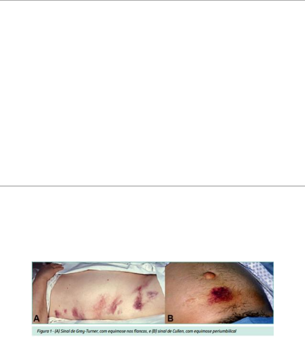 Pedro Santos PANCREATITE AGUDA Etiologia Conceitualmente, pancreatite aguda é a inflamação aguda do parênquima pancreático de natureza química, resultante da autodigestão enzimática pela ativação intraglandular de suas próprias enzimas. Podemos classificá-la, de acordo com a gravidade, em leve ou grave (formas denominadas antes como edematosa/intersticial ou necrosante/necro-hemorrágica). A principal causa de pancreatite está associada à litíase biliar. Cerca de 70 a 80% dos casos são devidos a colelitíase e álcool. Não é possível determinar a etiologia em 10 a 15%, sendo classificados como pancreatite idiopática. A fisiopatologia da pancreatite na litíase biliar não é completamente entendida. A obstrução do ducto levaria o refluxo biliar para dentro do ducto pancreático, ocasionando lesão das células acinosas por meio da ativação das enzimas pancreáticas e da liberação de fatores inflamatórios que geram a resposta inflamatória e a lesão pancreática. O álcool pode ocasionar a pancreatite aguda por basicamente 3 motivos: disfunção do esfíncter de Oddi, formação de “rolhas proteicas” e efeito tóxico direto do álcool. O uso de drogas talvez seja a 3ª causa (0,3 a 1,4%), porém o mecanismo que causa a inflamação pancreática não é bem conhecido. A hipertrigliceridemia é responsável pela pancreatite aguda em 1 a 4% dos casos, quando níveis >1.000mg/dL. Outras causas são hipercalcemia, colangiopancreatografia retrógrada endoscópica (CPRE) e mutações genéticas (PRSS1 – pancreatite hereditária autossômica dominante –, SPNK1 e CTRF – fibrose cística). Diagnóstico O quadro clássico é de dor de forte intensidade, em faixa, no abdome superior e no dorso (irradiação para o dorso em 50% dos casos), associada a vômitos incoercíveis (presentes em 90% dos casos) e hiperamilasemia. Os casos mais graves vêm acompanhados de sinais de choque e de insuficiência orgânica, como desidratação, taquicardia, hipotensão e taquidispneia (inflamação do diafragma pela pancreatite, derrame pleural ou síndrome da angústia respiratória do adulto), resultantes de processo inflamatório sistêmico (pancreatite aguda grave). Podem ser encontrados sinais de hemorragia retroperitoneal, como os de Grey-Turner (equimoses nos flancos), de Cullen (equimose periumbilical) e de Frey (equimose no ligamento inguinal). Os melhores exames subsidiários para o diagnóstico são a amilase e a lipase. A amilase elevase de 6 a 12 horas após o início da dor, possui meia-vida de 10 horas e normaliza-se em 3 a 5 dias. Aumentos acima de 3 vezes têm sensibilidade de 67 a 83% e especificidade de 85 a 98% para o diagnóstico de pancreatite aguda. A lipase aumenta após 4 a 8 horas do início do quadro, com pico em 24 horas e volta a normalizar-se em 8 a 14 dias (sensibilidade e especificidade de 82 a 100%). Pedro Santos Outros exames: Hemograma: a avaliação do hematócrito é importante, pois a sua elevação é sinal de mau prognóstico, já que reflete sequestro de líquido para o 3º espaço; TGO (Transaminase Glutâmico-Oxalacética) e TGP (Transaminase Glutâmico-Pirúvica); uma meta- análise evidenciou que concentração de TGP ≥150UI/L possui valor preditivo positivo de 9% para o diagnóstico de pancreatite biliar; PCR (Proteína C Reativa – níveis >150mg/dL nas 48 horas, em associação a pancreatite severa). A Tomografia Computadorizada (TC) de abdome não tem valor para diagnóstico na fase aguda, mas é o principal exame para a avaliação do pâncreas, principalmente com contraste. O exame deve ser solicitado preferencialmente após 48 a 72 horas, em todos os indivíduos com pancreatite aguda grave, para identificação de áreas mal perfundidas sugestivas de necrose e confirmação da suspeita de pancreatite necrosante. A ultrassonografia e a ecoendoscopia auxiliam no diagnóstico etiológico, ou seja, avaliam a presença de cálculos ou microcálculos na via biliar. Outro exame que pode ser solicitado é a CPRE, que permite o diagnóstico etiológico, assim como em casos específicos a terapêutica por meio da papilotomia e/ou extração de cálculos. Complicações Pulmonar Podem ocorrer atelectasia, derrame pleural e síndrome da angústia respiratória na fase aguda da pancreatite, devido ao quadro de síndrome da resposta inflamatória sistêmica. Renal O sequestro de fluidos que ocorre na fase aguda da pancreatite leva a depleção do volume intravascular, podendo cursar com insuficiência renal aguda pré-renal. Cardíaca Observa-se falência aguda do miocárdio em decorrência do processo inflamatório agudo Metabólica Observa-se hiperglicemia devido a falência pancreática endócrina, acidose metabólica, hipocalcemia e hipomagnesemia na fase aguda. Sistêmica Coagulação intravascular disseminada, disfunção de múltiplos órgãos e sistemas e choque hipovolêmico, todas na fase aguda. Trombose venosa portoesplenomesentérica (PSMVT) desenvolve-se em aproximadamente 50% dos pacientes com pancreatite aguda necrosante e é rara na ausência de necros Local Na fase aguda, podem ocorrer hemorragia e necrose nos processos mais intensos. Com o passar dos dias, por volta da 2ª semana de evolução, a necrose pode infectar-se, dando origem a infecção ou abscesso pancreático, ou o processo inflamatório pode comprometer estruturas vizinhas, como o mesocólon transverso, levando a isquemia e perfuração. O efeito de massa gerado por coleções pancreáticas pode levar a quadros obstrutivos gastroduodenais. Em longo prazo, as coleções pancreáticas podem se organizar e desenvolver uma pseudocápsula, formando pseudocisto. Outras Dentre elas, estão gastrite hemorrágica, úlcera de estresse, necrose gordurosa metastática etc. Fatores de Prognóstico Podemos utilizar critérios para avaliação prognóstica dos casos de pancreatite. Dentre eles, os mais utilizados na prática clínica são os de Ranson (Tabela a seguir), o
