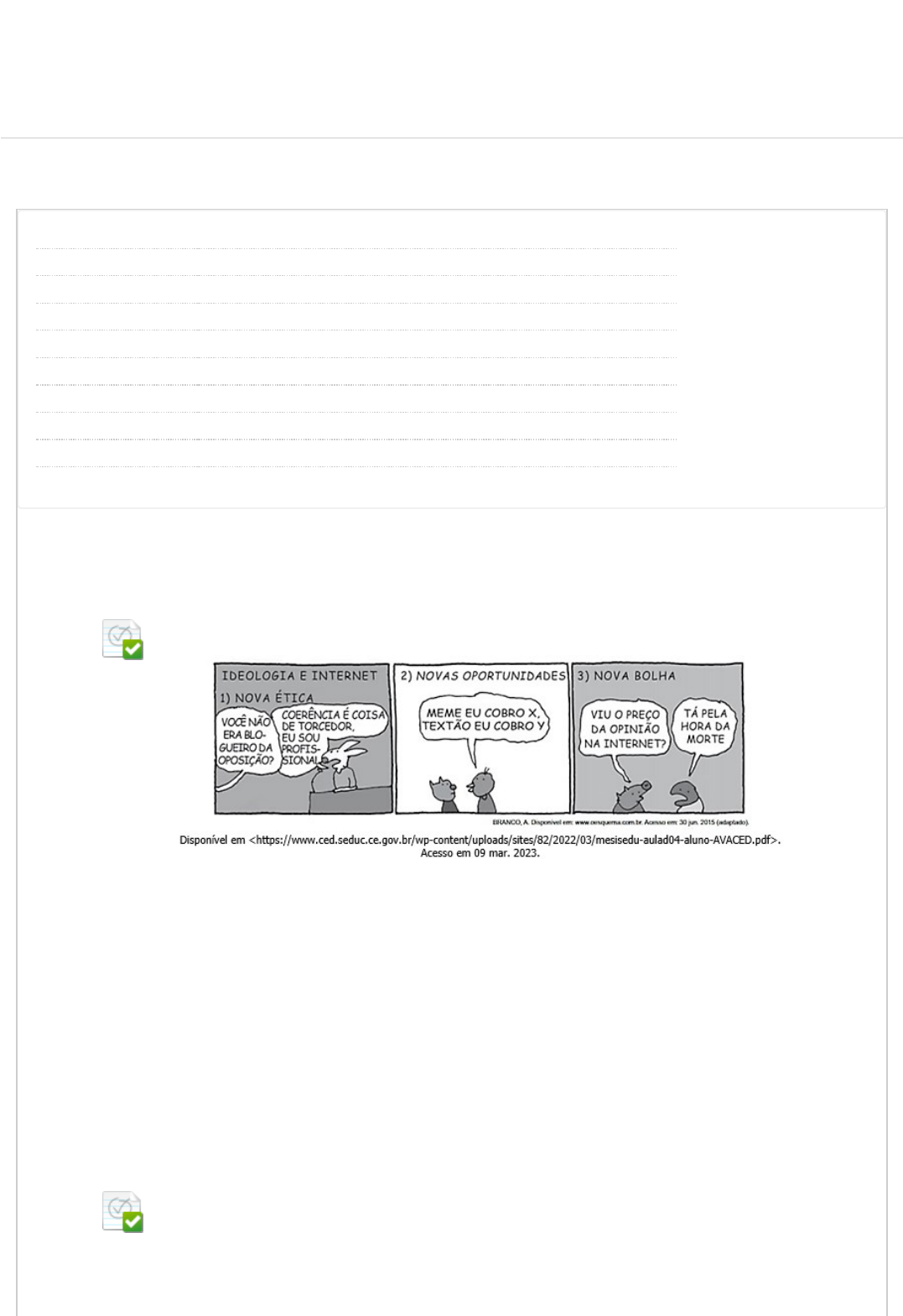 Revisar envio do teste: PSA 2023/1PSA 6937-00 CONTEÚDO Usuário maria.silva1435 @aluno.unip.br Curso PSA Teste PSA 2023/1 Iniciado 09/05/23 21:55 Enviado 09/05/23 23:55 Status Completada Resultado da tentativa 8 em 10 pontos Tempo decorrido 1 hora, 59 minutos Autoteste O aluno responde e o resultado do aluno não é visível ao professor. Resultados exibidos Respostas enviadas, Perguntas respondidas incorretamente Pergunta 1 Resposta Selecionada: a. Leia a tirinha. O objetivo da tirinha é criticar a mercantilização da produção de opinião nas redes sociais. Pergunta 2 Leia a charge. UNIP EAD BIBLIOTECAS MURAL DO ALUNO TUTORIAISCONTEÚDOS ACADÊMICOS 0,5 em 0,5 pontos 0,5 em 0,5 pontos http://company.blackboard.com/ https://ava.ead.unip.br/webapps/blackboard/execute/courseMain?course_id=_28560_1 https://ava.ead.unip.br/webapps/blackboard/content/listContent.jsp?course_id=_28560_1&content_id=_439332_1&mode=reset https://ava.ead.unip.br/webapps/portal/execute/tabs/tabAction?tab_tab_group_id=_10_1 https://ava.ead.unip.br/webapps/portal/execute/tabs/tabAction?tab_tab_group_id=_27_1 https://ava.ead.unip.br/webapps/portal/execute/tabs/tabAction?tab_tab_group_id=_47_1 https://ava.ead.unip.br/webapps/portal/execute/tabs/tabAction?tab_tab_group_id=_29_1 https://ava.ead.unip.br/webapps/portal/execute/tabs/tabAction?tab_tab_group_id=_25_1 https://ava.ead.unip.br/webapps/login/?action=logout Resposta Selecionada: d. I. O objetivo da charge é criticar a criação de datas especiais para temas especí�cos. II. A charge critica o desmatamento, causado pela ação humana, que afeta os habitats naturais. III. A charge associa a destruição do meio ambiente à morte. Com base na leitura, avalie as a�rmativas. É correto o que se a�rma apenas em II e III. Pergunta 3 I. De acordo com a charge, o indivíduo que se informa somente por mensagens enviadas por redes sociais tem uma visão limitada e Leia a charge. Com base na leitura, avalie as asserções e a relação proposta entre elas. 0,5 em 0,5 pontos Resposta Selecionada: c. não verdadeira sobre os acontecimentos, sendo induzido a interpretações erradas. II. Apenas os cientistas têm discernimento sobre os fenômenos naturais e sociais, e a observação da realidade não é uma forma válida de conhecimento. PORQUE Assinale a alternativa correta. A asserção I é verdadeira, e a II é falsa. Pergunta 4 I. O efeito de humor da tirinha apoia-se no duplo signi�cado da palavra “estado”, entendida como entidade política e como situação. II. De acordo com o texto, ainda são fortes as in�uências religiosas no Estado brasileiro, o que o impede de ser classi�cado como laico. Leia a tirinha e o texto. O Estado brasileiro é laico? A situação de hoje é bem diferente daquela que vigia no Período Colonial e durante o Império, mas ainda está longe de caracterizar um Estado laico. As sociedades religiosas não pagam impostos (renda, IPTU, ISS etc.) e recebem subsídios �nanceiros para suas instituições de ensino e assistência social. O ensino religioso faz parte do currículo das escolas públicas, que privilegia o Cristianismo e discrimina outras religiões, assim como discrimina todos os não crentes. Em alguns estados, os professores de ensino religioso são funcionários públicos e recebem salários, con�gurando apoio �nanceiro do Estado a religiões, que, aliás, são as credenciadoras do magistério dessa disciplina. Certas sociedades religiosas exercem pressão sobre o Congresso Nacional, di�cultando a promulgação de leis no que diz respeito à pesquisa cientí�ca, aos direitos sexuais e reprodutivos. A chantagem religiosa não é incomum nessa área, como a ameaça de excomunhão. Há símbolos religiosos nas repartições públicas, inclusive nos tribunais. Disponível em <http://ole.u�.br/o-estado-brasileiro-e-laico/>. Acesso em 25 fev. 2023 (com adaptações). Com base na leitura, avalie as a�rmativas. 0,5 em 0,5 pontos Resposta Selecionada: c. III. A resposta do pai, nos quadrinhos, revela que ele é contra as pesquisas cientí�cas, assim como são, segundo o texto, as instituições religiosas. Assinale a alternativa correta. Apenas as a�rmativas I e II são corretas. Pergunta 5 Leia o texto, publicado em 11 de janeiro de 2023, pela agência de notícias da Fundação de Amparo à Pesquisa do Estado de São Paulo (FAPESP). Inteligência arti�cial pode orientar o diagnóstico de pacientes com falência da medula óssea Um algoritmo de machine learning capaz de orientar o diagnóstico de síndromes de falência da medula óssea foi desenvolvido por pesquisadores da Universidade de São Paulo (USP) e colaboradores norte-americanos. Os resultados foram divulgados na revista Blood, da American Society of Hematology. Com base na análise de 25 variáveis clínicas e laboratoriais, o modelo consegue predizer se a condição é hereditária ou adquirida, o que tem implicações principalmente no manejo de casos graves de pancitopenia – condição em que há redução tanto dos glóbulos brancos e vermelhos do sangue quanto das plaquetas, resultando em anemia [de�ciência de glóbulos vermelhos do sangue que pode causar fraqueza, cansaço, sonolência, falta de ar, entre outros problemas], leucopenia [menor capacidade de combater infecções por de�ciência de glóbulos brancos do sangue] e trombocitopenia [maior risco de hemorragias por de�ciência de plaquetas]. “A escolha de adiar o tratamento enquanto se aguarda o teste genético pode resultar em atraso signi�cativo no tratamento de pacientes gravemente pancitopênicos. Por outro lado, o diagnóstico errado de insu�ciência hereditária da medula óssea [BMF, na sigla em inglês] pode expor os pacientes a terapias ine�cazes e caras, regimes de condicionamento de transplantes tóxicos e uso inapropriado de um membro da família afetado como doador de células-tronco”, a�rmam os autores no artigo. Segundo os pesquisadores, a ferra