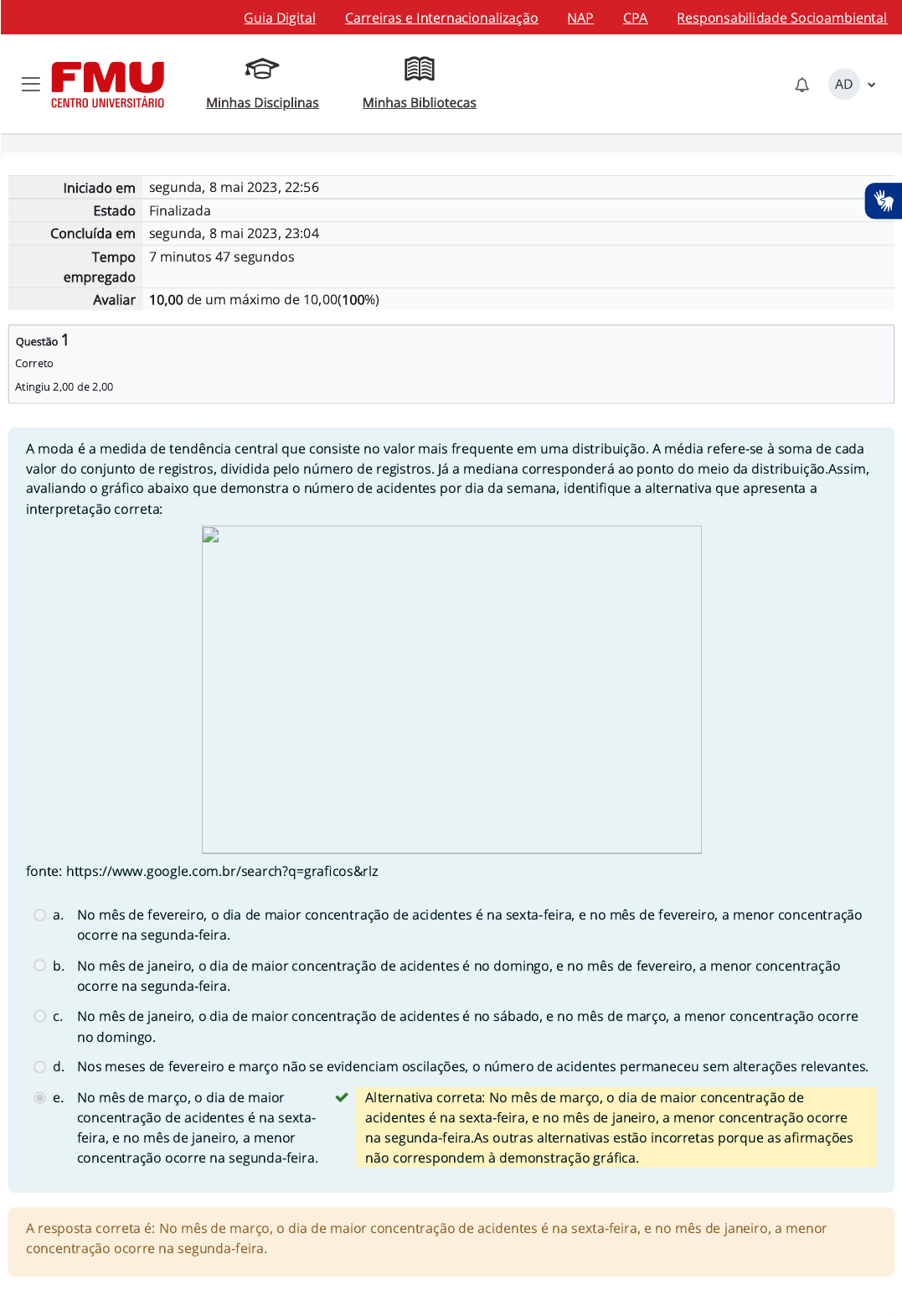 Iniciado em segunda, 8 mai 2023, 22:56 Estado Finalizada Concluída em segunda, 8 mai 2023, 23:04 Tempo empregado 7 minutos 47 segundos Avaliar 10,00 de um máximo de 10,00(100%) Questão 1 Correto Atingiu 2,00 de 2,00 A moda é a medida de tendência central que consiste no valor mais frequente em uma distribuição. A média refere-se à soma de cada valor do conjunto de registros, dividida pelo número de registros. Já a mediana corresponderá ao ponto do meio da distribuição.Assim, avaliando o grá�co abaixo que demonstra o número de acidentes por dia da semana, identi�que a alternativa que apresenta a interpretação correta: fonte: https://www.google.com.br/search?q=gra�cos&rlz a. No mês de fevereiro, o dia de maior concentração de acidentes é na sexta-feira, e no mês de fevereiro, a menor concentração ocorre na segunda-feira. b. No mês de janeiro, o dia de maior concentração de acidentes é no domingo, e no mês de fevereiro, a menor concentração ocorre na segunda-feira. c. No mês de janeiro, o dia de maior concentração de acidentes é no sábado, e no mês de março, a menor concentração ocorre no domingo. d. Nos meses de fevereiro e março não se evidenciam oscilações, o número de acidentes permaneceu sem alterações relevantes. e. No mês de março, o dia de maior concentração de acidentes é na sexta- feira, e no mês de janeiro, a menor concentração ocorre na segunda-feira. Alternativa correta: No mês de março, o dia de maior concentração de acidentes é na sexta-feira, e no mês de janeiro, a menor concentração ocorre na segunda-feira.As outras alternativas estão incorretas porque as a�rmações não correspondem à demonstração grá�ca. A resposta correta é: No mês de março, o dia de maior concentração de acidentes é na sexta-feira, e no mês de janeiro, a menor concentração ocorre na segunda-feira. Guia Digital Carreiras e Internacionalização NAP CPA Responsabilidade Socioambiental Minhas Disciplinas Minhas Bibliotecas AD https://codely-fmu-content.s3.amazonaws.com/Moodle/GuiaDigital/Guia+digital/index.html https://carreiras.fmu.br/ https://codely-fmu-content.s3.amazonaws.com/Moodle/NAP/inicial/nap/fmu/index.html https://codely-fmu-content.s3.amazonaws.com/Moodle/CPA/landing_CPA/index.html https://portal.fmu.br/sustentabilidade https://ambienteacademico.com.br/ https://ambienteacademico.com.br/ https://ambienteacademico.com.br/course/view.php?id=236 Questão 2 Correto Atingiu 2,00 de 2,00 Questão 3 Correto Atingiu 2,00 de 2,00 A moda é especialmente útil para reduzir a informação de um conjunto de dados qualitativos, apresentados sob a forma de nomes ou categorias, para os quais não se pode calcular a média e, por vezes, a mediana. A mediana é uma medida de localização do centro da distribuição dos dados. Como medida de localização, a mediana é mais robusta do que a média, pois não é tão sensível aos dados. Nesse contexto, suponha que, durante os 10 jogos para a eliminatória da copa do mundo de 2018, a seleção brasileira não perdeu nenhuma partida; marcou as seguintes quantidades de gols: 3, 2, 5, 3, 4, 3, 6, 1, 3 e 3. Identi�que entre as alternativas abaixo, aquela que apresenta, respectivamente, a média e a moda desse rol: a. 3,3 e 3 Alternativa correta: 3,3 e 3Média: 3 + 2 + 5 + 3 + 4 + 3 + 6 + 1 + 3 + 3 = 33/10= 3,3 Moda (o número mais frequente do rol): 3 gols b. 6,2 e 2 c. 2,3 e 4 d. 2,1 e 5 e. 4,3 e 3 A resposta correta é: 3,3 e 3 Suponha que determinado jornal publicou uma matéria sobre as eleições presidenciais de 2018, com a seguinte tabela sobre a pesquisa (dados �ctícios): Regiões Bolsonaro Alckmin Marina Nordeste 2º 1º 3º Norte 1º 2º 3º Sudeste 2º 1º 3º Centro-oeste 2º 1º 2º Sul 2º 1º 2º “No primeiro turno da eleição presidencial de 2018, o candidato governista, Geraldo Alckmin, venceria já no primeiro turno. ” Pelas pesquisas, ele está em 1º lugar nas pesquisas eleitorais. A variável “1º lugar” é classi�cada como: a. Variável quantitativa contínua b. Variável quantitativa ordinal c. Variável quantitativa discreta d. Variável qualitativa ordinal Alternativa correta: Variável qualitativa ordinal. É uma variável qualitativa ordinal porque está classi�cando o dado em ordem de grandeza. e. Variável qualitativa nominal A resposta correta é: Variável qualitativa ordinal https://codely-fmu-content.s3.amazonaws.com/Moodle/GuiaDigital/Guia+digital/index.html https://carreiras.fmu.br/ https://codely-fmu-content.s3.amazonaws.com/Moodle/NAP/inicial/nap/fmu/index.html https://codely-fmu-content.s3.amazonaws.com/Moodle/CPA/landing_CPA/index.html https://portal.fmu.br/sustentabilidade https://ambienteacademico.com.br/ https://ambienteacademico.com.br/ https://ambienteacademico.com.br/course/view.php?id=236 Questão 4 Correto Atingiu 2,00 de 2,00 -A estatística trabalha com dois conjuntos de dados: o universo e a amostra. Apesar de a estatística se preocupar em obter informações sobre a população, di�cilmente ela estuda todos os seus componentes (ex. censo). Não existem estatísticas especiais, como bioestatística e estatística econômica, mas sim aplicações especí�cas de estatística em determinadas áreas, o que leva a dividir a estatística especi�camente para questões didáticas. A estatística pode ser dividida em duas: -Estatística descritiva: é a parte que procura os melhores métodos para coletar, ordenar e sumarizar os dados dos experimentos. -Estatística experimental: é a parte que fornece os métodos de análise e interpretação dos resultados dos experimentos. Fonte: https://www.infoescola.com/matematica/estatistica/ Com relação aos métodos de amostragem, está correto o que se a�rma em: I. População é um conjunto de�nido de elementos que possuem determinadas características. Normalmente fala-se de população como referência ao total de habitantes de determinado lugar. II. Amostra é um 