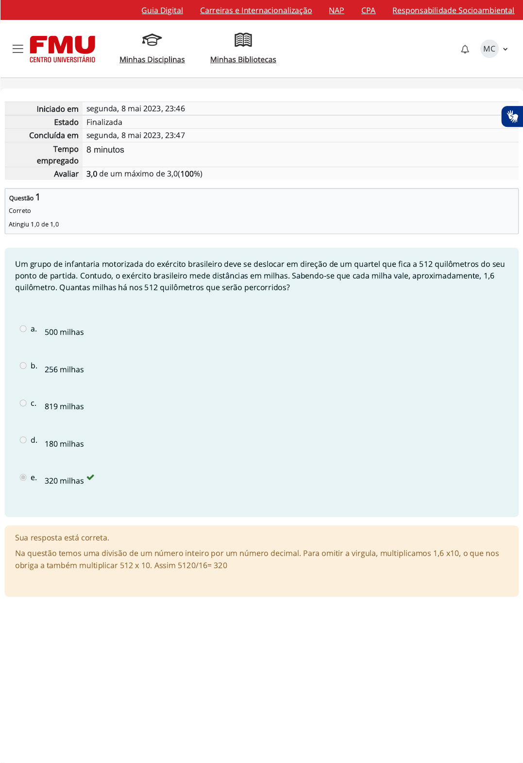 Iniciado em segunda, 8 mai 2023, 23:46 Estado Finalizada Concluída em segunda, 8 mai 2023, 23:47 Tempo empregado 8 minutos Avaliar 3,0 de um máximo de 3,0(100%) Questão 1 Correto Atingiu 1,0 de 1,0 Um grupo de infantaria motorizada do exército brasileiro deve se deslocar em direção de um quartel que �ca a 512 quilômetros do seu ponto de partida. Contudo, o exército brasileiro mede distâncias em milhas. Sabendo-se que cada milha vale, aproximadamente, 1,6 quilômetro. Quantas milhas há nos 512 quilômetros que serão percorridos? a. 500 milhas b. 256 milhas c. 819 milhas d. 180 milhas e. 320 milhas Sua resposta está correta. Na questão temos uma divisão de um número inteiro por um número decimal. Para omitir a virgula, multiplicamos 1,6 x10, o que nos obriga a também multiplicar 512 x 10. Assim 5120/16= 320 Guia Digital Carreiras e Internacionalização NAP CPA Responsabilidade Socioambiental Minhas Disciplinas Minhas Bibliotecas MC https://codely-fmu-content.s3.amazonaws.com/Moodle/GuiaDigital/Guia+digital/index.html https://carreiras.fmu.br/ https://codely-fmu-content.s3.amazonaws.com/Moodle/NAP/inicial/nap/fmu/index.html https://codely-fmu-content.s3.amazonaws.com/Moodle/CPA/landing_CPA/index.html https://portal.fmu.br/sustentabilidade https://ambienteacademico.com.br/ https://ambienteacademico.com.br/ https://ambienteacademico.com.br/course/view.php?id=236 Questão 2 Correto Atingiu 1,0 de 1,0 Leia as a�rmativas e assinale as opções que as classi�ca corretamente como verdadeiras(V) ou falsas(F). 1 - Todo número natural, também é um número racional. 2 - Números racionais não podem ser escritos na forma de fração. 3 - Existem números que são inteiros, mas, não são naturais, ainda que sejam racionais. 4 - Um número racional pode ter in�nitas casas decimais. a. F-F-F-V b. V-F-F-V c. V-F-V-F d. V-F-V-V e. F-F-V-F Sua resposta está correta. Resposta correta: A assertiva 1 é verdadeira, pois os números naturais estão contidos no conjunto dos números racionais e podem ser escritos como uma fração entre dois números naturais, com denominador diferente de zero. A assertiva 2 é falsa, já que todo número racional pode ser escrito na forma de uma fração. A assertiva 3 é verdadeira, uma vez que os números negativos são inteiros e não são naturais, ainda que, possam ser expressos como uma fração. A assertiva 4 é verdadeira, pois um número racional pode ter in�nitas casas decimais, desde que, seja uma dízima periódica. https://codely-fmu-content.s3.amazonaws.com/Moodle/GuiaDigital/Guia+digital/index.html https://carreiras.fmu.br/ https://codely-fmu-content.s3.amazonaws.com/Moodle/NAP/inicial/nap/fmu/index.html https://codely-fmu-content.s3.amazonaws.com/Moodle/CPA/landing_CPA/index.html https://portal.fmu.br/sustentabilidade https://ambienteacademico.com.br/ https://ambienteacademico.com.br/ https://ambienteacademico.com.br/course/view.php?id=236 Questão 3 Correto Atingiu 1,0 de 1,0 Uma loja de material de construções comprou para revenda 400 sacos de cimento ao preço de R$ 12,00 por saco e 100m de piso ao preço de R$ 7,50 por m . A loja decidiu vender cada saco de cimento por R$ 22,00 e cada m de piso por R$ 19,50. Até o momento a loja vendeu 143 sacos de cimento e 86 m e piso. Considerando o total do investimento inicial, a loja já obteve lucro ou, ainda, não cobriu os custos de aquisição dos produtos (que vamos chamar de prejuízo)? Assinale sua resposta utilizando números inteiros: a. Prejuízo de R$ 4.823 b. Nem lucro, nem prejuízo. O resultado da diferença receita - custo é igual a zero c. Lucro de R$ 4.823 d. Prejuízo de R$ 727 e. Lucro de R$ 727 2 2 2 2 Sua resposta está correta. Total do material comprado (custo inicial) = R$ 5.550. Receita total até o momento R$ 4.823. Resultado até o momento R$ 4.823– R$ 5.550 = - R$ 727, portanto a loja está com um prejuízo de R$ 727. https://codely-fmu-content.s3.amazonaws.com/Moodle/GuiaDigital/Guia+digital/index.html https://carreiras.fmu.br/ https://codely-fmu-content.s3.amazonaws.com/Moodle/NAP/inicial/nap/fmu/index.html https://codely-fmu-content.s3.amazonaws.com/Moodle/CPA/landing_CPA/index.html https://portal.fmu.br/sustentabilidade https://ambienteacademico.com.br/ https://ambienteacademico.com.br/ https://ambienteacademico.com.br/course/view.php?id=236