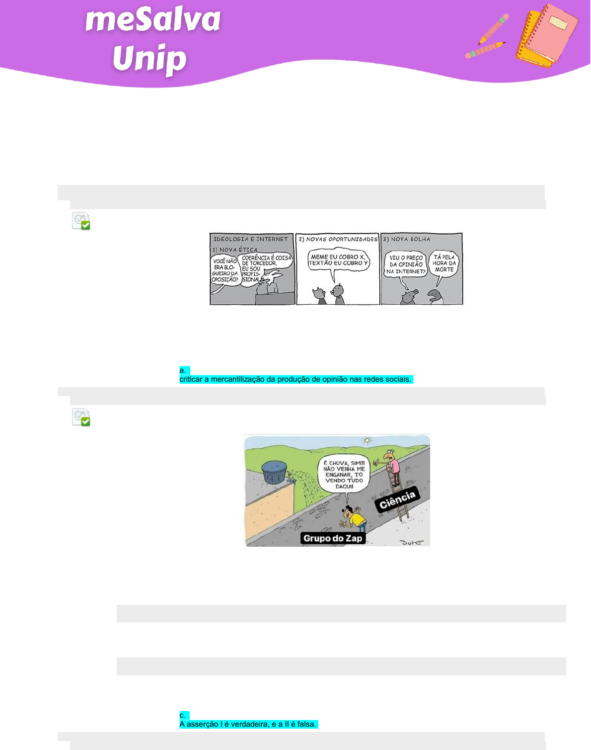 • Pergunta 1 0,5 em 0,5 pontos Leia a tirinha. O objetivo da tirinha é Resposta Selecionada: a. criticar a mercantilização da produção de opinião nas redes sociais. • Pergunta 2 0,5 em 0,5 pontos Leia a charge. Com base na leitura, avalie as asserções e a relação proposta entre elas. I. De acordo com a charge, o indivíduo que se informa somente por mensagens enviadas por redes sociais tem uma visão limitada e não verdadeira sobre os acontecimentos, sendo induzido a interpretações erradas. PORQUE II. Apenas os cientistas têm discernimento sobre os fenômenos naturais e sociais, e a observação da realidade não é uma forma válida de conhecimento. Assinale a alternativa correta. Resposta Selecionada: c. A asserção I é verdadeira, e a II é falsa. • Pergunta 3 0,5 em 0,5 pontos Leia a charge. AVALIAÇÃO PSA O objetivo da charge é Resposta Selecionada: c. valorizar o livro e as atividades pedagógicas não digitais como ferramentas importantes para a construção do conhecimento. • Pergunta 4 0,5 em 0,5 pontos Leia a charge e o texto de Eugenio Bucci. Há erros de informação, imprecisões, distorções de enfoque que, muitas vezes, não correspondem aos fatos e que são publicadas como notícias normais na imprensa convencional. Nós estamos diante de um fenômeno diferente. Nós estamos diante de uma usina de produção de notícias fraudulentas, com o propósito de fraudar os processos decisórios das democracias. É muito diferente, portanto, de um erro jornalístico, coisa que acontece todo dia. Uma boa redação jornalística, quando comete um erro, procura se corrigir. Uma notícia fraudulenta é fabricada por alguma central, algum grupo ou mesmo uma pessoa, que não age, publicamente, de boa-fé. Disponível em <https://mais.opovo.com.br/jornal/dom/2018/01/eugenio-bucci-e-evidente-que-caminhamos-para-um-jornalismo- melhor.html>. Acesso em 28 fev. 2023 (com adaptações). Com base na leitura, avalie as afirmativas. I. Segundo o texto, as fake news não se confundem com notícias mal elaboradas, pois, no caso das primeiras, elas são produzidas com a intenção de interferir politicamente na sociedade. II. De acordo com a charge, as fake news espalham-se mais rapidamente no meio rural, onde é maior o índice de analfabetismo. III. A charge e o texto apontam que a produção de fake news tem como propósito o consumo de informações por grande número de pessoas. É correto o que se afirma em Resposta Selecionada: d. I e III, apenas. • Pergunta 5 0,5 em 0,5 pontos Leia os quadrinhos e o texto. Bancos com divisórias e formatos desconfortáveis, pedras pontiagudas embaixo de viadutos, grades no entorno de praças e jardins, muros com pinos metálicos, construções sem marquises ou com gotejamento de água programado, cercas elétricas e arame farpado. Os elementos e materiais utilizados para afastar pessoas dos espaços públicos são muitos e acabam influenciando a maneira como os indivíduos convivem e vivenciam os municípios. A arquitetura hostil, termo que abrange todas as barreiras e desenhos urbanos que parecem dizer “não se sinta em casa” — como define a repórter Winnie Hu, do The New York Times —, é parte da realidade da maioria das cidades pelo mundo e vem despertando debates sobre o impacto dessas ações, principalmente por meio das redes sociais. A professora de antropologia do Centro de Graduação da Universidade da Cidade de Nova York, Setha Low, afirmou em entrevista para a Reuters que o risco que se corre com esse tipo de medida é mudar a natureza dos ambientes públicos de “inclusivos para exclusivos”. Já o fotógrafo alemão Julius-Christian Schreiner ressaltou à reportagem que o aumento de locais públicos administrados pela iniciativa privada acentuou o problema, deixando pouca área para as pessoas se “recostarem, vagarem ou socializarem sem a pressão de comprar algo”. Schreiner é o idealizador do trabalho “Agentes Silenciosos” — uma série de imagens sobre arquitetura hostil realizada em lugares como Londres, Paris, Hamburgo, Berlim e Nova York. Para o fotógrafo, nos municípios, os cidadãos são mais vistos como clientes. “Se você é um bom consumidor, pode usar a infraestrutura. Mas, se não for, não deveria estar nesse espaço”, declarou à Reuters. Ao mesmo tempo em que crescem os exemplos dessas iniciativas que barram a permanência por mais tempo de pessoas consideradas “indesejadas” — e aqui entram também os skatistas e sua circulação pelos centros urbanos —, a matéria cita grupos em diferentes localidades que estão se mobilizando para chamar a atenção para o assunto e tentar amenizar os seus reflexos. Disponível em <https://caosplanejado.com/arquitetura-hostil-quando-as-cidades-nao-sao-para- todos/?gclid=EAIaIQobChMI2dTn7Iqi_AIVtOBcCh0wLg_dEAMYASAAEgLVx_D_BwE>. Acesso em 14 dez. 2022 (com adaptações). Com base na leitura, avalie as afirmativas. I. Os quadrinhos revelam que as ações relacionadas à arquitetura hostil são planejadas, ideia também afirmada no texto. II. Segundo o texto, o uso de determinados espaços vincula-se mais ao conceito de consumidor do que ao de cidadão. III. A administração dos espaços públicos por empresas privadas, de acordo com o texto, é uma solução para que eles se tornem mais inclusivos. É correto o que se afirma em Resposta Selecionada: b. I e II, apenas. • Pergunta 6 0,5 em 0,5 pontos Leia o texto. Mas o que distingue o cinema de todos os outros meios de expressão culturais é o poder excepcional que lhe advém do fato de a sua linguagem funcionar a partir da reprodução fotográfica da realidade. Com efeito, com ele, são os próprios seres e as próprias coisas que aparecem e falam, dirigem-se aos sentidos e falam à imaginação: a uma primeira abordagem parece que qualquer representação (o significante) coincide de forma exata e unívoca com a informação conceptual que veicula (o significado). MARTIN, Marcel