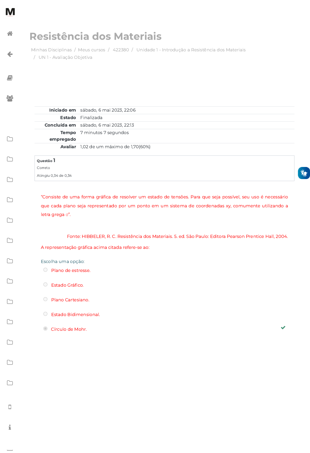 06/05/2023, 22:15 UN 1 - Avaliação Objetiva: Revisão da tentativa https://avap.multivix.edu.br/mod/quiz/review.php?attempt=2965361&cmid=1311901 1/3 Minhas Disciplinas / Meus cursos / 422380 / Unidade 1 - Introdução a Resistência dos Materiais / UN 1 - Avaliação Objetiva Resistência dos Materiais Iniciado em sábado, 6 mai 2023, 22:06 Estado Finalizada Concluída em sábado, 6 mai 2023, 22:13 Tempo empregado 7 minutos 7 segundos Avaliar 1,02 de um máximo de 1,70(60%) Questão 1 Correto Atingiu 0,34 de 0,34 “Consiste de uma forma grá�ca de resolver um estado de tensões. Para que seja possível, seu uso é necessário que cada plano seja representado por um ponto em um sistema de coordenadas xy, comumente utilizando a letra grega σ”. Fonte: HIBBELER, R. C. Resistência dos Materiais. 5. ed. São Paulo: Editora Pearson Prentice Hall, 2004. A representação grá�ca acima citada refere-se ao: Escolha uma opção: Plano de estresse. Estado Grá�co. Plano Cartesiano. Estado Bidimensional. Círculo de Mohr. https://avap.multivix.edu.br/my/ https://avap.multivix.edu.br/course/view.php?id=20337 https://avap.multivix.edu.br/course/view.php?id=20337§ion=2 https://avap.multivix.edu.br/mod/quiz/view.php?id=1311901 https://avap.multivix.edu.br/my/ https://avap.multivix.edu.br/course/view.php?id=20337 https://avap.multivix.edu.br/user/index.php?id=20337 https://avap.multivix.edu.br/course/view.php?id=20337§ion=1 https://avap.multivix.edu.br/course/view.php?id=20337§ion=2 https://avap.multivix.edu.br/course/view.php?id=20337§ion=3 https://avap.multivix.edu.br/course/view.php?id=20337§ion=4 https://avap.multivix.edu.br/course/view.php?id=20337§ion=5 https://avap.multivix.edu.br/course/view.php?id=20337§ion=6 https://avap.multivix.edu.br/course/view.php?id=20337§ion=7 https://avap.multivix.edu.br/course/view.php?id=20337§ion=8 https://avap.multivix.edu.br/course/view.php?id=20337§ion=9 https://avap.multivix.edu.br/course/view.php?id=20337§ion=10 https://avap.multivix.edu.br/course/view.php?id=20337§ion=11 https://avap.multivix.edu.br/course/view.php?id=20337§ion=12 https://avap.multivix.edu.br/course/view.php?id=20337§ion=13 https://avap.multivix.edu.br/hooks/portal/ https://avap.multivix.edu.br/mod/page/view.php?id=1252%2F%22%20target%3D%22_blank https://avap.multivix.edu.br/calendar/view.php/ https://avap.multivix.edu.br/ 06/05/2023, 22:15 UN 1 - Avaliação Objetiva: Revisão da tentativa https://avap.multivix.edu.br/mod/quiz/review.php?attempt=2965361&cmid=1311901 2/3 Questão 2 Incorreto Atingiu 0,00 de 0,34 Questão 3 Correto Atingiu 0,34 de 0,34 Cada componente em um sistema de movimento linear experimenta alguma forma de carga devido a forças aplicadas ou movimento. As reações do componente a essas cargas são descritas por suas propriedades mecânicas. Um pistão cilíndrico, com raio igual a 50mm e altura de 10cm, operar em um mecanismo com de�exões, com uma variação de força correspondente a 1,17 N. O estresse aplicada neste pistão, em unidades SI, é aproximadamente igual a: Escolha uma opção: 25Pa. 35Pa. 40Pa. 30Pa. 20Pa. “São materiais quebradiços, fortes e não condutores, tipicamente compostos de metais covalentemente ligados a oxigênio, nitrogênio ou carbono”. Pode-se atribuir a de�nição descrita acima ao seguinte material: Escolha uma opção: Metais. Semicondutores. Material avançado. Cerâmica. Polímeros. https://avap.multivix.edu.br/my/ https://avap.multivix.edu.br/course/view.php?id=20337 https://avap.multivix.edu.br/user/index.php?id=20337 https://avap.multivix.edu.br/course/view.php?id=20337§ion=1 https://avap.multivix.edu.br/course/view.php?id=20337§ion=2 https://avap.multivix.edu.br/course/view.php?id=20337§ion=3 https://avap.multivix.edu.br/course/view.php?id=20337§ion=4 https://avap.multivix.edu.br/course/view.php?id=20337§ion=5 https://avap.multivix.edu.br/course/view.php?id=20337§ion=6 https://avap.multivix.edu.br/course/view.php?id=20337§ion=7 https://avap.multivix.edu.br/course/view.php?id=20337§ion=8 https://avap.multivix.edu.br/course/view.php?id=20337§ion=9 https://avap.multivix.edu.br/course/view.php?id=20337§ion=10 https://avap.multivix.edu.br/course/view.php?id=20337§ion=11 https://avap.multivix.edu.br/course/view.php?id=20337§ion=12 https://avap.multivix.edu.br/course/view.php?id=20337§ion=13 https://avap.multivix.edu.br/hooks/portal/ https://avap.multivix.edu.br/mod/page/view.php?id=1252%2F%22%20target%3D%22_blank https://avap.multivix.edu.br/calendar/view.php/ https://avap.multivix.edu.br/ 06/05/2023, 22:15 UN 1 - Avaliação Objetiva: Revisão da tentativa https://avap.multivix.edu.br/mod/quiz/review.php?attempt=2965361&cmid=1311901 3/3 Questão 4 Correto Atingiu 0,34 de 0,34 Questão 5 Incorreto Atingiu 0,00 de 0,34 A quantidade de força aplicada sobre um objeto é medida, de acordo com o SI, em unidades de Pa. Quando se discute uma grande quantidade de força, utilizam-se pre�xos como Kilo, Mega, e giga, para determinar as ordens de grandeza como KiloPascal, MegaPascal e GigaPascal. Sobre os pre�xos métricos utilizados na física dos materiais, é correto a�rmar que: Escolha uma opção: 1 GPa corresponde a cerca de 1 milhão de Pa, ou 10²Pa. Uma tensão igual a 450 GPa sofrida por um objeto equivale, aproximadamente, a 450 bilhões de Pa. 1 TPa, ou simplesmente 10 , corresponde a 1 bilhão de Pa. A abreviação “M” refere-se à ordem de grandeza micro. O pre�xo “Kilo” deve ser usado exclusivamente para grandezas que envolvam massa. 9 O Sistema Internacional de Unidades (SI), popularmente conhecido como o sistema métrico, é o padrão internacional para medição. Uma grandeza de resistência mecânica “ẞ” é de�nida pela expressão: ẞ = a.X, onde a = [M].[L] .[T] ; e X = .[L] .[T] A unidade de medida de “ẞ”, de acordo com o SI, é igual a: Escolha uma opção: N m²/kg.s Pa kg/s² m²/kg.s 3 -4 -2 2 ◄ Conteúdo online Seguir para... Conteúdo online 