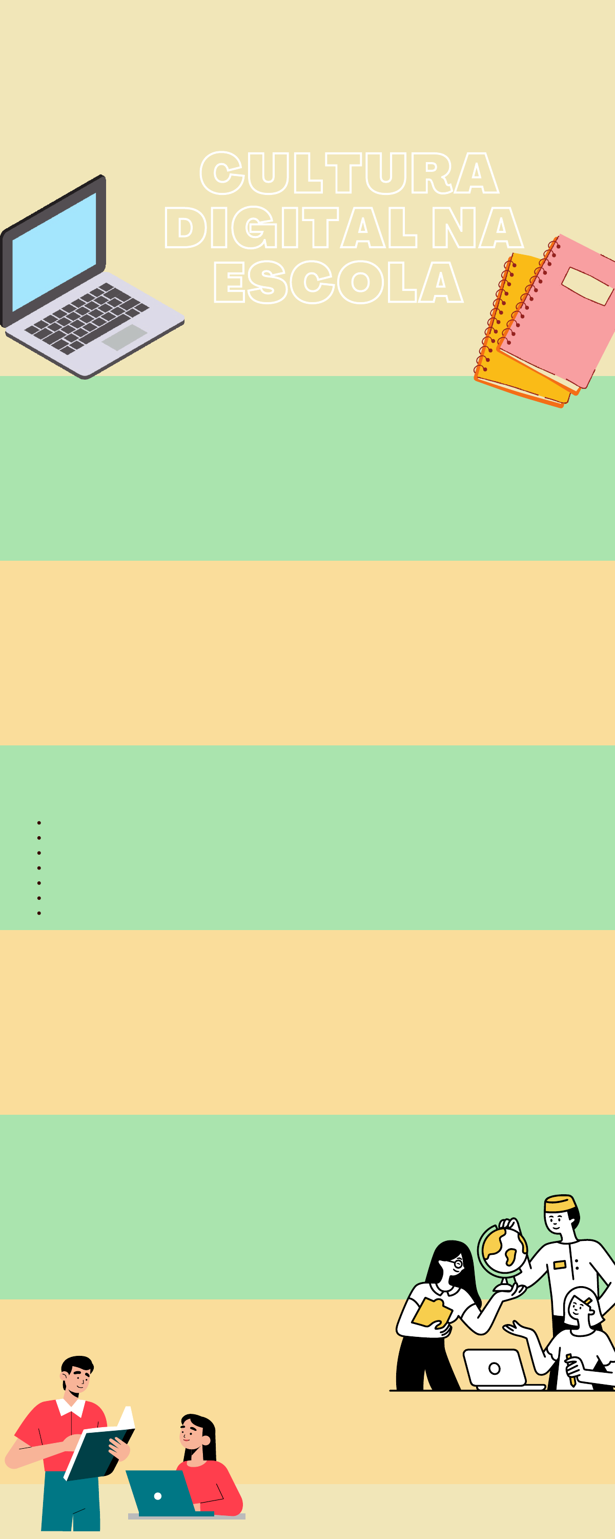 CULTURACULTURA DIGITAL NADIGITAL NA ESCOLAESCOLA O QUE É ? A cultura digital é o conjunto de práticas, costumes, comportamentos e interações que utilizam a tecnologia como um dos principais meios. FERRAMENTAS DA CULTURA DIGITAL NA EDUCAÇÃO : BNCC REFERÊNCIAS NA ESCOLA A cultura digitalé o conjunto de práticas, costumes, comportamentos e interações que utilizam a tecnologia como um dos principais meios. Ela, claro, é fundamental para a vivência e o desempenho estudantil, profissional, pessoal e social. Internet; Computadores; Celulares; Tablets; Webcams; Sites; Etc. Mobilizar práticas de linguagem no universo digital, considerando as dimensões técnicas, críticas,criativas,éticas e estéticas, para produzir sentidos, de engajar-se em práticas autorais e coletivas, e de aprender e aprender nos campos de ciência,cultura,trabalho,informação e vida pessoal. https://educadordofuturo.com.br/tecnologia-na-educacao/cultura- digital-na-escola/ http://www.abed.org.br/congresso202v0/anais/trabalhos/53530.pdf