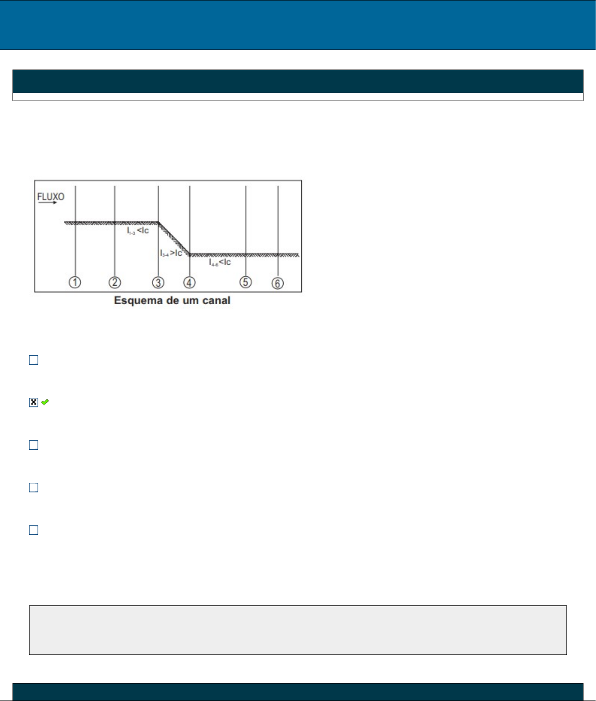 Disc.: ENGENHARIA HIDRÁULICA 202008614279 1a Questão Acerto: 1,0 / 1,0 (INEA - Engenheiro Hidráulico - 2008) Considerando que a seção do canal mostrado na figura é constante, que os trechos 1-3 e 4-6 têm a mesma declividade (I) e que na seção 2 e na seção 5 ocorrem alturas normais (hn ), que tipo de escoamento ocorre em cada trecho (2-3; 3-4 e 4-5) da linha de água para a figura, sabendo-se que Ic indica a declividade crítica para o escoamento? Fonte: Autor. Regime rápido, ressalto hidráulico e regime lento. Ressalto lento, regimento rápido e ressalto hidráulico. Regime rápido, regimento lento e ressalto hidráulico. Ressalto lento, ressalto hidráulico regime lento. Ressalto hidráulico, regimento lento e regime rápido. Respondido em 10/05/2023 20:01:04 Explicação: A resposta certa é: Ressalto lento, regimento rápido e ressalto hidráulico. 2a Questão Acerto: 1,0 / 1,0 (INEA - Engenheiro Hidráulico − 2008) Alterando-se a declividade de um canal (I), qual será a influência na altura de água no interior do canal (h)? (Suponha que o escoamento ocorra em regime permanente e uniforme, que v é velocidade no interior do canal e que As é a área molhada no canal.) Se I ↑ v ↑ As↓h ↓ Se I ↑ v ↓ As↓h ↑ Se I ↑ v ↑ As↑h ↓ Se I ↑ v ↑ As ↑h ↑ Se I ↑ v ↓ As↓h ↓ Respondido em 10/05/2023 20:32:42 Explicação: A resposta certa é: Se I ↑ v ↑ As↓h ↓ 3a Questão Acerto: 0,0 / 1,0 (CEDAE - Engenheiro Civil - 2009) Em um sistema de abastecimento de água, a perda de carga por atrito nos condutos é determinada, em geral, por meio de fórmulas empíricas, que foram obtidas para condições experimentais específicas. De acordo com a fórmula de Hazen-Williams, as perdas de carga são tão maiores quanto: Maior for o diâmetro do tubo, menor for a vazão de escoamento e menor for o coeficiente de rugosidade. Menor for o diâmetro do tubo, maior for a vazão de escoamento e maior for o coeficiente de rugosidade. Maior for o diâmetro do tubo, maior for a vazão de escoamento e maior for o coeficiente de rugosidade. Menor for o diâmetro do tubo, maior for a vazão de escoamento e menor for o coeficiente de rugosidade. Menor for o diâmetro do tubo, menor for a vazão de escoamento e maior for o coeficiente de rugosidade. Respondido em 10/05/2023 20:33:54 Explicação: A resposta certa é: Menor for o diâmetro do tubo, maior for a vazão de escoamento e menor for o coeficiente de rugosidade. 4a Questão Acerto: 1,0 / 1,0 Calcule a vazão total de uma rede de distribuição para um bairro com 8.000 habitantes, considerando consumo per capita de 160L/hab.dia, 18 horas de funcionamento diário e coeficiente de dia e hora de maior consumo de 1,25 e 1,50, respectivamente. 20L/s 37L/s 25L/s 30L/s 28L/s Respondido em 10/05/2023 19:52:27 Explicação: A resposta certa é: 37L/s 5a Questão Acerto: 1,0 / 1,0 A respeito da classificação dos vertedouros, assinale a alternativa correta. I - Podem ser delgados se a espessura da parede for inferior a 2/3 da carga e espessa, caso ocorra o contrário. II - Podem ser de descarga livre ou submersa, sendo o segundo constituído por um nível de água de saída superior ao da soleira. III - Pode ser sem contrações laterais, se a largura da soleira for igual à largura do canal de chegada, e com contrações de laterais, se a largura da soleira foi superior à largura do canal de chegada. Somente a II é verdadeira. Somente a I é verdadeira. Somente I e II são verdadeiras. Todas as afirmativas estão corretas. Somente II e III são verdadeiras. Respondido em 10/05/2023 20:43:20 Explicação: A resposta certa é: Somente I e II são verdadeiras. 6a Questão Acerto: 1,0 / 1,0 Determine a perda e carga de um orifício de diâmetro de 10 cm, descarga de 3,8 m/s e carga de 3,6 m. 2,04 m 2,86 m 1,38 m 1,57 m 1,15 m Respondido em 10/05/2023 20:43:54 Explicação: A resposta certa é: 2,86 m 7a Questão Acerto: 1,0 / 1,0 As curvas de carga versus vazão de duas tubulações (1 e 2) ramificadas logo após ao bocal de recalque de uma bomba são exibidas na figura posterior, incluindo a curva obtida pela soma das vazões para cada carga (1+2). Fonte: Gabriel de Carvalho Nascimento e Elson Antonio do Nascimento Qual é a diferença entre a vazão bombeada para as duas tubulações e a vazão operada quando um registro, localizado no início da tubulação 2, está fechado? 1,50 m³/s 0,53 m³/s 1,05 m³/s 0,34 m³/s 0,20 m³/s Respondido em 10/05/2023 20:44:30 Explicação: A resposta certa é: 0,34 m³/s 8a Questão Acerto: 0,0 / 1,0 [Itaipu - Engenheiro pleno, 2008] ''Escorvar uma bomba de fluxo'' significa: limpar as paredes internas da carcaça. limpar o rotor da bomba. remover todo o ar da tubulação de sucção e da carcaça, enchendo-a com líquido. limpar o crivo e a válvula de pé. remover todo o ar da tubulação de recalque quando houver válvula de retenção na saída da bomba. Respondido em 10/05/2023 20:44:47 Explicação: A resposta certa é: remover todo o ar da tubulação de sucção e da carcaça, enchendo-a com líquido. 9a Questão Acerto: 1,0 / 1,0 Uma onda é formada em águas profundas com altura de 2,0 m e período de 10 s. Qual será a altura dessa onda quando chegar próximo da praia, onde a profundidade é de 1,6 m? 2,4 m 2,2 m 2,8 m 3,0 m 2,6 m Respondido em 10/05/2023 20:02:52 Explicação: A resposta certa é: 2,8 m 10a Questão Acerto: 1,0 / 1,0 Qual das ondas a seguir é caracterizada por água de profundidade intermediária entre profunda e rasa? d= 1 m e L = 20 m d = 0,5 m; c = 2,16 m/s e T = 3,7 s d = 1 m; c = 3,12 m/s e T = 19,2 s d=500 m; c = 8,8 m/s e T = 5,7 s d=1000 m e L = 50 m Respondido em 10/05/2023 20:45:30 Explicação: A resposta certa é: d = 0,5 m; c = 2,16 m/s e T = 3,7 s