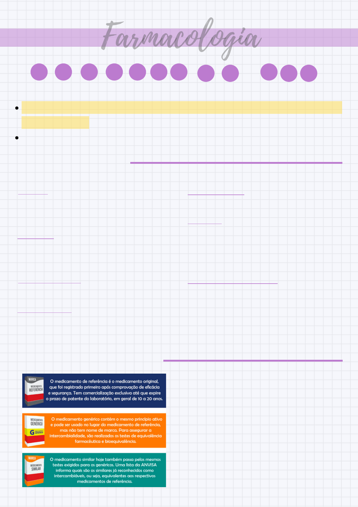 DROGA: é toda substância, exceto alimentos, capaz de produzir efeitos no organismo. Fármaco = Droga. REMÉDIO: tudo que causa alívio. Desde substâncias até mesmo procedimentos como, ginástica e acupuntura. PRINCÍPIO ATIVO: responsável pela ação / efeito farmacológico. FARMACOPÉIA: oficializa os procedimentos farmacêuticos, contém os parâmetros e métodos de qualidade. MEDICAMENTO: tudo que se usa para tratar (terapeuticamente). PLACEBO: algo que não possui efeito farmacológico mas, sim um efeito psicológico (paciente acha que o que esta usando esta causando melhora quando na verdade não esta). FORMA FARMACÊUTICA: forma em que o medicamento se apresenta. Ex: comprimidos, xaropes e aerossóis (explicado mais detalhadamente logo a frente). FarmacologiaFarmacologia C O N T E Ú D O S - N P 1 É a ciência que estuda como as substâncias químicas de propriedades medicinais interagem com os sistemas biológicos. Se avalia as características físico-química dos fármacos - polaridade e liposolubilidade. conceitos básicos tipos de medicamentos PORQUE OS MEDICAMENTIS GENÉRIICOS SÃO MAIS BARATOS? Porque os fabricantes copiam um determinado medicamento - não necessitam fazer investimentos em pesquisas. Além disso, não há necessidade de fazer propagandas, pois não têm marca a ser divulgada. NATURAIS: extraídos de órgãos ou glândulas (extrato de fígado); extraídos de fonte de minério e princípios ativos de diversas plantas. SINTÉTICOS: substâncias preparadas em laboratórios por processos químicos. Têm composição e ação idênticas aos produtos naturais. BIOIDÊNTICOS: possuem estrutura molecular exatamente igual ás do corpo, obtidos através de engenharia genética recombinantes, são manipulados especialmente para cada paciente. FITOTERÁPICO: produzidos através de vegetais ou plantas medicinais com alguma ação terapêutica. É a quantidade que se administra do medicamento, ou seja, a dose que dará resultado. DOSE DE ATAQUE: é a dose capaz de elevar rapidamente a concentração de um fármaco na corrente sanguínea, para que se obtenha um resultado mais rápido. DOSE DE MANUTENÇÃO: é a dose administrada em intervalos regulares para se manter a concentração necessária de fármaco. DOSE MINÍMA: é a menor dose eficaz de um fármaco. DOSE MÁXIMA: é a dose máxima de um fármaco que pode ser administrada, sem se ter efeitos tóxicos. DOSE TÓXICA: dose acima da dose máxima, que se for administrada a um paciente onde já se observa efeitos tóxicos, se torna uma "overdose". doses conceitos básicos (2) POSOLOGIA: é o estudo das doses, ou seja, indica o número de vezes e a quantidade de medicamento que o paciente deverá utilizar a cada dia. PRÓ-DROGA: é um medicamento que, após a administração, é metabolizado (isto é, convertido dentro do corpo) em um fármaco farmacologicamente ativo. Em vez de administrar um medicamento diretamente, um pró - fármaco correspondente pode ser usado para melhorar a farmacocinética. Ex: REAÇÃO ADVERSA: qualquer resposta prejudicial ou indesejável e não intencional que ocorrem com medicamentos para profilaxia, diagnóstico, tratamento de doença ou modificação de funções fisiológicas. EFEITO COLATERAL: efeito diferente daquele considerado como principal por um fármaco. Nem sempre é um efeito ruim, por tanto, esse termo desse ser distinguido de efeito adverso, pois um fármaco pode causar outros efeitos benéficos além do principal. Ex: victoza, é usado para tratar diabetes tipo II, mas causa emagrecimento a natureza física dos fármacos Sólidos, líquidos, ou gasosos → Melhor via de administração. Carboidratos, proteínas, lipídios. Ácidos ou bases fracos → diferenças de pH nos diversos compartimentos do corpo podem alterar o grau de ionização desses fármacos. -Varia entre muito pequeno e muito grande (entre 100e 1.000 kDa). farmacotécnica A Farmacotécnica busca preparar, conservar, acondicionar e dispensar medicamentos, com dosagem exata e apresentados sob forma que facilite a sua administração. Além disso, visa o melhoramento das formas farmacêuticas existentes, por meio do estudo dos componentes das fórmulas e de novos processos de fabricação e conservação dos medicamentos, de modo a prolongar, na medida do possível, o seu período de utilização. formas farmacêuticas As vantagens das formas sólidas, em geral, são possuir sabor agradável, ou até mesmo não apresentar sabor. Uma desvantagem é que pode causar irritação na mucosa estomacal, de acordo com a quantidade administrada. CÁPSULA: armazena uma ou mais substâncias em recipientes de gelatina mole ou dura. Ex: advil. COMPRIMIDO: possui uma ou mais substâncias químicas na forma de pó ou grânulo. Podem ser subdivididos em: COMPRIMIDO DE REVESTIMENTO ENTÉRICO: são comprimidos envoltos por diferentes camadas de produtos que permitem que o princípio ativo passe pelo estômago e chegue no sítio de absorção, como por exemplo o intestino sem se desintegrar, permitindo que inicie sua ação no local certo. São usados inclusive em situações onde o medicamento pode danificar o tecido estomacal. Ex: omeprazol. COMPRIMIDO SUBLINGUAL: feitos exclusivamente para uso embaixo da língua, onde se dissolvem com auxílio da saliva e são absorvidos na própria boca. São usados em casos de medicamentos que, em contato com o líquido ácido do estômago são destruídos e perdem sua ação terapêutica e para aqueles que são pouco absorvidos pelo intestino. SÓLIDO COMPRIMIDO EFERVESCENTE: preparados com substâncias químicas associadas a alguns sais que liberam gases quando em contato com água. COMPRIMIDO MASTIGÁVEL: preparados para terem a sua desintegração facilitada pela mastigação. Ex: tylenol mastigável. COMPRIMIDO DE AÇÃO LENTA/PROLONGADA: possuem um envoltório que faz com que a liberação do princípio ativo seja controlado. Isso possibilita que os medicamentos administrados inteir