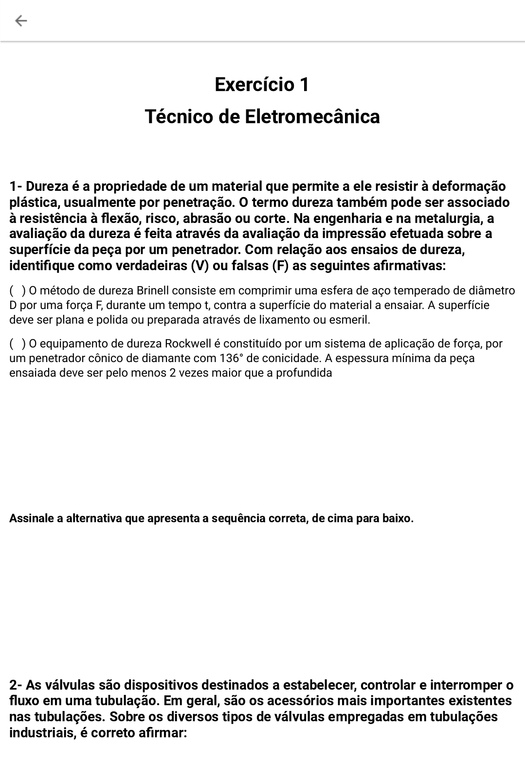 Exercício 1 Técnico de Eletromecânica 1- Dureza é a propriedade de um material que permite a ele resistir à deformação plástica, usualmente por penetração. O termo dureza também pode ser associado à resistência à flexão, risco, abrasão ou corte. Na engenharia e na metalurgia, a avaliação da dureza é feita através da avaliação da impressão efetuada sobre a superfície da peça por um penetrador. Com relação aos ensaios de dureza, identifique como verdadeiras (V) ou falsas (F) as seguintes afirmativas: ( ) O método de dureza Brinell consiste em comprimir uma esfera de aço temperado de diâmetro D por uma força F, durante um tempo t, contra a superfície do material a ensaiar. A superfície deve ser plana e polida ou preparada através de lixamento ou esmeril. ( ) O equipamento de dureza Rockwell é constituído por um sistema de aplicação de força, por um penetrador cônico de diamante com 136° de conicidade. A espessura mínima da peça ensaiada deve ser pelo menos 2 vezes maior que a profundidade da mossa provocada no ensaio. ( ) O equipamento para o ensaio de dureza Vickers é constituído por um sistema de aplicação de forças, um penetrador de diamante em forma de pirâmide, com ângulo entre faces de 120º, de base quadrada, e um sistema de medição por microscópio de grande ampliação, com um micrômetro acoplado. ( ) O indentador Knoop é um penetrador de diamante em forma piramidal que produz uma indentação com uma relação entre diagonais de 7:1. É o método mais empregado na medição de dureza de materiais poliméricos. Assinale a alternativa que apresenta a sequência correta, de cima para baixo. a) V – V – V – V. b) F – V – F – V. c) V – V – V – F. d) F – F – V – V. e) V – F – F – F. 2- As válvulas são dispositivos destinados a estabelecer, controlar e interromper o fluxo em uma tubulação. Em geral, são os acessórios mais importantes existentes nas tubulações. Sobre os diversos tipos de válvulas empregadas em tubulações industriais, é correto afirmar: Exercício 3.docx https://drive.google.com/?usp=docs_web a) As válvulas de bloqueio costumam ser sempre do mesmo diâmetro nominal da tubulação e têm uma abertura de passagem de fluido com seção comparável com a da própria tubulação. b) As válvulas de regulagem são aquelas destinadas especificamente para controlar o fluxo, não devendo, por isso, trabalhar em posição de fechamento parcial. c) As válvulas de borboleta e diafragma não podem trabalhar como válvulas de bloqueio. d) As válvulas de gaveta são bastante apropriadas para trabalho com líquidos com sedimentos sólidos ou em suspensão. e) As válvulas de globo causam, em qualquer posição, pequenas perdas de cargas, porém não apresentam boa vedação. 3- Para montar um lote de conjuntos mecânicos, um torneiro deve usinar eixos de aço ABNT1045. O diâmetro do eixo é de 28 mm e seu comprimento igual a 65 mm. Consultando uma tabela de recomendações de rotação para essa situação, o torneiro verificou que a rotação especificada é de 300 rpm. Ainda, para atender a demanda da produção, o comprimento total do eixo deve ser usinado em 60 s. Com base nesses dados, assinale a alternativa que apresenta a velocidade de corte e o avanço por rotação, respectivamente. a) 13 m/min e 0,18 mm/rot. b) 18 m/min e 0,27 mm/rot. c) 26 m/min e 0,22 mm/rot. d) 39 m/min e 0,14 mm/rot. e) 53 m/min e 0,14 mm/rot. 4- Quando um eixo gira dentro de um furo é produzido o atrito denominado de escorregamento. Para reduzir esse atrito, uma das melhores alternativas é o uso dos mancais de rolamento (ou simplesmente rolamentos), que são elementos de máquinas que permitem o movimento relativo controlado entre duas ou mais partes. Eles limitam as perdas de energia produzidas pelo atrito. Em relação aos principais tipos, é INCORRETO afirmar que os rolamentos: a) de contato angular permitem cargas combinadas, com a parcela de carga axial num único sentido, motivo pelo qual são normalmente utilizados aos pares. b) axiais de esferas de escora simples não suportam cargas axiais, suportam altas rotações e exigem um bom posicionamento do eixo. c) de agulhas são empregados onde há restrições de dimensões no sentido radial, cargas bruscas e baixas rotações. d) de rolos cilíndricos são empregados em aplicações com grandes cargas radiais e nenhuma carga axial. e) de rolos cônicos permitem grandes cargas axiais, são desmontáveis e normalmente utilizados aos pares. A inclinação do rolo pode ser uma restrição ao carregamento. Exercício 3.docx https://drive.google.com/?usp=docs_web 5- Para atender uma determinada vazão necessária, com uma altura manométrica H, uma estação de fornecimento de água fez a instalação de três bombas centrífugas associadas em paralelo, sendo as que as bombas 2 e 3 são iguais. As curvas H x Q ao lado representam o resultado dessa associação (H = altura manométrica total e Q = vazão). Se a perda de carga do sistema não for considerada, qual deve ser, em metros cúbicos por hora, a vazão total do conjunto para a altura manométrica? a) 12. b) 24. c) 36. d) 48. e) 60. 6- As descontinuidades presentes quando se efetua a soldagem de metais podem afetar severamente o componente, levando a falhas que podem ocasionar a perda desse componente ou até graves acidentes. Os ensaios não destrutivos, empregados em elementos soldados, têm a finalidade de identificar essas descontinuidades para que, posteriormente, ações corretivas possam ser tomadas. O ensaio de líquido penetrante é um exemplo muito empregado em peças soldadas e por meio dele é possível detectar as seguintes falhas ou propriedades no metal analisado: a) microtrincas e zona termicamente afetada. b) trincas superficiais e tamanho do grão. c) inclusões de escória e trincas superficiais. d) trincas e porosidades superficiais. e) segregações e inclusões. 7- Leia o texto a