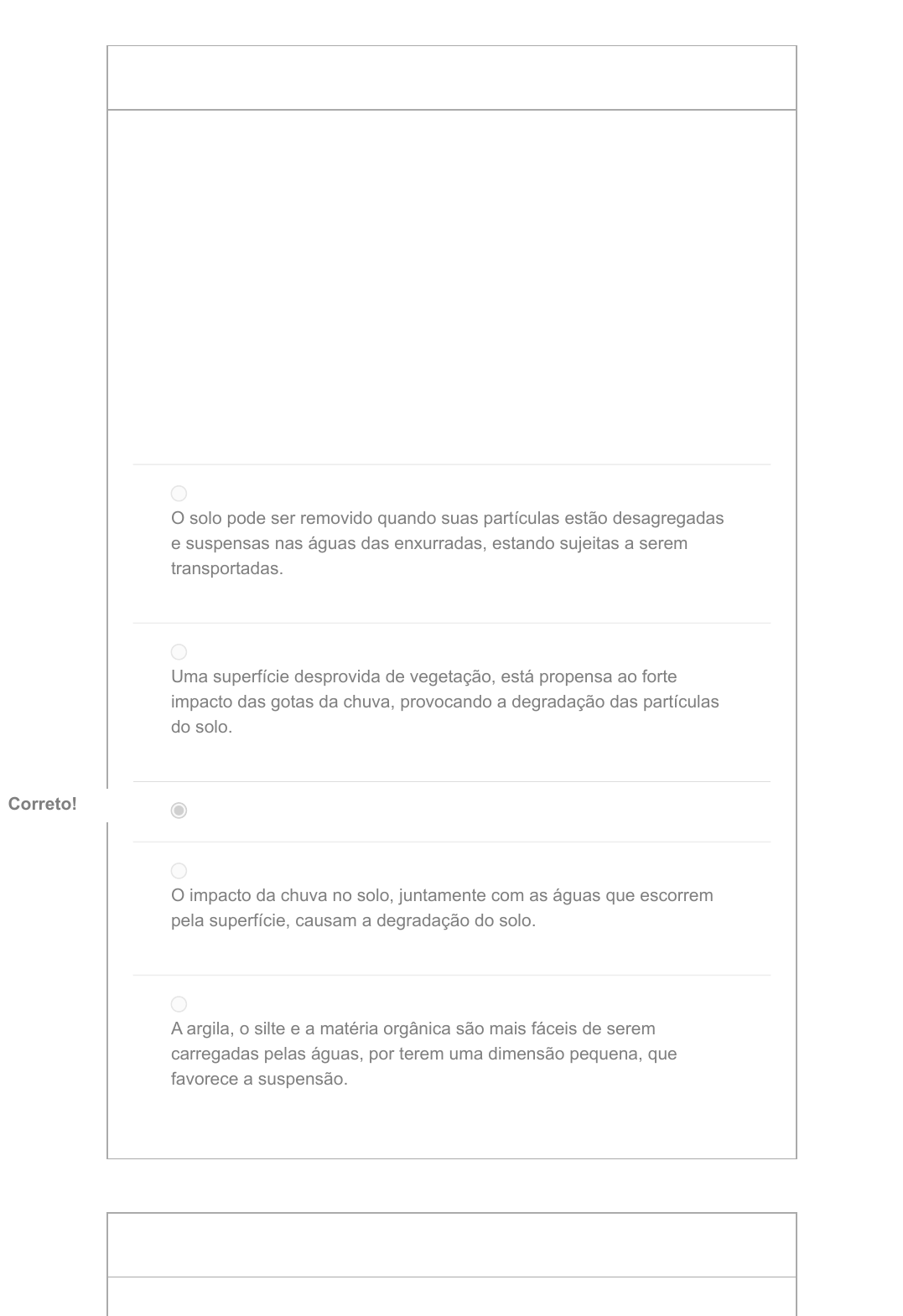 Esta tentativa levou Menos de 1 minuto. 0,1 / 0,1 ptsPergunta 1 A erosão dos solos é algo que preocupa os agricultores, políticos e cientistas, e em muitos casos, a ação antrópica é a causa principal, por meio do desmatamento, das queimadas, plantio inadequado, entre outros. Isso representa grande prejuízo ecológico e econômico. No Brasil, a erosão hídrica é mais forte do que a causada pelo vento, e possui duas fases distintas: degradação e transporte. Considerando essas informações, assinale a alternativa incorreta sobre a erosão hídrica. O solo pode ser removido quando suas partículas estão desagregadas e suspensas nas águas das enxurradas, estando sujeitas a serem transportadas. Uma superfície desprovida de vegetação, está propensa ao forte impacto das gotas da chuva, provocando a degradação das partículas do solo. A energia da enxurrada é muito maior que a das gotas de chuva. Correto!Correto! O impacto da chuva no solo, juntamente com as águas que escorrem pela superfície, causam a degradação do solo. A argila, o silte e a matéria orgânica são mais fáceis de serem carregadas pelas águas, por terem uma dimensão pequena, que favorece a suspensão. 0,1 / 0,1 ptsPergunta 2 O processo de erosão envolve o desgaste das partículas do solo, o transporte e a deposição das partículas. Algumas tarefas de exploração do solo podem acelerar o processo erosivo, como a aração, queimadas intensas, pastagens, o pisoteio pelo gado, entre outras. Mas, deve-se considerar também, os processos relacionados à erosão hídrica, que é de fato a que mais causa impacto no solo brasileiro, por ser de difícil percepção, quando laminar. Nesse sentido, qual das alternativas abaixo indica uma ação de controle relacionada ao tipo de erosão laminar? Fornecimento de serviços de crédito rural para agricultores dispostos a preservar o meio ambiente. Controle do manejo da cobertura do solo, com a escolha de períodos certos para plantio, além do plantio em nível e a construção de terraços. Correto!Correto! Na pecuária, evitando que os animais caminhem repetidamente em uma mesma direção muito inclinada. Incentivo ao reflorestamento, pois as copas das arvores absorvem a maior parte da energia cinética das gotas de chuva, além disso, as folhas sobre o solo amortecem a intensidade do impacto das copas até a superfície. O incentivo aos agricultores para proteção ambiental com técnicas de conservação do solo em lavouras, pastagens e reflorestamentos. 0,1 / 0,1 ptsPergunta 3 A erosão tem efeitos na produtividade agrícola e consequências ambientais. O transporte de terra ocorre pelas enxurradas, poluindo as águas, os reservatórios, e os cursos de água, colocando em risco a saúde humana, animal e a fauna aquática. Nesse sentido, existe a estimativa da quantidade de solo que pode ser perdido pela erosão. Considerando essas informações, assinale a alternativa que indica para quais fins é utilizado o cálculo de tolerância de perda do solo. Objetiva uma ação de coleta e processamento de resíduos do solo, que possam ser reaproveitados. Para a conservação do solo e adoção de manejo que possa prever os impactos antes da prática agrícola ser implantada. Correto!Correto! Para combater as mudanças climáticas. Evitar a ação da erosão eólica. Diz respeito ao cálculo da energia cinética, que é proporcional ao peso do que está se movendo. 0,1 / 0,1 ptsPergunta 4 Qual das alternativas não representa uma ação da vegetação no fator de uso e manejo? A redução da velocidade das enxurradas pelas plantas e seus resíduos. As copas das árvores retêm a energia das gotas da chuva pela retenção. O grau de inclinação do solo influencia na quantidade e velocidade da enxurrada. Correto!Correto! A taxa inicial de infiltração é aumentada pela absorção da água, quando as plantas secam a parte superficial do solo. A estabilidade é aumentada pelas raízes das plantas e a atividade biológica. Pontuação do teste: 0,4 de 0,4