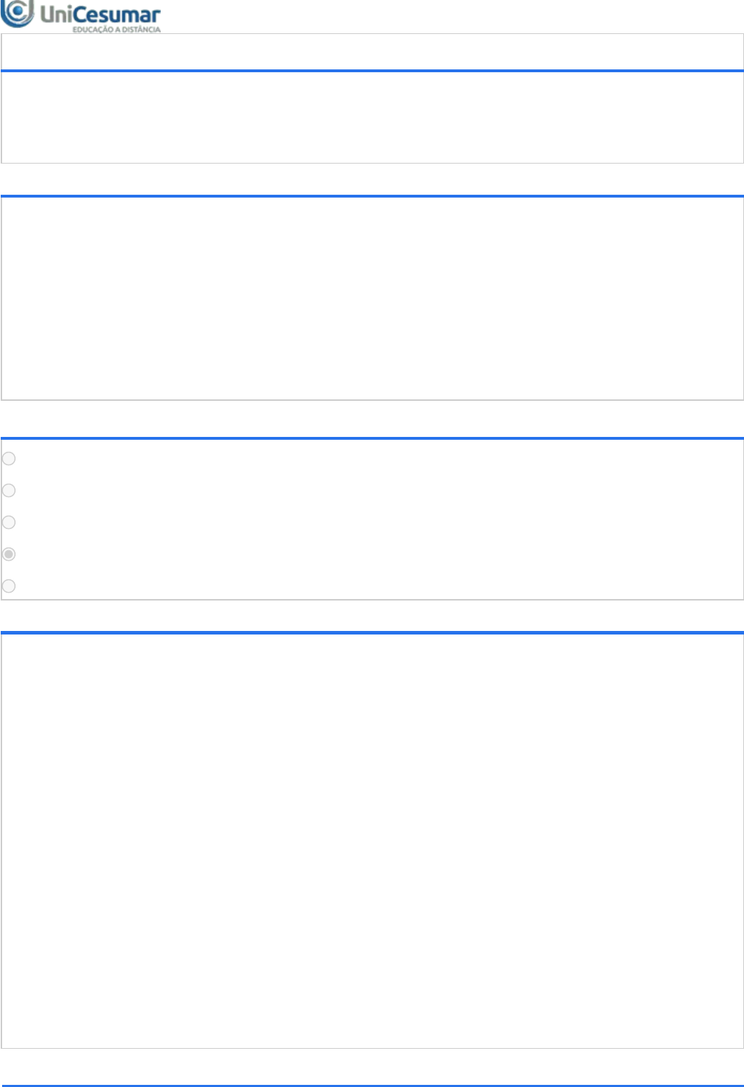 11/05/2023, 20:02 Unicesumar - Ensino a Distância about:blank 1/8 ATIVIDADE 3 - RH - CONCEITOS DA ADMINISTRAÇÃO E ÉTICA EMPRESARIAL - 51/2023 Período:06/03/2023 08:00 a 24/03/2023 23:59 (Horário de Brasília) Status:ENCERRADO Nota máxima:0,50 Gabarito:Gabarito será liberado no dia 25/03/2023 00:00 (Horário de Brasília) Nota obtida:0,45 1ª QUESTÃO A empresa Faz Bem Ltda possui em sua administração uma gestão que reduz os conflitos por meio da cooperação entre os seus colaboradores, gerando assim uma satisfação maior entre eles. Além disso, desde a sua fundação os diretores da Faz Bem Ltda mantém uma cultura democrática, obtendo um equilíbrio entre os interesses dos envolvidos na organização. O caso hipotético relata a administração da empresa Faz Bem Ltda., nessa administração é possível interpretar e classificar em uma das perspectivas modernas da administração, assinale a alternativa que indica essa perspectiva. ALTERNATIVAS Teoria de sistemas. Teoria contingencial. Teoria da administração estratégica. Teoria da administração participativa. Teoria da administração por objetivos. 2ª QUESTÃO Lidamos com estratégia, planejamento estratégico e, consequentemente, administração estratégica todos os dias, em nossa vida pessoal e profissional. As organizações também utilizam esses conceitos diariamente, os quais, diferentemente do que parecem, não são complexos. Fonte: SERTEK, P. et. al. Administração e planejamento estratégico. Curitiba: InterSaberes, 2012. p. 112. Imagine que você acaba de assumir a posição de gestor administrativo em uma determinada empresa e uma de suas primeiras ações é voltada para desenvolver um planejamento estratégico. Portanto, avalie as afirmativas que são condizentes com sua primeira ação. I. Definir e propor objetivos e metas para a empresa. II. Elaborar e desenvolver a missão, visão e valores do negócio. III. Utilizar os pontos fortes da empresa em favor do negócio e eliminar as oportunidades. IV. Elaborar uma documentação que consta o planejamento estratégico e os rumos da empresa. É correto o que se afirma em: ALTERNATIVAS 11/05/2023, 20:02 Unicesumar - Ensino a Distância about:blank 2/8 I e II, apenas. I e III, apenas. I, II e IV, apenas. II, III e IV, apenas. I, II, III e IV. 3ª QUESTÃO 11/05/2023, 20:02 Unicesumar - Ensino a Distância about:blank 3/8 Um dos grandes desafios éticos neste milênio é a Ética em Tecnologia da Informação. O contexto histórico de desenvolvimento da nossa civilização nos mostra, desde a invenção da roda até as disruptivas tecnologias que exsurgem a cada momento, que as regulamentações legislativas são fundamentais para a organização da sociedade. Assim, frente à regulação da matéria em outros países, aliado a entrada em vigor do GDPR na União Europeia e, ainda, aos recentes casos de vazamentos de dados como, por exemplo, o da Cambridge Analytics, e aos abusos de redes sociais, foi editada a MP 869/18, posteriormente convertida na Lei Geral de Proteção de Dados (lei 13.709 de 14 de agosto de 2019), cuja vigência se deu a partir de 20 de agosto de 2020. Percebe-se a importância da proteção dos direitos à privacidade e inviolabilidade dos dados dos usuários, o que aliado ao uso das novas tecnologias com ética é o que caracteriza a base principiológica do novo diploma legal (LGPD). Os dados levantados pela ONG Safernet, que monitora violações de direitos humanos na internet, mostram que o período entre março e julho de 2020, foi marcado por um aumento astronômico de crimes online. Ao mesmo tempo, as ações das redes sociais para remover esse tipo de postagem não cresceram no mesmo ritmo, conforme indicam os gráficos a seguir. Disponível em: <https://bit.ly/3rOBtCG>. Acesso em: 14 dez. 2020. Com base nas informações apresentadas, avalie as asserções seguintes e a relação proposta entre elas I. É essencial a regulamentação clara que assegure a eticidade do uso de informações via correio eletrônico, como por exemplo: enviar bobagens a todo tempo ao seu colega, espalhar piadas, correntes ou boatos, comentários negativos sobre colegas e chefias, conteúdo pornográfico, racista ou discriminatório, grosserias, descortesia e indiscrição, e o anonimato favorece a irresponsabilidade dos que adotam tais ações. 11/05/2023, 20:02 Unicesumar - Ensino a Distância about:blank 4/8 PORQUE II. Não se estabelece a ética corporativa simplesmente por meio de códigos, mas sim da conscientização de valores, corporificados em diretrizes éticas, que traduzem cultura, estilos de liderança, como suportes do Modelo Ético de Gestão, que envolvam a gestão de ética, administrável. A respeito dessas asserções, assinale a opção correta. ALTERNATIVAS As asserções I e II são proposições verdadeiras, mas a II não é uma justificativa correta da I. As asserções I e II são proposições verdadeiras, e a II é uma justificativa correta da I. A asserção I é uma proposição verdadeira, e a II é uma proposição falsa. A asserção I é uma proposição falsa, e a II é uma proposição verdadeira. As asserções I e II são proposições falsas. 4ª QUESTÃO Obviamente, quanto mais atividades forem avaliadas, maior a garantia de que os objetivos organizacionais serão alcançados; no entanto, o controle excessivo pode implicar desperdício de recursos e provocar um clima organizacional negativo. As atividades cujos desempenhos devem ser mensurados deverão ser priorizadas em função da importância de sua contribuição para o alcance dos objetivos, de forma que o empenho para controlá-las possa ser balanceado. Fonte: SOBRAL, F.; PECI, A. Administração: teoria e prática no contexto brasileiro. 2. ed. São Paulo: Pearson Education do Brasil, 2013. p. 367. Partindo do fragmento apresentado, avalie as asserções, a seguir, e a relação proposta entre elas. I. Os objetivos organizacionais são alcançados 