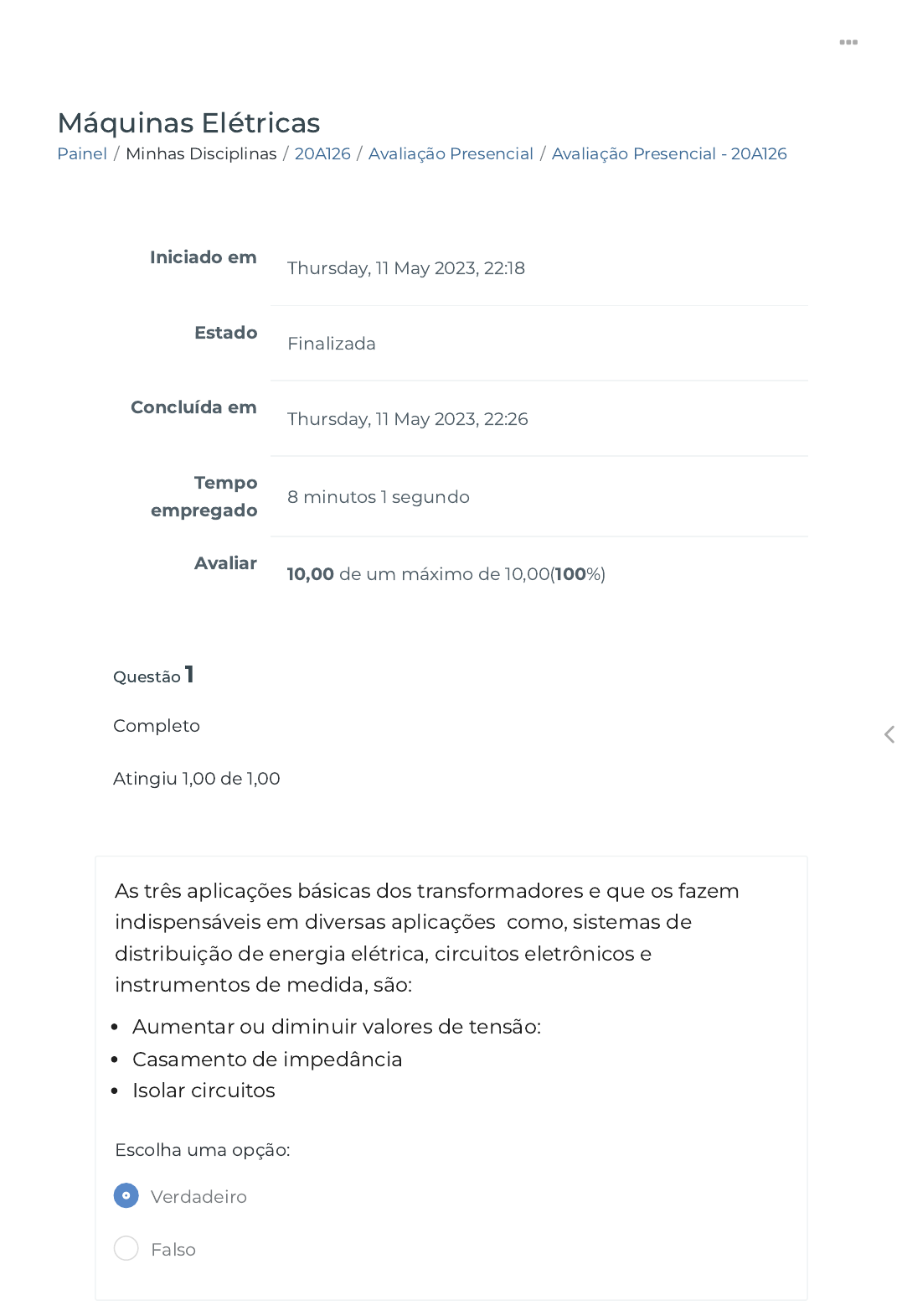 Painel / Minhas Disciplinas / 20A126 / Avaliação Presencial / Avaliação Presencial - 20A126 Máquinas Elétricas Iniciado em Thursday, 11 May 2023, 22:18 Estado Finalizada Concluída em Thursday, 11 May 2023, 22:26 Tempo empregado 8 minutos 1 segundo Avaliar 10,00 de um máximo de 10,00(100%) Questão 1 Completo Atingiu 1,00 de 1,00 As três aplicações básicas dos transformadores e que os fazem indispensáveis em diversas aplicações como, sistemas de distribuição de energia elétrica, circuitos eletrônicos e instrumentos de medida, são: Aumentar ou diminuir valores de tensão: Casamento de impedância Isolar circuitos Escolha uma opção: Verdadeiro Falso https://ava.politecnicabr.com.br/my/ https://ava.politecnicabr.com.br/course/view.php?id=963 https://ava.politecnicabr.com.br/course/view.php?id=963#section-11 https://ava.politecnicabr.com.br/mod/quiz/view.php?id=32521 https://ava.politecnicabr.com.br/ Questão 2 Completo Atingiu 1,00 de 1,00 A máquina de corrente contínua foi, durante muito tempo, a solução mais natural para problemas em que era imprescindível variar a velocidade durante o funcionamento, devido a simplicidade para variar a velocidade com este tipo de máquina, que pode ser obtida variando a tensão de alimentação contínua ou variando a intensidade do campo magnético. Escolha uma opção: Questão 3 Completo Atingiu 1,00 de 1,00 Em uma indústria, uma máquina síncrona é instalada para melhorar o fator de potência da instalação. Sabendo que nessa indústria, existem 800kVA de motores de indução, com fator de potência igual a 0,82 em atraso. A potência para a máquina síncrona a ser instalada é 500kVA, com fator de potência unitário. Qual o fator de potência da indústria após a instalação da máquina síncrona? (considerar duas casas decimais) Resposta: 0,93 Verdadeiro Falso https://ava.politecnicabr.com.br/ Questão 4 Completo Atingiu 1,00 de 1,00 O Servomotor é uma máquina, eletromecânica, que apresenta movimento proporcional a um comando, como dispositivos de malha fechada, ou seja: recebem um sinal de controle; que veri�ca a posição atual para controlar o seu movimento indo para a posição desejada com velocidade monitorada externamente sob feedback de um dispositivo denominado taco ou sensor de efeito Hall ou encoder ou resolver, ou tachsin, dependendo do tipo de servomotor e aplicação. Escolha uma opção: Verdadeiro Falso servoconversor servoacionamento fonte primária melhorar o motor https://ava.politecnicabr.com.br/ Questão 5 Completo Atingiu 1,00 de 1,00 Considere uma máquina síncrona de 4 pólos sendo acionada a 1800 rpm por uma máquina motriz. Se o número de espiras de um enrolamento da máquina for igual a 250, o fator de enrolamento igual a 0,9 e o �uxo pó pólo igual a 10-3 Wb, qual a tensão gerada nesse enrolamento em V? (considerar duas casas decimais) Resposta: 59,94 Questão 6 Completo Atingiu 1,00 de 1,00 O servomotor é projetado para funcionar aliado a um , formando um conjunto conhecido por , capaz de seguir �elmente uma referência de torque, velocidade ou posição. https://ava.politecnicabr.com.br/ Questão 7 Completo Atingiu 1,00 de 1,00 Seja considerado um transformador monofásico, ideal, cuja potência seja de 1000VA, tensão do seu circuito primário de 220Volts e a do seus circuito secundário de 110Volts, determine sua relação de transformação; Escolha uma opção: Questão 8 Completo Atingiu 1,00 de 1,00 Em uma máquina monofásica, um enrolamento auxiliar com uma reatância maior que o enrolamento principal é inserido em paralelo com o enrolamento principal somente durante a partida do motor. Quando o rotor atinge 75% da velocidade síncrona, uma chave centrífuga retira o enrolamento auxiliar do circuito, permanecendo apenas o enrolamento principal. Escolha uma opção: 3 2 4 Verdadeiro Falso https://ava.politecnicabr.com.br/ Questão 9 Completo Atingiu 1,00 de 1,00 Um motor derivação 50cv, 250V é conectado a uma fonte de alimentação de 230V e fornece potência à carga drenando uma corrente igual a 200 A e girando a uma velocidade igual a 1200 rpm. A resistência de armadura é igual a 0,2 Ω e a resistência de campo é de 115 Ω. Determine a tensão gerada: Escolha uma opção: Questão 10 Completo Atingiu 1,00 de 1,00 Um motor de indução trifásico gira em vazio a 1188 rpm, quando alimentado por um sistema trifásico cuja freqüência é igual a 60 Hz. Quantos pólos possui este motor? Resposta: 6 190,4V 90,4V 19,4V 1904V https://ava.politecnicabr.com.br/ © 2022 - Escola Politécnica Brasileira Entre em Contato https://www.politecnicabr.com.br 0800 084 2627 0800 084 2627 Links Úteis Dicas da nossa Diretora Acadêmica Planner de Estudos Declaração de Matrícula Orientações do AVA Abertura de Ticket Fale com o Tutor Cronograma de Estudos Manual de Estágio Manual de Competência Siga-nos nas redes sociais https://ava.politecnicabr.com.br/mod/quiz/0 https://www.politecnicabr.com.br/ https://soundcloud.com/user-501638417/sets/escola-politecnica-brasileira https://storage.googleapis.com/sirius-pubstore/semestre_plannerdeestudo%20poli.pdf https://storage.googleapis.com/sirius-pubstore/declaracao_matricula.pdf https://storage.googleapis.com/sirius-pubstore/orientacoes_ava.pdf https://storage.googleapis.com/sirius-pubstore/abertura_ticket.pdf https://storage.googleapis.com/sirius-pubstore/fale_com_tutor.pdf https://storage.googleapis.com/sirius-pubstore/cronograma_estudos.pdf https://storage.googleapis.com/sirius-pubstore/manual_estagio.pdf https://storage.googleapis.com/sirius-pubstore/manual_competencia.pdf https://www.facebook.com/politecnicabr https://www.instagram.com/politecnicabr_oficial https://ava.politecnicabr.com.br/