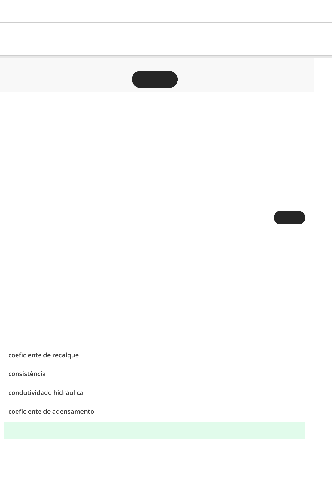 Marcos Antonio da Sil… Conteúdo do exercício Ocultar opções de resposta Avaliação On-Line 3 (AOL 3) - Questionário Pergunta 1 1 / 1 Carregamentos externos aplicados na superfície, ou mesmo a própria geometria da superfície da massa de solo, contribui para o desenvolvimento de tensões tangenciais ou de cisalhamento, que podem chegar a valores próximos da máxima tensão cisalhante que o solo suporte, podendo ocasionar a ruptura do material. A parcela de resistência ao cisalhamento de um solo, independente da tensão efetiva normal atuante, provocada pela atração físico-química entre partículas, recebe a denominação de: coeficiente de recalque consistência condutividade hidráulica coeficiente de adensamento Resposta corretacoesão Nota final Enviado em: 07/05/23 22:50 (BRT) 8/10 Ocultar opções de resposta Pergunta 2 1 / 1 A compactação pode ser entendida como ação mecânica por meio da qual se impõe ao solo uma redução do seu índice de vazios. Julgue os itens subsequentes, referentes a compactação de solos. I. A compactação confere maior densidade aos solos, diminuindo sua compressibilidade e aumentando a sua resistência ao cisalhamento. II. Os parâmetros de compactação dos solos, ou seja, teor de umidade ótima e massa específica seca máxima, dependem da energia de compactação adotada. Quanto maior a energia adotada, maiores valores para a massa específica seca máxima e menores valores para os teores de umidade ótima são encontrados. III. Para que um solo atinja as condições ideais de compactação, ou seja, teor de umidade ótimo e massa específica seca máxima, ele deve se encontrar na condição saturada. IV. O fenômeno do solo borrachudo pode ocorrer quando se tenta compactar um solo com umidade acima da ótima. É INCORRETO o que se afirma em Resposta corretaIII. IV. II. I. I, II, III e IV. Pergunta 3 1 / 1 Os materiais constituintes, para efeito de escavação e execução dos cortes, são classificados em categorias, caracterizadas em função da maior ou menor dificuldade ou resistência que oferecem ao desmonte. A necessidade de se classificarem os materiais de escavação em categorias provém do simples fato de que os mais resistentes, que oferecem maior dificuldade ao desmonte, demandam emprego de um maior número de horas de equipamento ou obrigam o seu uso de modo mais intensivo, gerando, obviamente, maiores custos de escavação. Departamento Nacional de Infraestrutura de Transportes. Diretoria Executiva. Instituto de Pesquisas Rodoviárias. Manual de Ocultar opções de resposta Ocultar opções de resposta implantação básica de rodovia. 3.ª ed. Rio de Janeiro, 2010. p. 253 e 271 (com adaptações). Considerando-se o texto apresentado, é correto afirmar que o material que apresenta maior custo para a realização de escavação de corte em rodovia é o de Resposta correta3.ª categoria. 4.ª categoria. 1.ª categoria. 2.ª categoria. 5.ª categoria. Pergunta 4 1 / 1 A resistência ao cisalhamento de um solo é dada pela seguinte expressão: τ = 2,5 + (0,5773)σ O ângulo de atrito interno desse solo vale: 0° 60° 15° Resposta correta30° 45° Pergunta 5 1 / 1 Ocultar opções de resposta Ocultar opções de resposta A respeito das etapas de construção de uma barragem, julgue os itens a seguir e use (V) para as assertivas verdadeiras e (F) para as falsas ( ) São vários os elementos encontrados em um conjunto de obras que compõe uma barragem. A obra construída com terra e blocos de rocha destinada a desviar as águas do leito do rio, total ou parcialmente, com o objetivo de permitir o tratamento das fundações nessas áreas e, às vezes, nas áreas das planícies de inundação, possibilitando a construção em seco, é a ensecadeira ( ) O desvio por túneis é recomendado para locais em que a topografia é de vales abertos. ( ) As estruturas do tipo ensecadeiras são recomendadas para topografias de vales estreitos e com rios encaixados. ( ) Galeria é um tipo de desvio que pode ser utilizado de modo isolado ou associado com estruturas permanentes da obra. A sequência correta é: F-F-V-F F-V-V-V V-V-V-F Resposta corretaV-F-F-V F-V-V-F Pergunta 6 0 / 1 Considerando os conceitos da Mecânica dos Solos, analise as assertivas abaixo: I. A resistência ao cisalhamento de um solo pode ser definida como a tensão de cisalhamento sobre o plano de ruptura, na ruptura. II. A resistência ao cisalhamento do solo se compõe, basicamente, de duas componentes: a coesão e o atrito entre as partículas. III. A estabilidade de taludes (aterros, cortes e barragens), empuxos de terra sobre paredes de contenção e túneis, capacidade de carga de sapatas e estacas não estão relacionadas à resistência ao cisalhamento do solo. Quais estão corretas? Incorreta: Apenas I e III Ocultar opções de resposta Apenas I. I, II e III. Apenas II e III Resposta corretaApenas I e II Pergunta 7 1 / 1 Sobre os materiais utilizados em barragens de terra, julgue os itens a seguir I. Na fase de pesquisa de jazidas de solos de boa qualidade, a obtenção de informações relativas à localização e prospecção preliminar das jazidas é suficiente para a realização dos estudos preliminares das escavações, bem como para a estimativa de seus custos, sendo, portanto, dispensável a utilização de mapas geológicos da região pesquisada. II. As jazidas de solo devem situar-se a distâncias inferiores a 2 km do local de implantação da barragem, e preferencialmente devem estar localizadas dentro da área de inundação, em regiões de topografia suave. III. Antes do início da execução de um aterro, durante a construção de um complexo de edifícios públicos, o fiscal da obra refez o levantamento topográfico e alguns ensaios no solo existente. Após o trabalho de campo, o engenheiro fiscal constatou que o nível real do terreno primitivo estava dois metros acima do previsto em projeto, e que a jazida de solo, prevista para fornecer 