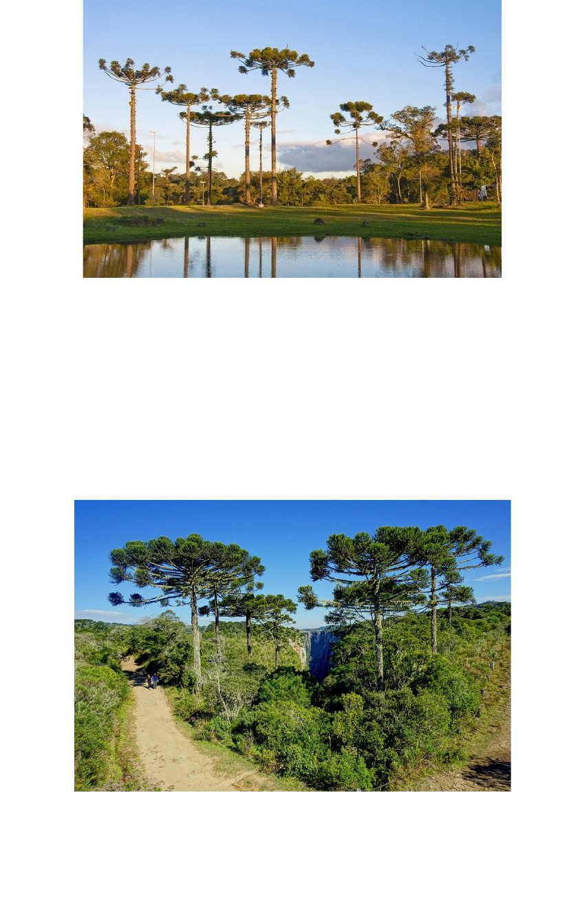 O que é o domínio das araucárias? O domínio morfoclimático das araucárias, também conhecida como Mata dos Pinhais é homogênea, aciculifoliada. A intensa ocupação agrária (café, soja) desse domínio foi a responsável pela devastação dessa floresta, encontrada desde o sul paulista até o norte gaúcho, o domínio das araucárias ocupa uma área de 400.000 km², abrangendo em seu território cidades importantes, como: Curitiba, Ponta Grossa, Lages, Caxias do Sul, Passo Fundo, Chapecó e Cascavel. Atualmente, a vegetação de araucária e chamada de pinheiro-do-Paraná, ou pinheiro-braseleiro pouco resta, as indústrias de celulose e madeireiras da região, fizeram um extrativismo descontrolado que resultou no desaparecimento total em algumas áreas. Sua condição de arbórea, geralmente com mais de 30 m de altura, condiz a um solo profundo, em virtude de suas raízes estabelecerem a sustentação da própria árvore. A região das araucárias encontra-se no planalto meridional onde a altitude pode variar de 500 metros até cerca de 1.200 m. Isso evidencia um clima subtropical em toda sua extensão que mantém uma boa relação com a precipitação existente nesse domínio, variando de 1.200 a 1.800 mm. Nesse sentido, a região identifica-se com uma grande rede de drenagem em toda a sua extensão territorial. O solo é formado principalmente por latossolos brunos e também é encontrado latossolos roxos, cambissolos, terras brunas e solos litólicos. Com estas características, o solo detém uma alta potencialidade agrícola, como: milho, feijão, batata etc. A ausência de estratégias de conservação, a intensa exploração comercial da madeira e as mudanças climáticas podem levar a Araucária à extinção até 2070. Essa é a conclusão de um estudo da Universidade de Reading, no Reino Unido. A espécie é a árvore-símbolo do Paraná.