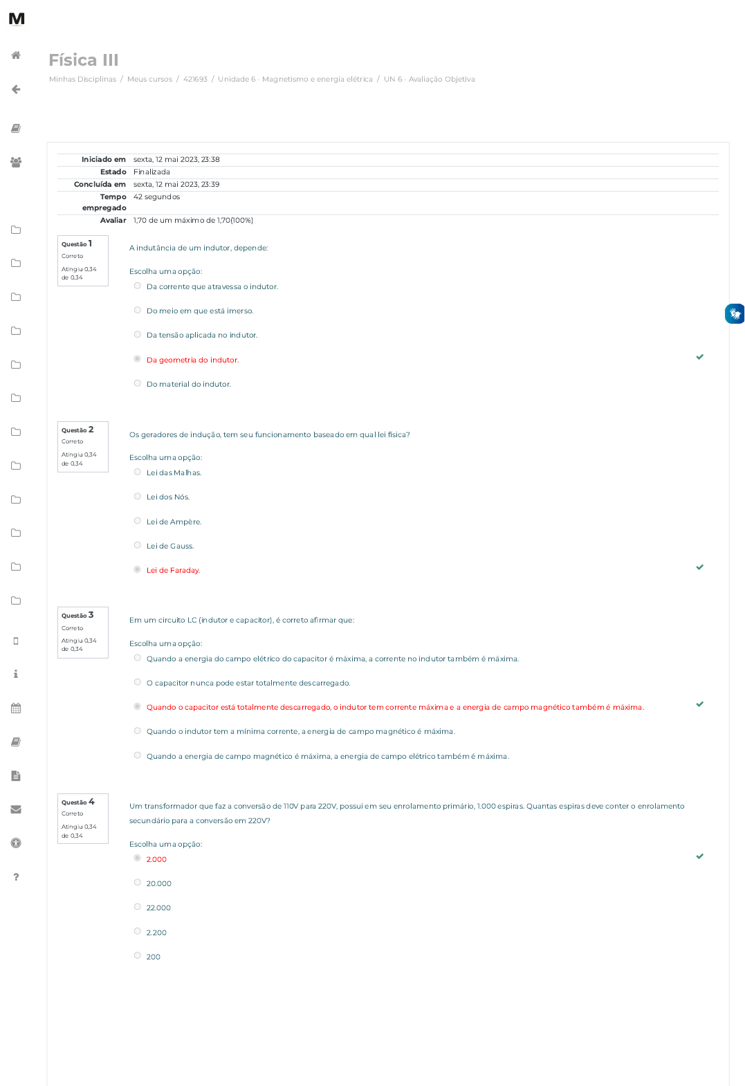 Minhas Disciplinas / Meus cursos / 421693 / Unidade 6 - Magnetismo e energia elétrica / UN 6 - Avaliação Objetiva Física III Questão 1 Correto Atingiu 0,34 de 0,34 Questão 2 Correto Atingiu 0,34 de 0,34 Questão 3 Correto Atingiu 0,34 de 0,34 Questão 4 Correto Atingiu 0,34 de 0,34 Iniciado em sexta, 12 mai 2023, 23:38 Estado Finalizada Concluída em sexta, 12 mai 2023, 23:39 Tempo empregado 42 segundos Avaliar 1,70 de um máximo de 1,70(100%) A indutância de um indutor, depende: Escolha uma opção: Da corrente que atravessa o indutor. Do meio em que está imerso. Da tensão aplicada no indutor. Da geometria do indutor. Do material do indutor. Os geradores de indução, tem seu funcionamento baseado em qual lei física? Escolha uma opção: Lei das Malhas. Lei dos Nós. Lei de Ampère. Lei de Gauss. Lei de Faraday. Em um circuito LC (indutor e capacitor), é correto a�rmar que: Escolha uma opção: Quando a energia do campo elétrico do capacitor é máxima, a corrente no indutor também é máxima. O capacitor nunca pode estar totalmente descarregado. Quando o capacitor está totalmente descarregado, o indutor tem corrente máxima e a energia de campo magnético também é máxima. Quando o indutor tem a mínima corrente, a energia de campo magnético é máxima. Quando a energia de campo magnético é máxima, a energia de campo elétrico também é máxima. Um transformador que faz a conversão de 110V para 220V, possui em seu enrolamento primário, 1.000 espiras. Quantas espiras deve conter o enrolamento secundário para a conversão em 220V? Escolha uma opção: 2.000 20.000 22.000 2.200 200 https://avap.multivix.edu.br/my/ https://avap.multivix.edu.br/course/view.php?id=20269 https://avap.multivix.edu.br/course/view.php?id=20269§ion=7 https://avap.multivix.edu.br/mod/quiz/view.php?id=1315196 https://avap.multivix.edu.br/my/ https://avap.multivix.edu.br/course/view.php?id=20269 https://avap.multivix.edu.br/user/index.php?id=20269 https://avap.multivix.edu.br/course/view.php?id=20269§ion=1 https://avap.multivix.edu.br/course/view.php?id=20269§ion=2 https://avap.multivix.edu.br/course/view.php?id=20269§ion=3 https://avap.multivix.edu.br/course/view.php?id=20269§ion=4 https://avap.multivix.edu.br/course/view.php?id=20269§ion=5 https://avap.multivix.edu.br/course/view.php?id=20269§ion=6 https://avap.multivix.edu.br/course/view.php?id=20269§ion=7 https://avap.multivix.edu.br/course/view.php?id=20269§ion=8 https://avap.multivix.edu.br/course/view.php?id=20269§ion=9 https://avap.multivix.edu.br/course/view.php?id=20269§ion=10 https://avap.multivix.edu.br/course/view.php?id=20269§ion=11 https://avap.multivix.edu.br/course/view.php?id=20269§ion=12 https://avap.multivix.edu.br/hooks/portal/ https://avap.multivix.edu.br/mod/page/view.php?id=1252%2F%22%20target%3D%22_blank https://avap.multivix.edu.br/calendar/view.php/ https://avap.multivix.edu.br/local/staticpage/view.php?page=biblioteca https://portalweb.multivix.edu.br/gabaritos/login.aspx https://multivix.edu.br/office-365/ https://multivix.edu.br/acessibilidade/ https://avap.multivix.edu.br/mod/page/view.php?id=7%2F%22%20target%3D%22_blank https://avap.multivix.edu.br/ Questão 5 Correto Atingiu 0,34 de 0,34 O �uxo magnético em uma bobina de 400 espiras é de 2x10 Wb. Sabendo que a corrente que circula na bobina é de 4mA, qual é a indutância do indutor? Escolha uma opção: 40mH 400mH 4mH 2mH 200mH -8 ◄ Conteúdo online Seguir para... Fale com o Tutor ► https://avap.multivix.edu.br/mod/scorm/view.php?id=1315195&forceview=1 https://avap.multivix.edu.br/mod/forum/view.php?id=1315197&forceview=1 https://avap.multivix.edu.br/