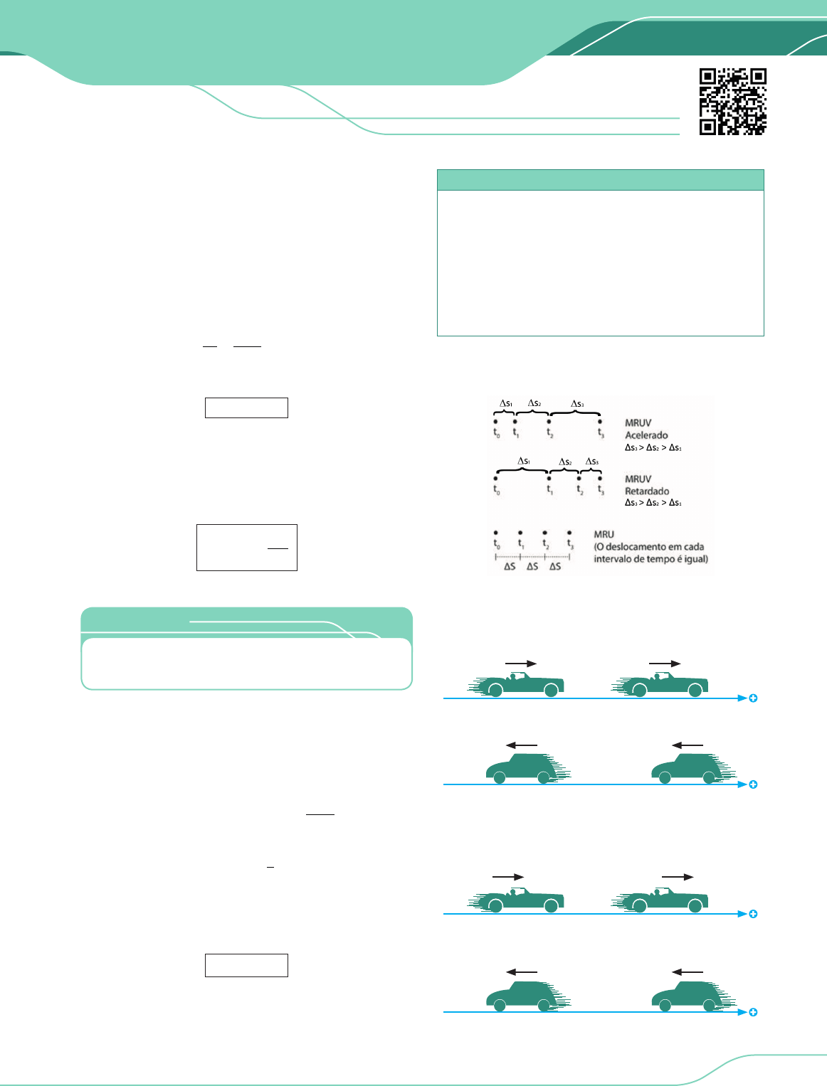 FÍSICA I PRÉ-VESTIBULAR 275SISTEMA PRODÍGIO DE ENSINO 03 MOVIMENTO RETILÍNEO UNIFORMEMENTE VARIADO DEFINIÇÃO O corpo descreve uma trajetória retilínea, com aceleração diferente de zero, porém constante, fazendo com que a velocidade varie com o tempo sempre na mesma taxa, ou seja, uniformemente. FUNÇÃO HORÁRIA DA VELOCIDADE Como a aceleração é constante, a aceleração escalar média é igual a aceleração instantânea e a velocidade varia de forma linear com o tempo: 0 m 0 v vva a V v a·t t t −∆ = = → → − = ∆ ∆ V = v0 + a · t FUNÇÃO HORÁRIA DA POSIÇÃO NO MRUV A posição de um corpo que descreve um MRUV varia de forma quadrática com o tempo, com isso o móvel não percorre deslocamentos iguais em intervalos de tempos iguais. 2 0 0 a·tS S V ·t 2 = + + No estudo dos gráficos veremos como chegar a esta equação. PROEXPLICA Equação de Torricelli Eliminando a variável tempo entre a equação da velocidade e a equação da posição chegamos à equação conhecida como Equação de Torricelli: 0 0 0 v vv v a·t v v a·t t a − = + → − = → = 2 0 0 1S S v ·t a·t 2 = + + Ao substituir o valor do tempo obtido na primeira equação na de baixo, teremos: 2 2 0v v 2·a· s= + ∆ No MRUV Os deslocamentos estão em PA, se os intervalos de tempo forem de 1 em 1 segundo a razão da PA é o valor da aceleração. A velocidade escalar média de um intervalo é a média das velocidades extremas do intervalo. A velocidade escalar média de um intervalo é igual à velocidade instantânea do instante médio do intervalo. Comparando os deslocamentos obtidos em intervalos de tempo iguais, temos: No movimento acelerado, a velocidade escalar e a aceleração escalar têm o mesmo sinal, isto é, são ambas positivas ou ambas negativas, como mostram os exemplos a seguir: v0= + 20 m/s v= + 21 m/s Acelerado e Progressivoa > 0 e v > 0 v= - 21 m/s v0= - 20 m/s Acelerado e Retrógradoa < 0 e v < 0 No movimento retardado, a velocidade escalar e a aceleração escalar têm sinais contrários, como mostram os exemplos a seguir: v0= + 20 m/s v= + 19 m/s Retardado e Progressivoa < 0 e v > 0 v= - 19 m/s v0= - 20 m/s Retardado e Retrógradoa < 0 e v < 0 PRÉ-VESTIBULARSISTEMA PRODÍGIO DE ENSINO276 FÍSICA I 03 MOVIMENTO RETILÍNEO UNIFORMEMENTE VARIADO PROTREINO EXERCÍCIOS 01. Um móvel percorre uma trajetória retilínea e seus espaços estão medidos a partir do marco escolhido na trajetória. Sua função horária é: S=15 - 5t +5t2. Nessa função, t é o tempo em horas e S é a posição em quilômetros. Identifique na função: a) A posição inicial do móvel; b) A velocidade inicial do móvel; c) A aceleração do móvel. 02. O universo cinematográfico da Marvel trouxe filmes sobre o Homem de Ferro, Capitão América, Homem Aranha, Pantera Negra e etc. Considere que em uma cena o Homem de Ferro, partindo do repouso em movimento uniformemente acelerado, atinja a velocidade de 360 Km/h em 25 segundos. Calcule o valor da aceleração escalar média do Homem de Ferro no referido intervalo de tempo. 03. Diego Viug, professor do ProEnem, está correndo em linha reta a 7 m/s para chegar ao estúdio quando vê à frente uma curva, sendo forçado a reduzir a velocidade para 2 m/s num intervalo de tempo de 2 segundos e assim iniciar a curva sem cair. Calcule a aceleração escalar média do professor nesse intervalo de tempo, em m/s². 04. A velocidade de um móvel é dada pela função v = 2 + 22.t, na qual t é medido em segundos e v em m/s. Determine a velocidade escalar inicial e a aceleração escalar do móvel e calcule a velocidade escalar quando t = 8 segundos. 05. Um móvel parte do repouso em movimento uniformemente acelerado com aceleração escalar a = 4 m/s². Calcule os valores de sua velocidade e de seu espaço após 5 segundos. PROPOSTOS EXERCÍCIOS 01. (IFCE) Um automóvel possui velocidade constante v=20 m/s. Ao avistar um semáforo vermelho à sua frente, o motorista freia o carro imprimindo uma aceleração de –2 m/s2. A distância mínima necessária para o automóvel parar, em m, é igual a (Despreze qualquer resistência do ar neste problema) a) 50 b) 200 c) 400 d) 10 e) 100 02. (IFCE) Um móvel inicialmente em repouso no ponto de partida passa a ser acelerado constantemente à razão de 3 m/s2 no sentido da trajetória. A velocidade do móvel após ter percorrido 24 m, em m/s, foi a) 6 b) 10 c) 8 d) 12 e) 4 03. (ENEM PPL) O trem de passageiros da Estrada de Ferro Vitória- Minas (EFVM), que circula diariamente entre a cidade de Cariacica, na Grande Vitória, e a capital mineira Belo Horizonte, está utilizando uma nova tecnologia de frenagem eletrônica. Com a tecnologia anterior, era preciso iniciar a frenagem cerca de 400 metros antes da estaçăo. Atualmente, essa distância caiu para 250 metros, o que proporciona reduçăo no tempo de viagem. Considerando uma velocidade de 72 km/h, qual o módulo da diferença entre as aceleraçőes de frenagem depois e antes da adoçăo dessa tecnologia? a) 0,08 m/s2 b) 0,30 m/s2 c) 1,10 m/s2 d) 1,60 m/s2 e) 3,90 m/s2 04. (UNICAMP) A demanda por trens de alta velocidade tem crescido em todo o mundo. Uma preocupação importante no projeto desses trens é o conforto dos passageiros durante a aceleração. Sendo assim, considere que, em uma viagem de trem de alta velocidade, a aceleração experimentada pelos passageiros foi limitada a amax=0,09 g, onde g=10 m/s 2 é a aceleração da gravidade. Se o trem acelera a partir do repouso com aceleração constante igual a amax, a distância mínima percorrida pelo trem para atingir uma velocidade de 1080 km/h corresponde a a) 10 km b) 20 km c) 50 km d) 100 km 05. (UNIFESP) Um avião a jato, para transporte de passageiros, precisa atingir a velocidade de 252 km/h para decolar em uma pista plana e reta. Para uma decolagem segura, o avião, partindo do repouso, deve percorrer uma distância máxima de 1 960 m até atingir aquela velocidade. Para tanto, os propulsore