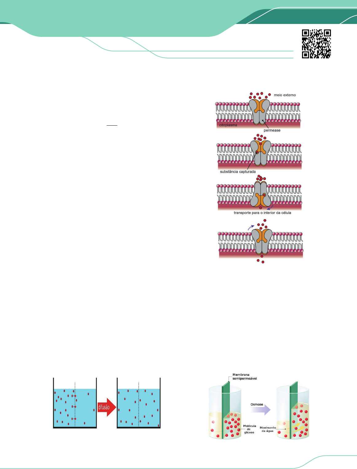 BIOLOGIA I PRÉ-VESTIBULAR 189SISTEMA PRODÍGIO DE ENSINO 08 MEMBRANA PLASMÁTICA II TRANSPORTE ATRAVÉS DA MEMBRANA Para compreendermos os transportes realizados pela membrana plasmática, devemos lembrar o conceito de concentração de uma solução. Simplifi cadamente, a concentração reflete a razão entre a massa de soluto e o volume da solução. = solutom/V solução mC V Imaginemos um copo com água e açúcar. Nele, o açúcar (substância a ser solubilizada) corresponde ao soluto, enquanto a água (substância solubilizadora) corresponde ao solvente. Analisando a equação, vemos que a massa de soluto é diretamente proporcional à concentração da solução, enquanto o volume de solução é inversamente proporcional à sua concentração. Assim, se preparamos duas soluções diferentes, podemos compará-las em termos de concentração. Vamos a duas situações hipotéticas: • Situação 1: dois copos possuem 300 mL de água, porém o copo A apresenta 100 g de açúcar e o copo B apresenta 50 g de açúcar. Qual dos dois copos apresenta maior concentração? O copo A apresenta uma solução mais concentrada. Assim, ao compararmos as duas soluções, podemos dizer que a solução do copo A é hipertônica (mais concentrada) em relação à solução do copo B que é hipotônica (menos concentrada). • Situação 2: dois copos possuem 100 g de açúcar, porém o copo A apresenta 500 mL de água e o copo B apresenta 100 mL de água. Qual dos dois copos apresenta maior concentração? O copo B apresenta maior concentração. Assim, seguindo a comparação feita anteriormente, podemos dizer que a solução do copo A é hipotônica (menos concentrada) em relação à solução do copo B que é hipertônica (mais concentrada). TRANSPORTE PASSIVO • Sem gasto energético (ATP). • A favor do gradiente de concentração. • Tende a estabelecer a isotonia (igualdade de concentração) entre os meios envolvidos. TIPOS DE TRANSPORTE PASSIVO • Difusão Simples: passagem do soluto de um meio hipertônico para um meio hipotônico. • Difusão Facilitada: passagem do soluto de um meio hipertônico para um hipotônico, com o auxílio de proteínas especiais da membrana celular, chamadas permeases. • Osmose: consideremos dois meios, A e B, separados por uma membrana semipermeável. No meio A colocaremos uma solução de cloreto de sódio em água a 30% e no meio B, outra solução do mesmo sal, porém a 10%. • A solução que se encontra no meio A é mais concentrada e, por isso, é dita hipertônica, enquanto a do meio B, por ser menos concentrada, é considerada hipotônica. • O fenômeno osmótico baseia-se no princípio de que quando dois meios de concentrações diferentes estão separados por membranas semipermeáveis, há passagem de maior quantidade de solvente do meio menos concentrado para o meio mais concentrado. A situação atinge o equilíbrio quando as duas soluções igualam as suas concentrações, tornando-se isotônicas. Assim, para o exemplo proposto, a situação de equilíbrio será atingida quando a concentração das soluções nos meios A e B forem iguais, ou seja, tivermos soluções de cloreto de sódio a 20%. PRÉ-VESTIBULARSISTEMA PRODÍGIO DE ENSINO190 BIOLOGIA I 08 MEMBRANA PLASMÁTICA II TRANSPORTE ATIVO Vimos anteriormente que, sem gastar qualquer energia, ou seja, passivamente, uma célula tende a equilibrar as concentrações entre as soluções intracelular e extracelular. No entanto, algumas atividades demandam concentrações diferentes de determinadas moléculas entre estes meios, como no caso da transmissão de um impulso nervoso. Nestas situações a célula utiliza a energia disponível sob a forma de adenosina trifosfato (ATP) para bombear íons ou moléculas de um meio ao outro. Este tipo de transporte, conhecido como transporte ativo, é caracterizado pelos seguintes parâmetros: • há gasto de energia (ATP); • contra o gradiente de concentração; • tende a manter a diferença de concentração dos meios envolvidos. Exemplo: Bomba de sódio e potássio. Compare agora, no fi gura abaixo, as entradas de íons na célula. TRANSPORTE DE GRANDES BLOCOS Algumas situações demandam que a célula capture ou elimine grand es quantidades de matéria de uma só vez. Nestas circunstâncias, em vez de investir moléculas energéticas (ATP) para capturar alguns poucos íons, como no caso da bomba de sódio e potássio, a célula foca o consumo energético em alterações temporárias no formato de sua membrana para englobar vírus, bactérias, fragmentos de células mortas ou grandes quantidades de aminoácidos, por exemplo. Sempre que estes grandes blocos de matéria são internalizados, dizemos que a célula está realizando um processo de endocitose. Se, ao contrário, as moléculas estiverem sendo externalizadas, falamos em exocitose. A endocitose pode ocorrer de duas formas distintas, através da fagocitose ou da pinocitose. No caso da exocitose, é comum falar em clasmocitose e secreção. Em todos estes quadros, a membrana plasmática depende de um trabalho conjunto com outras estruturas celulares, como o complexo de Golgi ou lisossomos. • Fagocitose: ingestão de partículas grandes (micro- organismos, restos celulares etc.), evidentes expansões citoplasmáticas (evaginações da membrana) chamadas pseudópodos. • Pinocitose: ingestão de macromoléculas dissolvidas em água, tais como aminoácidos. Seja por fagocitose ou por pinocitose, a matéria internalizada por endocitose deve ser digerida. A digestão depende de enzimas presentes em uma organela citoplasmática conhecida como lisossomo. Assim, os fagossomos ou pinossomos – vesículas membranosas formadas pela fagocitose e pinocitose, respectivamente – são fusionados aos lisossomos e originam um vacúolo digestório. Dentro desta bolsa membranosa que é o vacúolo ocorrerá a digestão, sendo os resíduos aproveitados pela célula ou descartados. Neste último caso, 