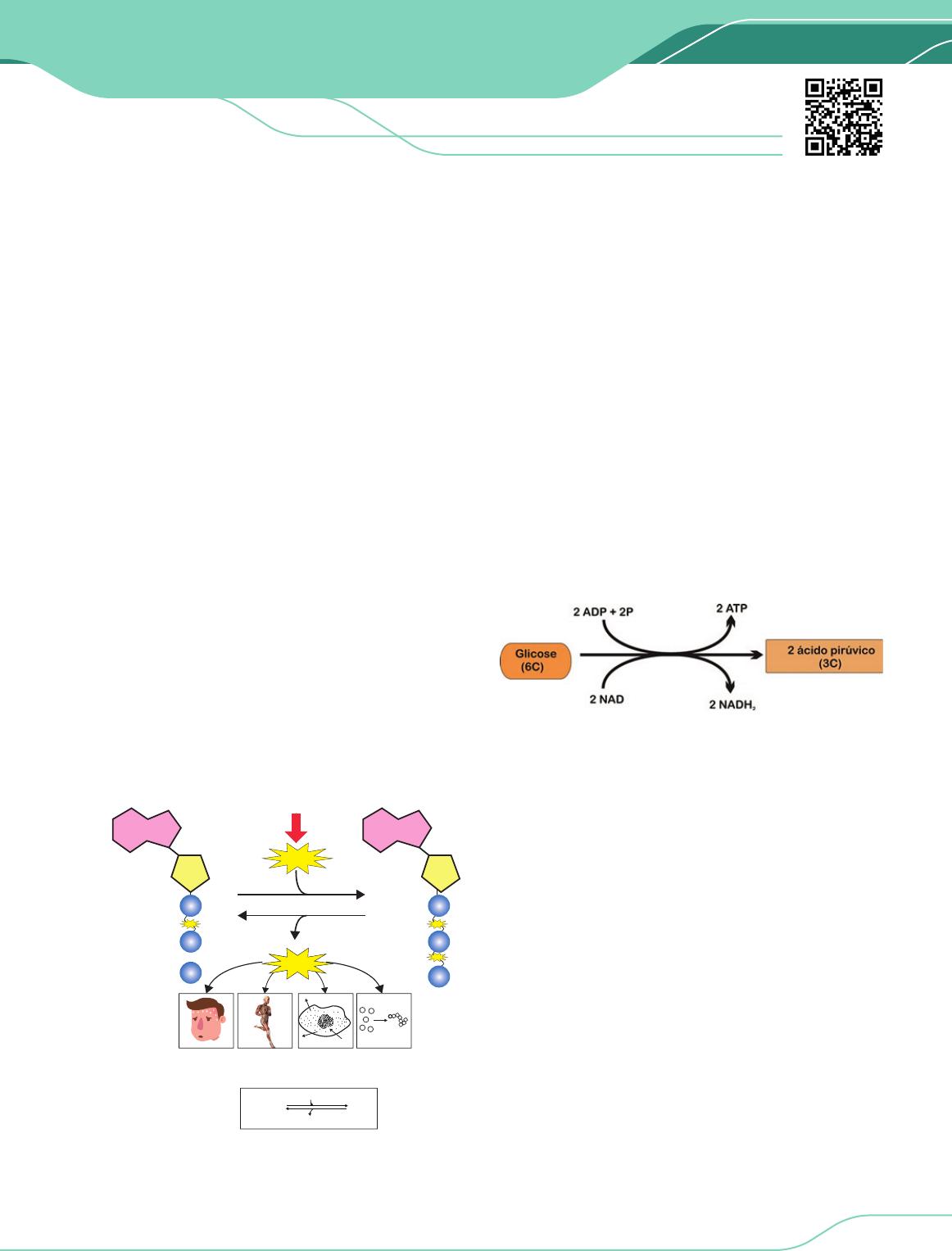 BIOLOGIA I PRÉ-VESTIBULAR 135SISTEMA PRODÍGIO DE ENSINO RESPIRAÇÃO CELULAR E FERMENTAÇÃO10 PRODUÇÃO ENERGÉTICA É bastante fácil imaginar que a energia que nos mantém vivos vem da alimentação. Mas qual a relação entre a comida e a energia de uma célula? Quando pensamos na química por trás da produção de energia, devemos focar nossas atenções nas moléculas que servem de combustível aos processos geradores. Assim, depois que ingerimos e digerimos o alimento, cada molécula é direcionada a um conjunto de reações químicas na qual melhor se encaixa. Os carboidratos, foco deste módulo, são movimentados em direção a dois processos principais: respiração celular ou fermentação. Através de várias reações, então, são quebradas as ligações químicas que mantém unidos os átomos dos carboidratos. Logo, se estas ligações químicas continham energia, a energia liberada pela sua quebra se torna disponível para a utilização pela célula. No entanto, precisamos manter em mente que um organismo não pode esperar pelo momento no qual precisará de energia para realizar as reações de respiração celular ou fermentação. Estas etapas do seu metabolismo precisam ser realizadas antes que a célula atinja a carência energética. Desta forma, a energia que antes ligava os átomos dos carboidratos agora precisa ser transferida para uma molécula que seja mais facilmente empregável quando necessário. Esta molécula recebe o nome de adenosina trifosfato ou trifosfato de adenosina, mas comumente nos referimos a ela pela sua forma abreviada: ATP. Como é possível observar na figura a seguir, uma molécula de ATP contém três grupamentos fosfato, sendo a ligação entre o segundo e o terceiro grupamentos uma ligação rica em energia e utilizável pela célula. Assim, sempre que há liberação de energia suficiente pela respiração celular ou pela fermentação, esta energia é utilizada pela célula para unir uma adenosina difosfato (ADP) a mais em um grupamento fosfato inorgânico (Pi). O ATP resultante pode ser quebrado, por exemplo, na realização de um transporte ativo através da membrana plasmática, na contração muscular, na propagação de um impulso nervoso, etc. Sempre que este ATP é consumido, na verdade, sua ligação química entre fosfatos é quebrada e a célula volta a ter ADP + Pi, além de acessar a energia liberada. produção de calor síntese de substâncias transporte ativo contração muscular adenina adenina ribose ribose adenosina difosfato (ADP) respiração adenosina trifosfato (ATP) energia energia P P energia P P PP Energia Energia ADP + P ATP A respiração pode ser de dois tipos básicos: a aeróbica e anaeróbica. RESPIRAÇÃO CELULAR AERÓBIA É aquela que utiliza oxigênio como aceptor final, já a anaeróbica, por sua vez, não utiliza essa substância. O processo de respiração aeróbica é muito mais eficiente que o da fermentação: para cada molécula de glicose degradada, são produzidas na respiração 38 moléculas de ATP, a partir de 38 moléculas de ADP e 38 grupos de fosfatos. A respiração aeróbica pode ser dividida em três etapas básicas: glicólise, ciclo de Krebs e fosforilação oxidativa (ou cadeia respiratória). Vale destacar, no entanto, que a glicólise é uma fase anaeróbica, uma vez que não depende do oxigênio. Nos seres eucariontes, a glicólise ocorre no citosol, e as outras etapas ocorrem em uma organela denominada mitocôndria, já nos procariontes a glicólise e o ciclo de Krebs ocorrem no citoplasma, e a cadeia respiratória no mesossomos. GLICÓLISE Nesse processo são liberados quatro hidrogênios, que se combinam dois a dois, com moléculas de uma substância celular capaz de recebê-los: o NAD (nicotinamida-adenina-dinucleotídio). Ao receber os hidrogênios, cada molécula de NAD se transforma em NADH2. Durante o processo, é liberada energia suficiente para a síntese de 2 ATP. Saldo: 2 ATP, 2NADH2 e 2 ácidos pirúvicos CLICLO DE KREBS Cada ácido pirúvico reage com uma molécula da substância conhecida como coenzima A, originando: acetil-coenzima A, gás carbônico e hidrogênios. O CO2 é liberado e os hidrogênios são capturados por uma molécula de NAD formadas nessa reação. Em seguida, cada molécula de acetil-CoA reage com uma molécula de ácido oxalacético, resultando em citrato (ácido cítrico) e coenzima A, conforme mostra a equação abaixo: 1 acetil-CoA + 1 ácido oxalacético → 1 ácido cítrico + 1 CoA (2 carbonos) (4 carbonos) (6 carbonos) Analisando a participação da coenzima A na reação acima, vemos que ela reaparece intacta no final. Tudo se passa, portanto, como se a CoA tivesse contribuído para anexar um grupo acetil ao ácido oxalacético, sintetizando o ácido cítrico. Cada ácido cítrico passará, em seguida, por uma via metabólica cíclica, denominada ciclo do ácido cítrico ou ciclo de Krebs, durante o qual se transforma sucessivamente em outros compostos. PRÉ-VESTIBULAR136 BIOLOGIA I 10 RESPIRAÇÃO CELULAR E FERMENTAÇÃO SISTEMA PRODÍGIO DE ENSINO Os oito hidrogênios liberados no ciclo de Krebs reagem com duas substâncias aceptoras de hidrogênio, o NAD e o FAD, que os conduzirão até as cadeias respiratórias, onde fornecerão energia para a síntese de ATP. No próprio ciclo ocorre, para cada acetil que reage, a formação de uma molécula de ATP. Saldo: 2 ATP, 6CO2, 8NADH2, 2FADH2 FOSFORILAÇÃO OXIDATIVA As moléculas de NAD, de FAD e de citocromos que participam da cadeia respiratória captam hidrogênios e os transferem, através de reações que liberam energia, para um aceptor seguinte. Os aceptores de hidrogênio que fazem parte da cadeia respiratória estão dispostos em sequência na parede interna da mitocôndria. O último aceptor de hidrogênios na cadeia respiratória é a formação de moléculas de ATP, processo chamado de fosforilação oxidativa. Cada molécula de NADH2 que inicia a cadeia respiratória leva