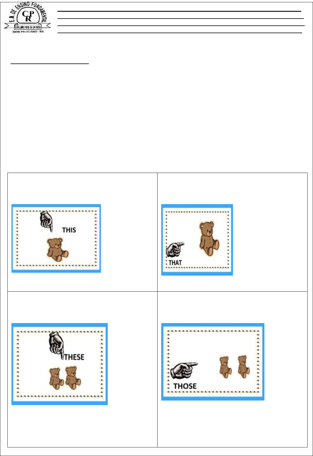 ESCOLA MUNICIPAL DE ENSINO FUNDAMENTAL CATULINO PEREIRA DA ROSA ATIVIDADES DE ESTUDOS MONITORADOS - LÍNGUA INGLESA - EJA NOTURNO TOTALIDADE 4 - 5ª Quinzena PROFESSOR: CEZAR CLAUNEI KILA NOME: __________________________ Período de 24 de agosto a 12 de setembro 1° aula This, that, these e those This, that, these e those são demonstrative pronouns (pronomes demonstrativos) em inglês. Os pronomes demonstrativos são usados para fazer referência ou demonstrar a posição de um elemento durante um discurso. Saiba o que significa cada um desses pronomes: This: este, esta, isto. That: aquele, aquela aquilo These: estes, estas. Those: aqueles, aquelas. Para saber qual pronome demonstrativo deve ser utilizado, é preciso prestar atenção no número (singular/plural) e na distância do elemento referido no discurso em relação ao emissor da mensagem. Preste atenção na explicação! - This é usado para fazer referência a um elemento no singular, que esteja perto do emissor da mensagem, ou seja, de quem diz a frase. This teddy bear is cute. (Este ursinho de pelúcia é bonitinho.) - That é usado para fazer referência a um elemento no singular, que esteja longe do emissor da mensagem, ou seja, de quem diz a frase. That teddy bear is cute. (Aquele ursinho de pelúcia é bonitinho. - These é usado para fazer referência a elementos no plural, que estejam perto do emissor da mensagem, ou seja, de quem diz a frase. These teddy bears are cute. (Estes ursinhos de pelúcia são bonitinhos.) - Those é usado para fazer referência a elementos no plural, que estejam longe do emissor da mensagem, ou seja, de quem diz a frase. Those teddy bears are cute. (Aqueles ursinhos de pelúcia são bonitinhos.) .2° aula Atividades 1) Observe a imagem e selecione a opção correta para completar as frases: 1. __________ is a ball. ( ________ é uma bola.) a) This b) That c) These d) Those 2. __________ is a doll.(__________ e uma boneca.) a) This b) That c) These d) Those 3. __________ are pigs.(____________ são porcos) a) This b) That c) These d) Those 4. __________ are hens.( ____________ são galinhas) a) This b) That c) These d) Those 2) Observe os desenhos e escreva this ou that. 3° aula 3) Observe o uso de this ou that e circule a resposta certa. A letra a ou b 4) Marque com “x” a resposta certa. a) Estas aqui são minhas cartas. ( ) These here are my cards. ( ) Those here are my cards. ( ) This here are my cards. b) Aqueles carros estão estacionados. ( ) This cars are parked. ( ) These cars are parked. ( ) Those cars are parked. c) Este é meu amigo John. ( ) These is my friend John. ( ) These is my friend John. ( ) This is my friend John. d) Aquelas não são suas amigas. ( ) Are those your friends. ( ) Those are not your friends. ( ) Aren't those your friends.