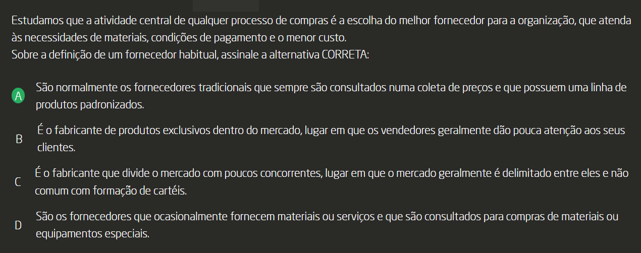 A definição de fornecedor habitual é: São normalmente os fornecedores tradicionais que sempre são consultados numa coleta de preços e que possuem uma linha de produtos padronizados. A definição de fornecedor habitual é: É fabricante de produtos exclusivos dentro do mercado, lugar em que os vendedores geralmente dão pouca atenção aos seus clientes. A definição de fornecedor habitual é: É fabricante que divide mercado com poucos concorrentes, lugar em que mercado geralmente é delimitado entre eles e não comum com formação de cartéis. A definição de fornecedor habitual é: São os fornecedores que ocasionalmente fornecem materiais ou serviços e que são consultados para compras de materiais ou equipamentos especiais. a) A definição de fornecedor habitual é: São normalmente os fornecedores tradicionais que sempre são consultados numa coleta de preços e que possuem uma linha de produtos padronizados. b) A definição de fornecedor habitual é: É fabricante de produtos exclusivos dentro do mercado, lugar em que os vendedores geralmente dão pouca atenção aos seus clientes. c) A definição de fornecedor habitual é: É fabricante que divide mercado com poucos concorrentes, lugar em que mercado geralmente é delimitado entre eles e não comum com formação de cartéis. d) A definição de fornecedor habitual é: São os fornecedores que ocasionalmente fornecem materiais ou serviços e que são consultados para compras de materiais ou equipamentos especiais.