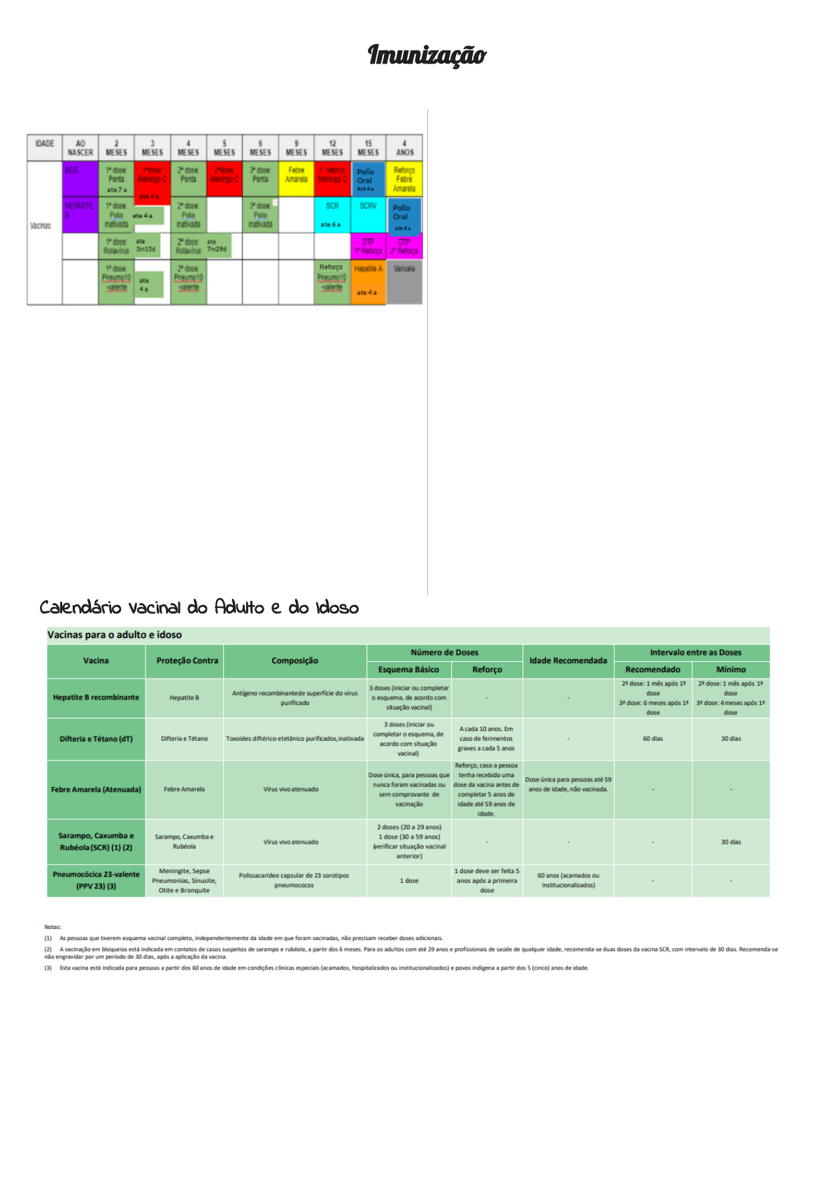 Imun�açã� Calendário vacinal da criança Imunidade ativa: - Natural: infecções - Artificial: vacinas Imunidade passiva - Natural: anticorpos maternos - Artificial: soros e imunoglobulinas Vacinas de agentes vivos atenuados: - Precaução com pacientes imunocomprometidos - Grávidas- risco de infecção fetal Vacinas não vivas: - Não são capazes de causar doença no indivíduo, mas pode ter efeito colateral ou evento adverso Vacinas de agentes vivos atenuados: - BCG - Rotavírus - Poliomielite oral (VOP) - Tríplice viral (SCR - sarampo, caxumba e rubéola) - Tetra viral (sarampo, caxumba, rubéola e varicela) - Febre amarela Vacinas não vivas: - Hepatite B - Anti-Haemophilus tipo B (Hib) - Poliomielite inativada (VIP) - Tríplice bacteriana (DTP - difteria, tétano e Coqueluche) - Influenza - Pneumo 10 - Meningo C Calendário Vacinal do Adulto e do Idoso (1) A recomendação de vacinação contra a febre amarela é para todo o Brasil, devendo seguir o esquema de acordo com as indicações da faixa etária e situação vacinal. Para pessoas com 60 anos e mais, o serviço de saúde deverá avaliar a pertinência da vacinação de acordo com o cenário epidemiológico da doença. (2) As pessoas que tiverem esquema vacinal completo, independente da idade em que foram vacinadas, não precisam receber doses adicionais. (3) Indicada vacinação em bloqueios de casos suspeitos de sarampo e rubéola a partir dos 6 meses. Adultos até 29 anos e profissionais de saúde (de qualquer idade), recomenda-se duas doses da vacina SCR, com intervalo de 30 dias. Após a aplicação da vacina, recomenda-se não engravidar por um período de 30 dias. Anexo III - Calendário do Adulto e do Idoso (4) É ofertada durante a Campanha Nacional de Vacinação contra Influenza, conforme os grupos prioritários definidos no Informe da Campanha. Para as crianças de seis meses a menores de seis anos de idade (cinco anos, 11 meses e 29 dias) (5) Esta vacina está indicada para pessoas a partir dos 60 anos de idade em condições clínicas especiais (acamados, hospitalizados ou institucionalizados) e população indígena a partir dos 5 (cinco) anos de idade. DPOC Os serviços de atendimento dos pacientes com doença pulmonar avançada e os postos de saúde da atenção básica, devem disponibilizar as seguintes vacinas: 1. Vacina anti-influenza: anual 2. Vacina antipneumocócica (>65 anos e/ou VEF1 <40%): a cada 05 anos. A utilização dessas vacinas irá reduzir as exacerbações infecciosas e, portanto, as internações hospitalares e uso de medicações de alto custo, como antibioticoterapia. https://www.saude.ce.gov.br/wp-content/uploads/sites/9/201 8/06/protocolo_doenca_pulmonar_obstrutiva_cronica.pdf Calendário Vacinal da Gestante (1) Gestantes que perderam a oportunidade de serem vacinadas durante o período gestacional, administrar 1 (uma) dose de dTpa no puerpério (até 45 dias), o mais precocemente possível. A vacina dTpa também será ofertada para todos os profissionais de saúde. Gestantes sem histórico vacinal da dT, administrar 2 (duas) doses da vacina dupla adulto (dT) e 1 (uma) dose da vacina dTpa a partir da 20ª semana de gestação. (2) É ofertada durante a Campanha Nacional de Vacinação contra Influenza, administrar esta vacina em qualquer idade gestacional. Administrar no puerpério caso a vacina não tenha sido administrada durante a gestação. Calendário Vacinal do Adolescente Notas: (1) As pessoas que tiverem esquema vacinal completo, independentemente da idade em que foram vacinadas, não precisam receber doses adicionais. (2) A vacinação em bloqueios está indicada em contatos de casos suspeitos de sarampo e rubéola, a partir dos 6 meses. Recomenda-se não engravidar por um período de 30 dias, após a aplicação da vacina. (3) A vacina HPV também está disponível em de esquema de 3 (três) doses aos 0, 2 e 6 meses, para as mulheres (de nove a 45 anos de idade) e homens (de nove a 26 anos de idade) vivendo com HIV/AIDS, transplantados de órgãos sólidos, de medula óssea e pacientes oncológicos. (4) Esta vacina está indicada para povos indígenas a partir dos 5 (cinco) anos de idade. Calendário Vacinal da Criança Evento adverso pós-vacinação – EAPV Um EAPV é qualquer ocorrência médica indesejada após a vacinação, não possuindo necessariamente uma relação causal com o uso de uma vacina ou outro imunobiológico imunoglobulinas e soros heterólogos). Um EAPV pode ser qualquer evento indesejável ou não intencional, isto é, sintoma, doença ou achado laboratorial anormal (WHO, 2012).
