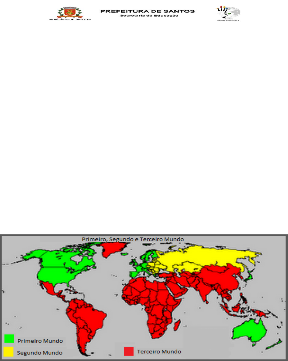 UME CIDADE DE SANTOS 8º ANO – GEOGRAFIA - PROFESSORAS: SIMONE E TATIANA SEMANA 05 – GEOGRAFIA Para falarmos sobre o mundo atual, em relação a situação econômica, precisamos explicar que no período da Guerra Fria (1947-1991) o mundo era dividido em países do: • Primeiro Mundo: países ricos, desenvolvidos, com altos índices de industrialização, elevado nível tecnológico e população com indicadores sociais elevados; • Segundo Mundo: países socialistas com economia planificada; • Terceiro mundo: países pobres, subdesenvolvidos e com baixo desenvolvimento social. http://marcellatoniatosilva.blogspot.com.br/2010/02/paises-do-primeiro-segundo-e-terceiro.html Com o fim da Guerra Fria, em 1991, e a extinção dos países socialistas o mundo é dividido em países desenvolvidos ou “países do Norte” e países subdesenvolvidos ou “países do Sul”. Os países desenvolvidos ou países do Norte são caracterizados pelo elevado Produto Interno Bruto (PIB) e pelas condições históricas de poder e acúmulo de riquezas. São representados, em geral, pelos Estados Unidos, União Europeia e Japão. Apesar das boas condições econômicas, nesses países também existem desigualdades sociais e pessoas em condições de acentuada pobreza. Os países subdesenvolvidos ou países do Sul apresentam as maiores taxas de pobreza, violência e problemas sociais do planeta. Sua situação de dependência econômica se deve aos processos de colonização, imperialismo e neocolonização impostos pelas nações consideradas desenvolvidas. Entre os países do sul, existem aqueles países chamados “emergentes” ou em desenvolvimento, são os BRICS (Brasil, Rússia, Índia, China e África do Sul), os Tigres Asiáticos (Hong Kong, Coréia do Sul, Cingapura e Taiwan) e o México. As disparidades entre os países do mundo são extremamente ligadas às origens históricas que deixaram reflexos profundos nos países, como relação de dominação e dependência, exploração das riquezas das colônias, introdução de cultura, formação de classe dominante e oligarquias que defendiam os interesses de suas metrópoles. Resumindo, desenvolvimento e subdesenvolvimento são frutos da história. Países Desenvolvidos e Países Subdesenvolvidos Características dos países desenvolvidos • Dominação econômica; • Apresentam estrutura industrial completa, produzem todos os tipos de bens; • Agropecuária moderna e intensiva, emprego de máquinas e mão-de-obra especializada; • Desenvolvimento científico e tecnológico elevado; • Modernos e eficientes meios de transporte e comunicação; • População urbana é maior que a população rural, são urbanizados; • População Ativa empregada, principalmente nos setores secundário e terciário; • Pequeno número de analfabetos; • Elevado nível de vida da população; • Boas condições de alimentação, habitação e saneamento básico; • Reduzido crescimento populacional; • Baixa taxa de natalidade e mortalidade infantil; • Elevada expectativa de vida. As sociedades desses países são altamente consumistas isto é percebido devido ao poder aquisitivo elevado da sociedade e a grande quantidade de produtos com tecnologia avançada que são lançados no mercado a cada ano. Se todas as nações do mundo passassem a consumir supérfluos com a mesma intensidade das nações desenvolvidas o mundo entraria em colapso pois não haveria matéria-prima suficiente para abastecer a todos os mercados. A democracia existe de fato nas nações desenvolvidas, e consiste num Estado de direito que resulta de reivindicações permanentes por parte dos cidadãos. A democracia é um processo contínuo de invenção e reivindicações de novos direitos. Características dos países subdesenvolvidos • Passaram por um grande processo de exploração durante o período colonial, ou seja, foram colônias de exploração; • Baixo nível de industrialização, com exceção de alguns países; • Dependência econômica, política e cultural em relação às nações desenvolvidas; • Deficiência tecnológica e baixo nível de conhecimento científico; • Rede de transporte e meios de comunicação deficientes; • Baixa produtividade na agricultura que geralmente emprega numerosa mão-de-obra; • População Ativa empregada principalmente nos setores primários ou no setor terciário; • Cidades com crescimento descontrolado e com isso são cercadas por bairros pobres e miseráveis; • Baixo nível de vida da maioria da população; • Crescimento populacional elevado; • Elevada taxa de natalidade e mortalidade infantil; • Expectativa de vida baixa. Existem países subdesenvolvidos que são fortemente industrializados como é o caso do Brasil, México, Argentina, os Tigres Asiáticos, entre outros. A industrialização existente nesses países na verdade é sustentada por países desenvolvidos, que os utilizam para expandir seus parques industriais e garantir lucros vultuosos. Alguns fatores atraem esses investimentos estrangeiros para os países subdesenvolvidos, como: • Mão-de-obra barata e numerosa; • Muitas vezes são isentos de pagamento de impostos; • Doação de terrenos por parte do governo; • Remessa de lucro das transnacionais para a sede dessas empresas; • Legislação flexível. Podemos concluir que.... O desenvolvimento, em parte, dos países ricos são de fato sustentados à custa da exploração dos países periféricos (subdesenvolvidos). Atividade 1. O espaço geográfico mundial no período da Guerra Fria (1945- 1991) estava regionalizado em blocos de acordo com as condições socioeconômicas dos países integrantes e o sistema adotado por influência das superpotências. Desse modo, o mundo estava regionalizado em: ( A ) países desenvolvidos e subdesenvolvidos ( B ) países do primeiro, segundo e terceiro mundo ( C ) países do centro e países periféricos ( D ) países do Norte e países do Sul 2