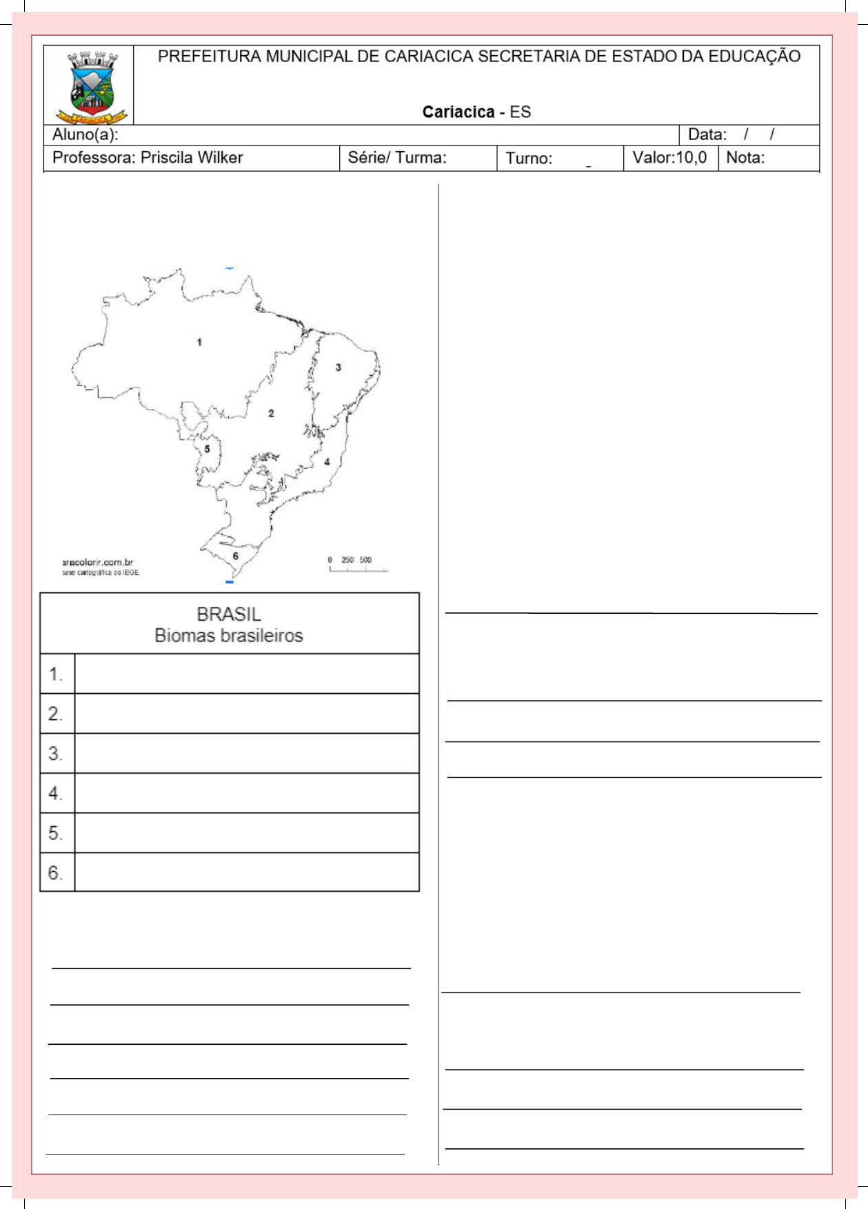 EMEF ZAÍRA MANHÃES DE ANDRADE ENDEREÇO: R.Quinze - Nova Rosa de Penha I Vespertino 1- Observe o mapa e complete o quadro “BRASIL Biomas brasileiros” com o nome do bioma indicado pelo número. 3- Constitui um bioma brasileiro que se estendia originalmente por uma área de dois milhões de km², hoje restam apenas 20% desse total. Este bioma apresenta solo deficiente em nutrientes e rico em ferro e alumínio, abriga plantas de aparência seca, entre arbustos esparsos e gramíneas e um tipo mais denso de vegetação, de formação florestal. Estima-se que 10 mil espécies de vegetais, 837 de aves e 161 de mamíferos vivam ali. Essa riqueza biológica, porém, é seriamente afetada pela caça e pelo comércio ilegal. Este bioma é o sistema ambiental brasileiro que mais sofreu alteração com a ocupação humana. O bioma brasileiro a que o texto faz referência é: 2- Explique o que é Bioma. 4- Qual é o bioma da região em que você vive? Cite 3 características. 6- O que é um hotspot? 5- No Brasil existe um bioma que se caracteriza por apresentar vegetação rica em cactáceas e árvores baixas e suculentas, com folhas apenas na época das chuvas, situado em zonas de clima tropical e com seca acentuada. Ele é denominado: 7- Marque V para as afirmativas verdadeiras e F para as falsas. a)Na Caatinga existem plantas com adaptações ao clima seco. ( ) b)A Floresta Amazônica é a maior Floresta Tropical do mundo.( ) c)A Floresta Amazônica possui solo fértil, propício à agricultura e a pecuária em extensas áreas.( ) d)Os Pampas são campos que se encontram no Rio Grande do Sul.( ) e)A Mata Atlântica é um hotspot, ou seja, uma área de grande biodiversidade protegida por lei. ( ) f)O Cerrado é o 2º maior bioma da América do Sul. ( ) g)O bioma Pantanal ocorre o extremo sul do país. Nele predominam as gramíneas (capim) e, como atividade econômica, destaca-se a criação de gado. ( ) h)O Cerrado é um bioma que apresenta solo ácido, com muitas gramíneas (capim) e árvores e arbustos esparsos, com galhos retorcidos e raízes longas. É encontrado no Brasil central.( ) i)A árvore típica da Floresta Amazônica é o Pinheiro do Pará.( ) 8-Considere o texto a seguir: “São encontrados(as) desde o Amapá até Santa Catarina, nos estuários de vários rios, apresentando solos alagados e instáveis, ricos em matéria orgânica e pouco oxigenados e são áreas de reprodução de diversas espécies marinhas.” O texto refere-se: A) às florestas tropicais. B) às florestas temperadas. C) aos manguezais. D) aos cerrados. 9- Dentre outras características, a plantas xerófitas possuem raízes muito longas e extensas; os seus caules são carnudos; e as suas folhas são pequenas, reduzidas a espinhos ou cobertas de pelos. Essas são algumas características adaptativas das plantas ao bioma onde se encontram. a) Que fator ambiental é o responsável pela ocorrência dessas características adaptativas? b)Qual o nome do Bioma em que ela se encontra? 10- O que são espécies endêmicas? 11- Construa uma cadeia alimentar apontando todos os níveis tróficos.