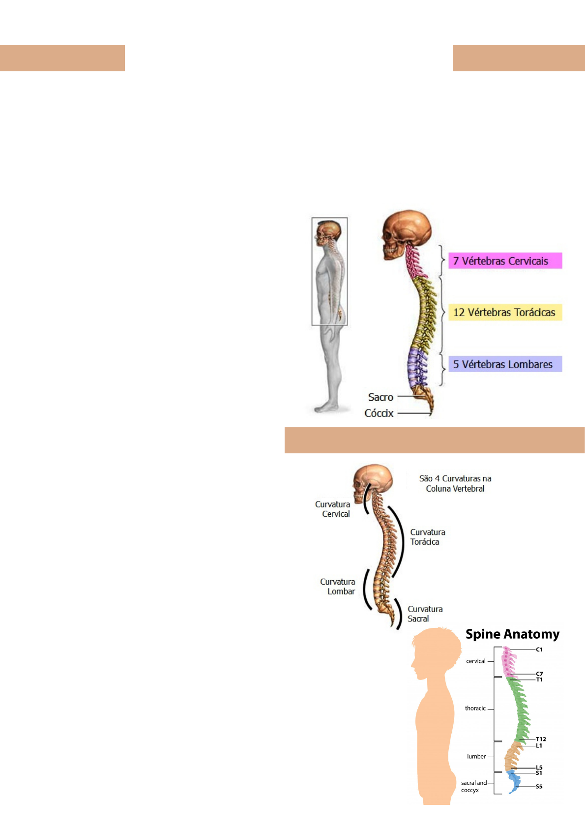 • Numa vista lateral, a coluna apresenta várias curvaturas consideradas fisiológicas. São elas: Cervical (convexa ventralmente – LORDOSE), Torácica (côncava ventralmente – CIFOSE), Lombar (convexa ventralmente – LORDOSE) Pélvica (côncava ventralmente – CIFOSE). • Quando uma destas curvaturas está aumentada, chamamos de HIPERCIFOSE (Região dorsal e pélvica) ou HIPERLORDOSE (Região cervical e lombar). • Numa vista anterior ou posterior, a coluna vertebral não apresenta nenhuma curvatura. Quando ocorre alguma curvatura neste plano chamamos de ESCOLIOSE. Todos os elementos da coluna vertebral servem o objetivo de proteger a medula espinhal, concebida para proporcionar uma comunicação entre o cérebro e o resto do corpo. Sua mobilidade e sensibilidade em todo o corpo ocorre graças a uma interação complexa de ossos, ligamentos e estruturas musculares, meticulosamente coordenadas pelos nervos. • A coluna vertebral, também chamada de espinha dorsal, estende-se do crânio até a pelve. • É constituída por 24 vértebras + sacro + cóccix e constitui, junto com a cabeça, esterno e costelas, o esqueleto axial. • Superiormente, se articula com o osso occipital (crânio); inferiormente, articula-se com o osso do quadril ( Ilíaco ). • A coluna vertebral é dividida em quatro regiões: Cervical, Torácica, Lombar e Sacro-Coccígea. • São 7 vértebras cervicais, 12 torácicas, 5 lombares, 5 sacrais e cerca de 4 coccígeas. Curvatura da Coluna Vertebral Coluna Vertebral Funções da Coluna Vertebral • Protege a medula espinhal e os nervos espinhais; • Suporta o peso do corpo; • Fornece um eixo parcialmente rígido e flexível para o corpo e um pivô para a cabeça; • Exerce um papel importante na postura e locomoção; • Serve de ponto de fixação para as costelas, a cintura pélvica e os músculos do dorso; • Proporciona flexibilidade para o corpo, podendo fletir- se para frente, para trás e para os lados e ainda girar sobre seu eixo maior. Canal Vertebral O canal vertebral segue as diferentes curvas da coluna vertebral. É grande e triangular nas regiões onde a coluna possui maior mobilidade (cervical e lombar) e é pequeno e redondo na região que não possui muita mobilidade (torácica). Na imagem ao lado (vista superior da coluna vertebral), podemos observar o canal vertebral. Ele é formado pela junção das vértebras e serve para dar proteção à medula espinhal. Além do canal vertebral, a medula também é protegida pelas meninges, pelo liquor e pela barreira hemato-encefálica. As vértebras podem ser estudadas sobre três aspectos: características gerais, regionais e individuais. Os elementos da coluna servem para proteger a medula espinal, o apoio do corpo e facilitar o movimento. Vértebras As vértebras suportam a maior parte do peso aplicado à coluna. O corpo de cada vértebra é ligado a um anel ósseo constituído por várias partes. Uma saliência óssea em ambos os lados do corpo vertebral chamado pedículo suporta o arco que protege o canal medular. As lâminas são as partes das vértebras que formam a parte de trás do arco ósseo que envolve e cobre o canal medular. Há um processo transversal de ambos os lados do arco, onde alguns dos músculos da coluna vertebral se prendem às vértebras. O processo espinhoso é a porção óssea do corpo vertebral que pode ser sentida como uma série de saliências no centro de pescoço e nas costas de uma pessoa. Disco Intervertebral Entre as vértebras da coluna vertebral há discos, os quais funcionam como amortecedores e as articulações. Eles foram concebidos para absorver as tensões desenvolvidas pela coluna vertebral, enquanto permitindo que os corpos vertebrais de se mover uns em relação aos outros. Cada disco é composto por um forte anel externo de fibras chamado de fibrose do anel, e um centro mole chamado de núcleo pulposo. A camada exterior (annulus) ajuda a manter o núcleo interior do disco (núcleo) intacta. O anel é feito de fibras muito fortes que ligam cada uma das vértebras em conjunto. O núcleo do disco tem um teor muito elevado de água, o que ajuda a manter a sua flexibilidade e propriedades de absorção de choque. Disco Intervertebral Entre os corpos de duas vértebras adjacentes desde a segunda vértebra cervical até o sacro, existem discos intervertebrais. Constituído por um disco fibroso periférico composto por tecido fibrocartilaginoso, chamado ANEL FIBROSO; e uma substância interna, elástica e macia, chamada NÚCLEO PULPOSO. Os discos formam fortes articulações, permitem vários movimentos da coluna vertebral e absorvem os impactos. Elementos da coluna Conjunto das Articulações Facetárias As articulações conectam as arcadas ósseas de cada um dos corpos vertebrais. Existem duas articulações entre cada par de vértebras, um em cada lado. O conjunto das Articulações Facetárias liga cada vértebra com a vértebra diretamente acima e abaixo dela, e é concebido para permitir que os corpos vertebrais possam rodar um em relação ao outro. Forame Neural O forame neural é uma abertura através da qual as raízes nervosas saem da coluna e viajam para o resto do corpo. Existem dois forames neurais localizados entre cada par de vértebras, um em cada lado. O forame cria uma passagem de proteção para os nervos que transportam sinais entre a medula espinhal e o resto do corpo. Medula Espinhal e Nervos A medula espinhal se estende a partir da base do cérebro e a região entre a primeira e segunda vértebras lombares. A medula espinhal termina divergindo em nervos individuais que viajam para a porção inferior do corpo e das pernas. Por causa de sua aparência, este grupo de nervos é chamado de cauda equina – o nome latino de “rabo de cavalo”. Os grupos nervosos viajam através do canal vertebral por uma curta distância antes de sair do forame neural. A medula espinhal é coberta por uma membrana protetora chamada dura-máter, 