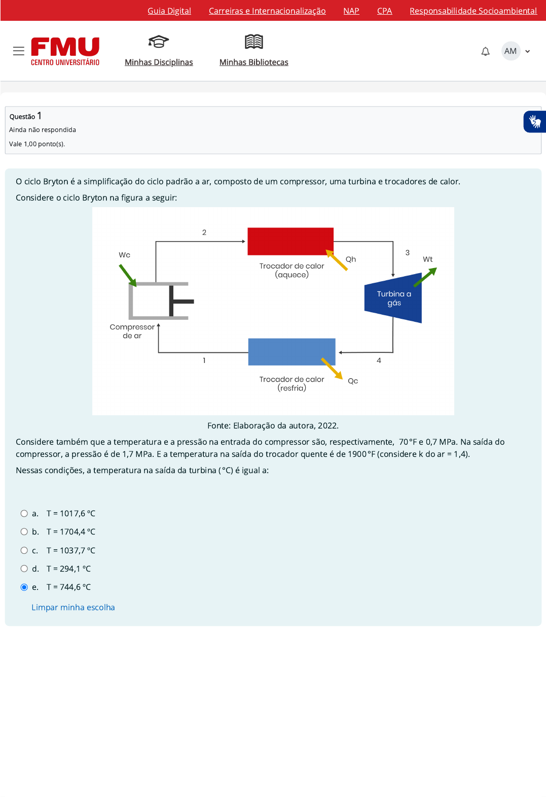 08/05/2023, 00:14 N2 (A5) https://ambienteacademico.com.br/mod/quiz/attempt.php?attempt=2162187&cmid=772184 1/8 Questão 1 Ainda não respondida Vale 1,00 ponto(s). O ciclo Bryton é a simpli�cação do ciclo padrão a ar, composto de um compressor, uma turbina e trocadores de calor. Considere o ciclo Bryton na �gura a seguir: Fonte: Elaboração da autora, 2022. Considere também que a temperatura e a pressão na entrada do compressor são, respectivamente, 70 °F e 0,7 MPa. Na saída do compressor, a pressão é de 1,7 MPa. E a temperatura na saída do trocador quente é de 1900 °F (considere k do ar = 1,4). Nessas condições, a temperatura na saída da turbina ( °C) é igual a: a. T = 1017,6 ºC b. T = 1704,4 ºC c. T = 1037,7 ºC d. T = 294,1 ºC e. T = 744,6 ºC Limpar minha escolha Guia Digital Carreiras e Internacionalização NAP CPA Responsabilidade Socioambiental Minhas Disciplinas Minhas Bibliotecas AM https://codely-fmu-content.s3.amazonaws.com/Moodle/GuiaDigital/Guia+digital/index.html https://carreiras.fmu.br/ https://codely-fmu-content.s3.amazonaws.com/Moodle/NAP/inicial/nap/fmu/index.html https://codely-fmu-content.s3.amazonaws.com/Moodle/CPA/landing_CPA/index.html https://portal.fmu.br/sustentabilidade https://ambienteacademico.com.br/ https://ambienteacademico.com.br/ https://ambienteacademico.com.br/course/view.php?id=236 08/05/2023, 00:14 N2 (A5) https://ambienteacademico.com.br/mod/quiz/attempt.php?attempt=2162187&cmid=772184 2/8 Questão 2 Ainda não respondida Vale 1,00 ponto(s). A Norma Regulamentadora NR-13 exige que toda caldeira contenha uma placa de identi�cação com alguns dados básicos, como a PMTA e a PMTH. A placa da �gura a seguir foi confeccionada para ser a�xada em uma caldeira: Fonte: Elaboração da autora, 2022. Observe que está faltando o valor da PMTH. Esse valor deve ser de: a. PMTH = 66,0 kgf/cm2 b. PMTH = 29,3 kgf/cm2 c. PMTH = 44,0 kgf/cm2 d. PMTH = 36,6 kgf/cm2 e. PMTH = 52,8 kgf/cm2 Limpar minha escolha Guia Digital Carreiras e Internacionalização NAP CPA Responsabilidade Socioambiental Minhas Disciplinas Minhas Bibliotecas AM https://codely-fmu-content.s3.amazonaws.com/Moodle/GuiaDigital/Guia+digital/index.html https://carreiras.fmu.br/ https://codely-fmu-content.s3.amazonaws.com/Moodle/NAP/inicial/nap/fmu/index.html https://codely-fmu-content.s3.amazonaws.com/Moodle/CPA/landing_CPA/index.html https://portal.fmu.br/sustentabilidade https://ambienteacademico.com.br/ https://ambienteacademico.com.br/ https://ambienteacademico.com.br/course/view.php?id=236 08/05/2023, 00:14 N2 (A5) https://ambienteacademico.com.br/mod/quiz/attempt.php?attempt=2162187&cmid=772184 3/8 Questão 3 Ainda não respondida Vale 1,00 ponto(s). Questão 4 Ainda não respondida Vale 1,00 ponto(s). O motor de combustão interna tem diversas classi�cações, dentre elas, a por número de tempos por ciclo, podendo ser a dois tempos ou a quatro tempos. Sobre os tempos do motor de combustão interna, analise as a�rmativas a seguir: I - No motor a quatro tempos, o virabrequim completa duas voltas a cada dois ciclos. II - No motor a quatro tempos, na admissão, o pistão parte de PMI para o PMS. III - No motor a dois tempos, os processos ocorrem de forma simultânea a cada tempo. IV - No motor a dois tempos, não há válvulas e, sim, janelas de admissão e escape. É correto o que se a�rma em: a. II e IV, apenas. b. I e III, apenas. c. III e IV, apenas. d. I e II, apenas. e. II e III, apenas. Limpar minha escolha Leia o trecho a seguir: Considere uma planta de potência a vapor que opera em um ciclo de Rankine ideal, utilizando água como �uido de trabalho. Nessa planta, um engenheiro de campo �cou responsável por coletar alguns dados da planta para uma avaliação de rotina. Após transcrever as suas anotações para uma planilha, o engenheiro percebeu que havia se esquecido de anotar a vazão mássica de água durante a operação. Porém, percebeu que anotou a potência líquida gerada no ciclo ( ). Local da medição P (bar) h (kJ/kg) Entrada da turbina 124,11 2675,83 Saída da turbina 0,08 1711,24 Entrada da bomba 0,08 1097,87 Saída da bomba 124,11 1507,95 De posse desses valores, assinale a alternativa que apresenta o valor correto da vazão mássica no ciclo. a. 180,3 kg/s. b. 280,8 kg/s. c. 263,3 kg/s. d. 183,1 kg/s. e. 170,5 kg/s. Limpar minha escolha Guia Digital Carreiras e Internacionalização NAP CPA Responsabilidade Socioambiental Minhas Disciplinas Minhas Bibliotecas AM https://codely-fmu-content.s3.amazonaws.com/Moodle/GuiaDigital/Guia+digital/index.html https://carreiras.fmu.br/ https://codely-fmu-content.s3.amazonaws.com/Moodle/NAP/inicial/nap/fmu/index.html https://codely-fmu-content.s3.amazonaws.com/Moodle/CPA/landing_CPA/index.html https://portal.fmu.br/sustentabilidade https://ambienteacademico.com.br/ https://ambienteacademico.com.br/ https://ambienteacademico.com.br/course/view.php?id=236 08/05/2023, 00:14 N2 (A5) https://ambienteacademico.com.br/mod/quiz/attempt.php?attempt=2162187&cmid=772184 4/8 Questão 5 Ainda não respondida Vale 1,00 ponto(s). Em uma central termelétrica, um engenheiro responsável por analisar o ciclo termodinâmico da central coletou os seguintes dados apresentados na tabela a seguir: Local da medição Pressão (bar) Entalpia (kJ/kg) Entrada da turbina 18 276,83 Saída da turbina 7 261,01 Entrada da bomba 7 86,78 Saída da bomba 18 87,93 Fonte: Elaboração do autor, 2022. Considerando que o ciclo termodinâmico em questão é um ciclo de Rankine, assinale a alternativa que indica o valor correto da e�ciência dessa central termelétrica. a. 7,8%. b. 8,2%. c. 6,9%. d. 10,6%. e. 9,4%. Limpar minha escolha Guia Digital Carreiras e Internacionalização NAP CPA Responsabilidade Socioambiental Minhas Disciplinas Minhas Bibliotecas AM https://codely-fmu-content.s3.amazonaws.com/Moodle/GuiaDigital/Guia+digital/index.html https://carreiras.fmu.br/ https://codely-fmu-content.s3.amazonaws.com/Moodle/NAP