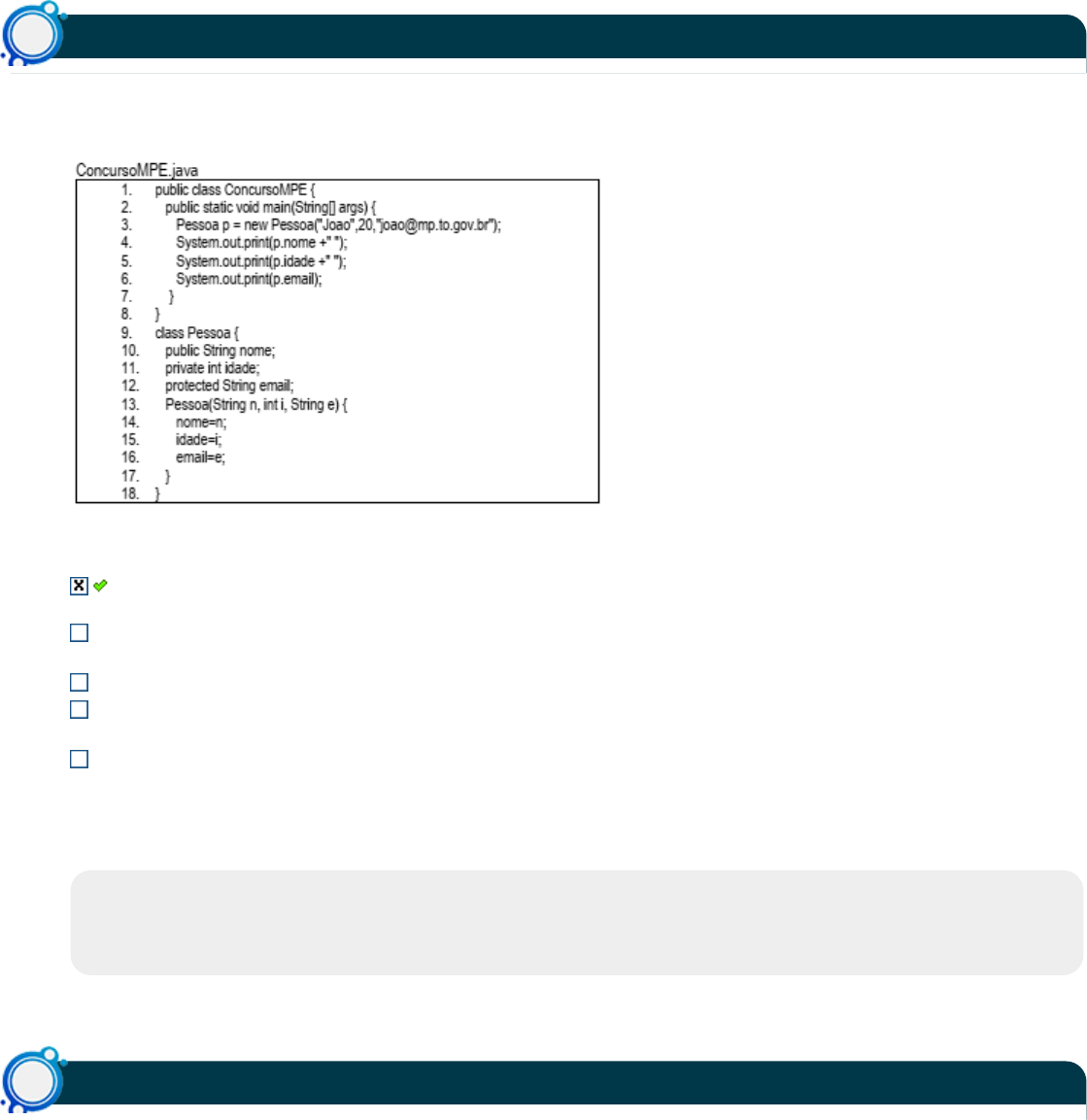 Acerto: 1,0 / 1,0 (COPESE-UFT − 2012 − MPE/TO − Técnico Ministerial ¿ Informática) Analise o código Java a seguir. É CORRETO afirmar que o código: Apresenta um erro de compilação na linha 5, pois como o atributo idade é privado, o conteúdo deste atributo não pode ser acessado forma em outra classe, sendo necessário criar métodos públicos na classe "Pessoa". Mostra apenas a saída "Joao 20" porque o atributo email da classe "Pessoa" tem o modificador de acesso protected e, assim, seu conteúdo não pode ser impresso. Mostra a saída "Joao 20 joao@mp.to.gov.br". Não pode ser executado porque existe mais de uma classe no arquivo ConcursoMPE.java e, assim, o compilador não saberá qual delas deve ser executada. Apresenta um erro de compilação na linha 13, visto que o nome dos parâmetros do construtor é diferente do nome dos atributos da classe "Pessoa". Respondido em 14/05/2023 20:22:19 Explicação: Resposta correta: Apresenta um erro de compilação na linha 5, pois como o atributo idade é privado, o conteúdo deste atributo não pode ser acessado forma em outra classe, sendo necessário criar métodos públicos na classe "Pessoa". Acerto: 1,0 / 1,0 (FUNRIO − 2018 − Câmara de São João de Meriti/ RJ − Analista Legislativo − Analista em Tecnologia − Adaptada) No que diz respeito à criação de métodos em Java, observe o fragmento a seguir. O qualificador, também conhecido por modificador, define a visibilidade e pode ser de três tipos básicos: I. O método é visível apenas pela própria classe. É o qualificador mais restritivo. II. O método é visível pela própria classe, por suas subclasses e pelas classes do mesmo pacote. III. O método é visível por qualquer classe. É o qualificador mais aberto no sentido de que qualquer classe pode usar este método. Os tipos básicos dos modificadores descritos em I, II e III são, respectivamente: Questão1a Questão2a "Private", "protected" e "public". "Protected", "public" e "private". "Private", "public" e "protected". "Protected", "private" e "public". "Public", "private" e "protected". Respondido em 14/05/2023 20:23:20 Explicação: Resposta correta: "Private", "protected" e "public". Acerto: 1,0 / 1,0 Ano: 2017 Banca: INSTITUTO AOCP Órgão: EBSERH Prova: INSTITUTO AOCP - 2017 - EBSERH - Analista de Tecnologia da Informação - Processos (HUJB - UFCG) Ao desenvolver um sistema utilizando a linguagem JAVA, alguns conceitos fazem parte da programação, como encapsulamento, herança e polimorfismo. No polimorfismo, temos o conceito de cast implícito. Assinale a alternativa que apresenta o comando que usa cast implícito. if (c instanceof Alcool) {abastecerAlcool (c);} void parar() {System.out.println(''Parado!'')}; double[ ] nota = {7, 8, 9, 1, 4, 2}; Pai objeto = new Filho(); Filho objetoFilho = (Filho)objetoPai; Respondido em 14/05/2023 20:23:36 Explicação: A resposta certa é: Pai objeto = new Filho(); Acerto: 1,0 / 1,0 Ano: 2009 Banca: INSTITUTO CIDADES Órgão: UNIFESP Prova: INSTITUTO CIDADES - 2009 - UNIFESP - Analista de Tecnologia da Informação (ADAPTADA) Acerca do método equals, analise as seguintes afirmativas: I. O equals recebe um Object como argumento e verifica se ele mesmo é igual ao Object recebido para retornar um boolean exclusivamente false. II. Um exemplo do uso do equals é para datas. Se usarmos criar duas datas, isto é, dois objetos diferentes, contendo 18/08/2009, ao comparar com o ==, receberá false, pois são referências para objetos diferentes. III. Quando comparamos duas variáveis referência no Java, o == verifica se as duas variáveis se referem ao mesmo objeto. Podemos afirmar corretamente que: As afirmativas I e II estão corretas. Apenas a afirmativa III está correta. Apenas a afirmativa I está correta. Apenas a afirmativa II está correta. As afirmativas II e III estão corretas. Respondido em 14/05/2023 20:24:07 Questão3a Questão4a Explicação: A resposta certa é: As afirmativas II e III estão corretas. Acerto: 1,0 / 1,0 (FCC -ARTESP -Especialista em Regulação de Transporte I -Tecnologia da Informação -2017) Considere que em uma classe Java chamada ClienteDao.java existe o método a seguir: Considere conn um objeto do tipo java.sql.Connection, que estabeleceu, em algum trecho da classe, uma conexão com um banco de dados. Ao chamar o método desconectar a partir de outra classe, se ocorrer uma exceção do tipo SQLException, ao executar a instrução conn.close(); ela deverá ser tratada: Por um bloco try...catch que deverá ser colocado no interior desse método. Por outro método dentro da classe ClienteDao.java. Por quem chamou o método desconectar. No interior do método desconectar. Pelo construtor da classe ClienteDao.java. Respondido em 14/05/2023 20:26:09 Explicação: A resposta certa é:Por quem chamou o método desconectar. Acerto: 1,0 / 1,0 (CESPE/CEBRASPE - TRE-MA - Técnico Judiciário - Programação de Sistemas) Um objeto de exceção possui, na linguagem Java, o método: Getchvar( ). Getsign( ). Getprior( ). Getfor( ). getMessage( ). Respondido em 14/05/2023 20:28:31 Explicação: A resposta certa é:getMessage( ). Acerto: 1,0 / 1,0 (VUNESP - TJ/SP - Analista de Sistemas - 2012) Considere as seguintes afirmações sobre Threads: Questão5a Questão6a Questão7a I. É uma forma de um processo se dividir em tarefas que podem ser executadas concorrentemente. II. Os sistemas que suportam múltiplas threads são chamados de multithread. III. Em hardwares com múltiplas CPUs (multi-core), as threads podem ser processadas de forma simultânea. Sobre as afirmações, está correto o contido em: I, apenas I e III, apenas I, II e III II e III, apenas I e II, apenas Respondido em 14/05/2023 20:29:07 Explicação: A resposta certa é: I, II e III Acerto: 1,0 / 1,0 (AOCP - BRDE - Analista de Sistemas - 2012) Sobre Prioridade e Agendamento de Thread na linguagem de programação Java, analise as afirmações e assinale a(s) correta(s)