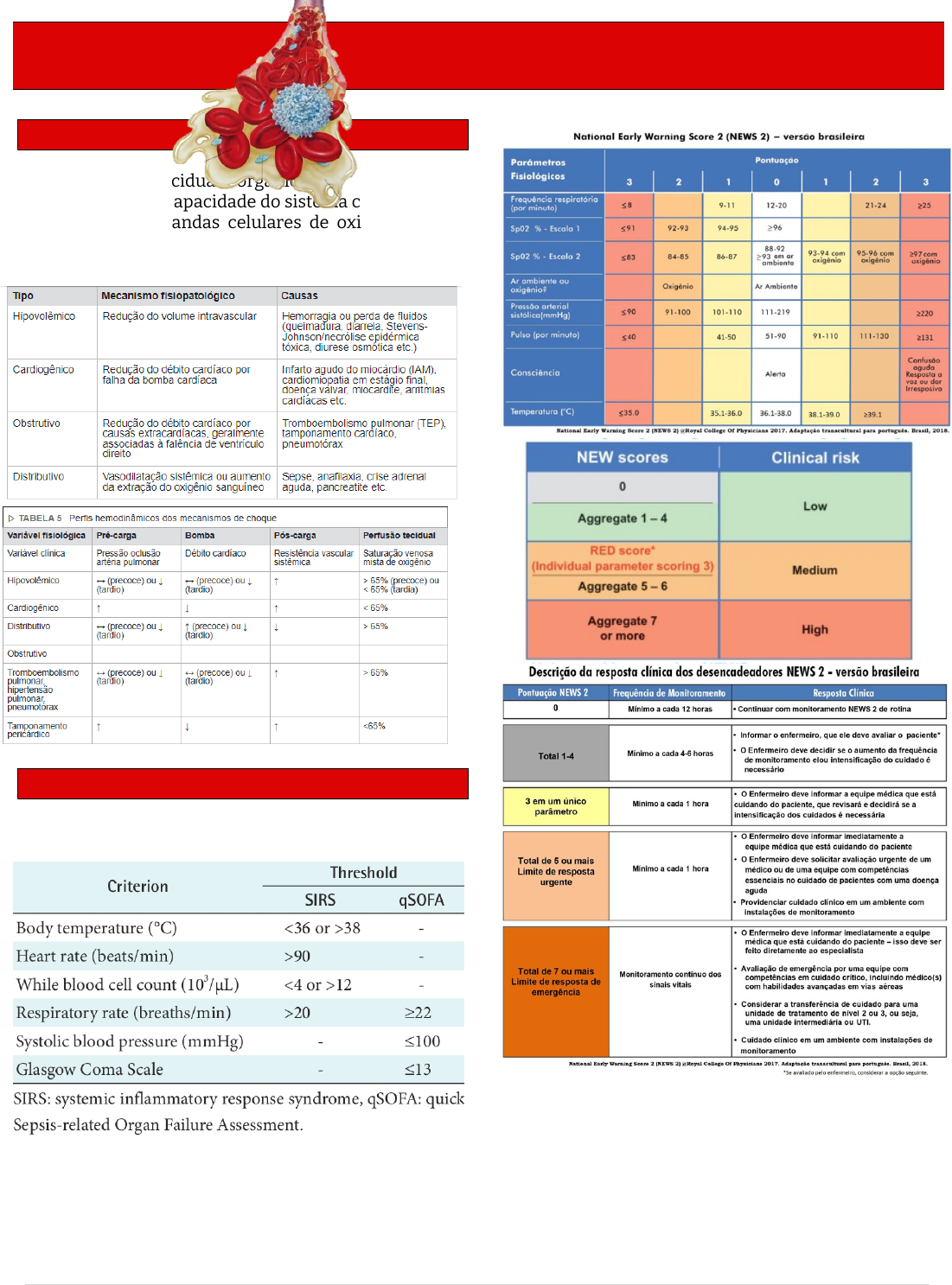 CHOQUE Karenn Cruz |Urgência e Emergência | Página Definição Hipóxia celular, tecidual e orgânica É causado pela incapacidade do sistema circulatório de suprir as demandas celulares de oxigênio, por oferta inadequada de oxigênio (DO2) e/ou por demanda tecidual aumentada de oxigênio (VO2). Quadro clínico Sinais e Sintomas Iniciais: Alertam sobre a possibilidade de choque. 2 ou mais achados = predição de gravidade OBS: Considerar alteração de maior/igual 3 pontos no glasgow Ajuda a definir qual paciente prediz maior gravidade e necessita de maior cuidado. Pode auxiliar na indicação de UTI e internação; Achados clínicos principais do Choque Hipotensão: Absoluta (PAS <90 mmHg) ou relativa (uma queda >40 mmHg na PAS), entretanto não necessariamente está presente.. Oligúria: É um dos sinais mais precoces do choque. Débito urinário <0,5ml/Kg/h Alterações do estado mental: Agitação, confusão, delírio, obnubilação e coma. Acidose metabólica: Redução da conversão do lactato e o aumento da produção do mesmo. Má perfusão periférica: Avaliada por uma pele fria, pegajosa e com enchimento capilar lentificado (>3 segundos). Taquicardia, taquipnéia, hipoxemia. Diagnóstico O diagnóstico do choque é clínico. Quando houver a suspeita de um paciente estar em choque, o diagnóstico deve ocorrer ao mesmo tempo em que a ressuscitação. Os esforços para restaurar a perfusão jamais devem ser retardados em detrimento da coleta da história, exame físico ou realização de exames laboratoriais ou de imagem Tratamento O objetivo inicial do tratamento do paciente em choque na sala de emergência é restabelecer a perfusão e a oferta de oxigênio para os tecidos, enquanto são feitos o diagnóstico e o tratamento da etiologia do choque MOV · Máscara não reinalante, com meta de SatO2 94-98%. · Oximetria de pulso não é confiável pela vasoconstrição periférica, avaliada pela gasometria arterial. ABCDE Tratamento VIP V - ventilação Oxigenação /IOT se necessário I - Infusão de fluidos/intervenções imediatas Individualizar P - pump com drogas vasoativas Ressucitação volêmica: Choque hemorrágico: 1 L de SF 0,9% Choque não hemorrágico: (250-500 mL) de cristalóides EV em bolus, reavaliando necessidade a cada 10 minutos Otimização da pós carga: Se hipotensão persistente após ressuscitação volêmica, a administração de vasopressores é indicada. OBS: Norepinefrina é o vasopressor de primeira escolha nos quadros de choque, exceto no anafilático, em que a epinefrina é superior. Otimização do débito cardíaco Transfusão: É indicada transfusão de concentrados de hemácias se <7g/dL. Para cardiopatas o alvo passa a ser Hb acima de 8 a 8,5 g/dL. Redução do VO2 Evitar hipertermia (antitérmicos, se necessário). Controlar a dor (analgésicos, se necessário). Reduzir a ansiedade (ansiolíticos, se necessário). Reduzir o trabalho respiratório (ventilação mecânica, quando indicada, e esta deve ser bem ajustada, evitando assincronias). Tratamento específico: Choque hipovolêmico: Ressucitação volêmica Choque cardiogênico: Infarto: Shock trial: CATE + tratamento breve Culprit-shock: tratar apenas artéria culpada Tracs: transfusão se Hb<8 Shock-cool: hipotermia proscrita Drogas: AAS+heparina +2° anti agreg. plaq. (na sala de hemodinâmica) ICC: Definir perfil: ABCD(L) DVA/diurético Descobrir causa Bradi/taquicardia: Cardioversão Marcapasso Cardioversor interno Choque obstrutivo TEP- anticoagulação plena/trombólise Pneumotórax - punção e drenagem Tamponamento cardíaco - drenagem Choque distributivo: Medidas iniciais: hem. completo, BT, gasometria, culturas, imagem, ATBterapia + cristalóide 30ml/kg + DVA - reavaliação Choque anafilático Reposição volêmica Adrenalina · 0,5mg IM (se estável) · 0,2-10 ui/min IV (se grave) Difenidramina 25-50mg 6/6h até 4/4h IV Metilprednisolona 125mg até 6/6h (3d) Choque neurogênico: Atropina - inibir acetilcolinas Epinefrina Corticoide - inflamação Cirurgia.