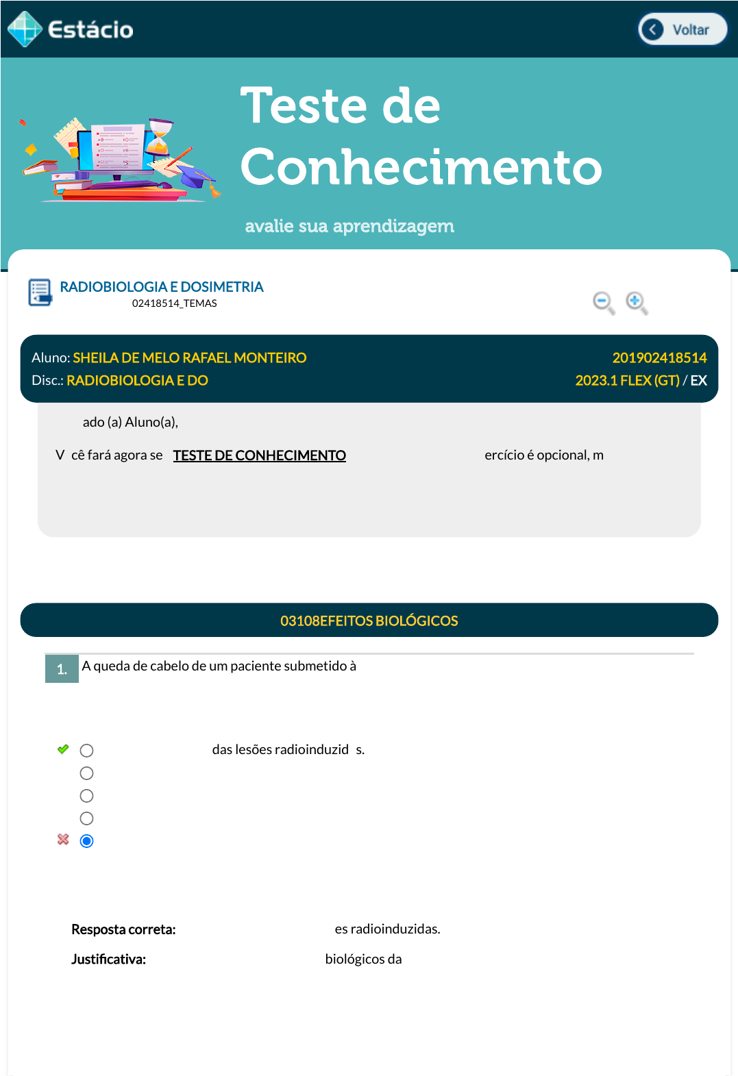 15/05/2023, 09:11 Estácio: Alunos https://simulado.estacio.br/alunos/ 1/6 Teste de Conhecimento avalie sua aprendizagem A queda de cabelo de um paciente submetido à radioterapia pode ter a causa confundida por outros agentes. Queimaduras na pele podem ser confundidas também pelo calor. A catarata pode ser causada por diversos agentes. Esses exemplos demonstram a di�culdade no diagnóstico dos efeitos biológicos da radiação. A que isso é atribuído? RADIOBIOLOGIA E DOSIMETRIA Lupa DGT1251_201902418514_TEMAS Aluno: SHEILA DE MELO RAFAEL MONTEIRO Matr.: 201902418514 Disc.: RADIOBIOLOGIA E DO 2023.1 FLEX (GT) / EX Prezado (a) Aluno(a), Você fará agora seu TESTE DE CONHECIMENTO! Lembre-se que este exercício é opcional, mas não valerá ponto para sua avaliação. O mesmo será composto de questões de múltipla escolha. Após responde cada questão, você terá acesso ao gabarito comentado e/ou à explicação da mesma. Aproveite para se familiarizar com este modelo de questões que será usado na sua AV e AVS. 03108EFEITOS BIOLÓGICOS 1. À insepeci�cidade das lesões radioinduzidas. Ao local de origem das lesões. À idade do indivíduo. Ao tipo de lesão. À epeci�cidade das lesões radioinduzidas. Data Resp.: 15/05/2023 08:46:43 Explicação: Resposta correta: À insepeci�cidade das lesões radioinduzidas. Justi�cativa: A inespeci�cidade dos efeitos biológicos da radiação, que não são exclusivos das radiações, di�culta o diagnóstico, pois os mesmos efeitos podem ser produzidos por agentes físicos ou químicos. Porém, se houver uma anamnese e o surgimento de um ou mais efeitos, o diagnóstico �cará mais evidente. javascript:voltar(); javascript:voltar(); javascript:diminui(); javascript:aumenta(); 15/05/2023, 09:11 Estácio: Alunos https://simulado.estacio.br/alunos/ 2/6 As radiações carregadas como elétrons, partículas α e fragmentos de �ssão transferem suas energias para a matéria principalmente por meio de seu campo elétrico e para muitos átomos ao mesmo tempo. Como são denominadas essas radiações? A maior probabilidade de interação da radiação com o organismo biológico é com as moléculas de água intracelular, pois 80% da célula é composta de água. As interações com a água intracelular criam espécies reativas de oxigênio (ROS), que em condições �siológicas normais estão em equilíbrio e são eliminadas pelo sistema oxidante do próprio organismo, evitando o estresse oxidativo. Qual a principal característica das ROS? As aberrações cromossômicas podem ser numéricas ou. As numéricas incluem o aumento ou diminuição do número do cariótipo normal da espécie humana, enquanto as estruturais incluem um ou mais cromossomos com alterações em sua estrutura. Assinale a alternativa correta que indica como são formados os cromossomos dicêntricos. 2. Radiações diretamente ionizantes. Radiações indiretamente compensadas. Radiações diretamente magni�cadas. Radiações indiretamente ionizantes. Radiações diretamente compensadas. Data Resp.: 15/05/2023 08:49:33 Explicação: Resposta correta: Radiações diretamente ionizantes. Justi�cativa: As partículas carregadas são radiações diretamente ionizantes, pois provocam ionizações diretas ao interagirem com o meio. Já as radiações indiretamente ionizantes transferem energia para elétrons, que por sua vez ionizaram o meio. 3. Possuem elétrons não pareados na camada mais externa do átomo. Possuem um nêutron a menos. Possuem um próton a menos. Possuem a eletrosfera intacta. Possuem elétrons não pareados nas camadas mais internas do átomo. Data Resp.: 15/05/2023 08:53:31 Explicação: Resposta correta: Possuem elétrons não pareados na camada mais externa do átomo. Justi�cativa: As espécies reativas de oxigênio (ROS) possuem elétrons não pareados na camada mais externa do átomo. Os prótons e o estado da eletrosfera não in�uenciam sua característica principal, pois não há relação com a capacidade oxidativa, mas os elétrons não pareados na camada mais externa, podem reagir com outras moléculas. 03110CLASSIFICAÇÃO DOS EFEITOS BIOLÓGICOS 4. Quando espontaneamente outrocentrômero em cromossomos sem troca de peças. 15/05/2023, 09:11 Estácio: Alunos https://simulado.estacio.br/alunos/ 3/6 A apoptose envolve uma série de alterações morfológicas no citoplasma e núcleo, levando à inativação e fragmentação da célula apoptótica, ao �nal de seu ciclo celular, sem dano tecidual. Assinale a opção que representa as etapas da apoptose. Com relação aos efeitos resultantes à exposição a baixas doses de radiação, é correto dizer: I - Geram efeitos genéticos, somáticos e in-útero II - Se manifestam apenas na pessoa irradiada III - São originados somente nos descendentes das pessoas irradiadas. Com base no exposto, assinale a alternativa correta. Quando ocorre a quebra de dois cromossomos e há a troca entre as suas peças centroméricas. Quando não ocorre a quebra de cromossomos. Quando ocorre a quebra deum cromossomo e a absorção de peças centroméricas avulsas do citoplasma. Quando ocorre a quebra de dois cromossomos com trocarecíproca. Data Resp.: 15/05/2023 08:58:27 Explicação: Os dicêntricos são as principais aberrações utilizadas na investigação de exposições a altas doses. Ocorre quando dois cromossomos são quebrados é há troca entre as suas peças centroméricas e os cromossomos multicêntricos podem serformados. Os cromossomos tricêntricos são formados por dois fragmentos, os quadricêntricos por três e assim por diante 5. Lesões crônicas, com células com colorações esbranquiçadas ou amareladas, geração de uma material em decomposição semelhante a uma pasta bem cremosa. Isquemia celular, diminuição do aporte de sangue dando ao tecido uma aparência de coágulo. Retração da célula, condensação da cromatina, prolongamentos da membrana celular, desintegração do núcl