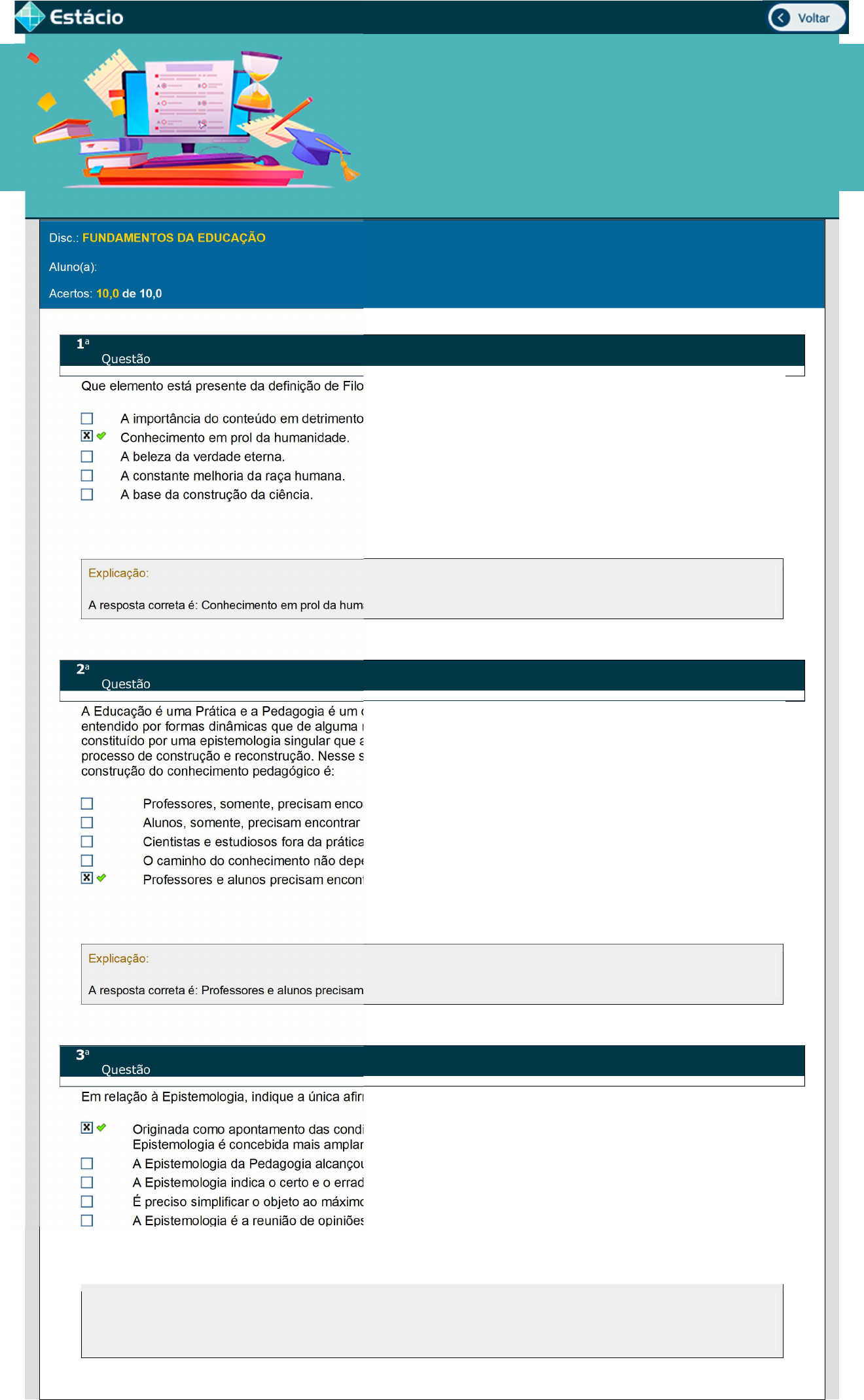 Meus Simulados Teste seu conhecimento acumulado Disc.: FUNDAMENTOS DA EDUCAÇÃO Aluno(a): 2023 Acertos: 10,0 de 10,0 10/05/2023 1a Questão Acerto: 1,0 / 1,0 Que elemento está presente da definição de Filosofia por diferentes autores e em diferentes épocas? A importância do conteúdo em detrimento da forma. Conhecimento em prol da humanidade. A beleza da verdade eterna. A constante melhoria da raça humana. A base da construção da ciência. Respondido em 10/05/2023 15:36:09 Explicação: A resposta correta é: Conhecimento em prol da humanidade. 2a Questão Acerto: 1,0 / 1,0 A Educação é uma Prática e a Pedagogia é um discurso. Enquanto discursos podemos pensar que este deve ser entendido por formas dinâmicas que de alguma maneira ajudam na compreensão do campo da Educação ser constituído por uma epistemologia singular que acaba permitindo que a ciência pedagógica esteja constantemente em processo de construção e reconstrução. Nesse sentido, podemos afirmar que a correta compreensão sobre a construção do conhecimento pedagógico é: Professores, somente, precisam encontrar o caminho do conhecimento. Alunos, somente, precisam encontrar o caminho do conhecimento. Cientistas e estudiosos fora da prática devem estabelecer os debates e construir o saber pedagógico. O caminho do conhecimento não depende nem do aluno nem do professor. Professores e alunos precisam encontrar o caminho da busca do conhecimento. Respondido em 10/05/2023 15:37:31 Explicação: A resposta correta é: Professores e alunos precisam encontrar o caminho da busca do conhecimento. 3a Questão Acerto: 1,0 / 1,0 Em relação à Epistemologia, indique a única afirmação correta: Originada como apontamento das condições necessárias à produção do saber científico, atualmente a Epistemologia é concebida mais amplamente como teoria do conhecimento. A Epistemologia da Pedagogia alcançou no século XXI um saber definitivo. A Epistemologia indica o certo e o errado na forma de aprender e ensinar. É preciso simplificar o objeto ao máximo para considerá-lo epistemologicamente. A Epistemologia é a reunião de opiniões e visões sobre determinado campo de conhecimento. Respondido em 10/05/2023 15:38:24 Explicação: A resposta correta é: Originada como apontamento das condições necessárias à produção do saber científico, atualmente a Epistemologia é concebida mais amplamente como teoria do conhecimento. 4a Questão Acerto: 1,0 / 1,0 A relação entre Ciência e Tecnologia foi cunhada de tecnociência. Tal conceito "enfatiza a indissociabilidade entre a esfera científica e a esfera tecnológica, e opõe-se ao dualismo defendido pela concepção tradicional". Disponível em: https://www.tectonia.com.br/filosofia/ciencia-tecnologia-tecnociencia/ Sobre o tema, assinale a alternativa correta. O termo tecnociência foi criado por Hottois, ao final dos anos de 1970. O termo tecnociência foi criado por Hottois, ao final dos anos de 1920. O termo tecnociência foi criado por Hottois, ao final dos anos de 2000. O termo tecnociência foi criado por Hottois, ao final dos anos de 1980. O termo tecnociência foi criado por Hottois, ao final dos anos de 1990. Respondido em 10/05/2023 15:39:15 Explicação: O termo tecnociência foi criado pelo filósofo Gilbert Hottois (1946-2019) ao final dos anos de 1970 e faz referência à íntima ligação entre a Ciência e a tecnologia. 5a Questão Acerto: 1,0 / 1,0 O conhecimento científico envolve a reflexão humana ralizada por meio de um método coerente e que vai permitir a compreensão de determinado objeto. Sobre o tema, assinale a alternativa correta. O homem, ao fazer ciência, nada mais faz do que interpretar o psiquismo humano, a realidade e suas próprias ações. O homem, ao fazer ciência, nada mais faz do que interpretar a realidade e suas próprias ações. O homem, ao fazer ciência, nada mais faz do que interpretar o psiquismo humano e a realidade. O homem, ao fazer ciência, nada mais faz do que interpretar os eventos humanos e sua relação com a filosofia. O homem, ao fazer ciência, nada mais faz do que interpretar a natureza e suas próprias ações. Respondido em 10/05/2023 15:39:41 Explicação: Além do conhecimento científico, o conhecimento filosófico é também constituído de forma rigorosa. Por isso, a Filosofia e a Ciência são consideradas interpretações pertinentes da realidade. O ser humano, ao fazer Ciência, está apenas interpretando a realidade e suas próprias ações, mas o faz segundo critérios e métodos próprios para validarem seus resultados. São essas interpretações que se transformam em discursos verdadeiros, fundamentados e validados. Portanto, em discursos com sentido. 6a Questão Acerto: 1,0 / 1,0 A compreensão do papel da Educação foi se modificando ao longo dos séculos e, na contemporaneidade, novos valores são evocados. Sobre o tema, assinale a alternativa correta. Na Idade Contemporânea, a educação é vista como processo cooperativo. Na Idade Contemporânea, a educação é vista como um bem a ser disputado. Na Idade Contemporânea, a educação é vista como um processo de construção. Na Idade Contemporânea, a educação é vista como processo cooperativo, processo de construção e processo de sistematização. Na Idade Contemporânea, a educação é vista como processo cooperativo e como processo de construção. Respondido em 10/05/2023 15:40:31 Explicação: Na Idade Contemporânea, a educação é vista como processo cooperativo e como processo de construção. Sabe-se que a aprendizagem se dá em diferentes cenários: em casa, na rua, nas escolas etc. Trata-se de um processo abrangente. 7a Questão Acerto: 1,0 / 1,0 O pensamento de Karl Marx marca a história da teoria sociológica e vai influenciar a compreensão e interpretação da realidade. Sobre as ideias marxistas, analise as proposições a seguir e a relação entre elas. I. Karl Marx é responsável por desenvol