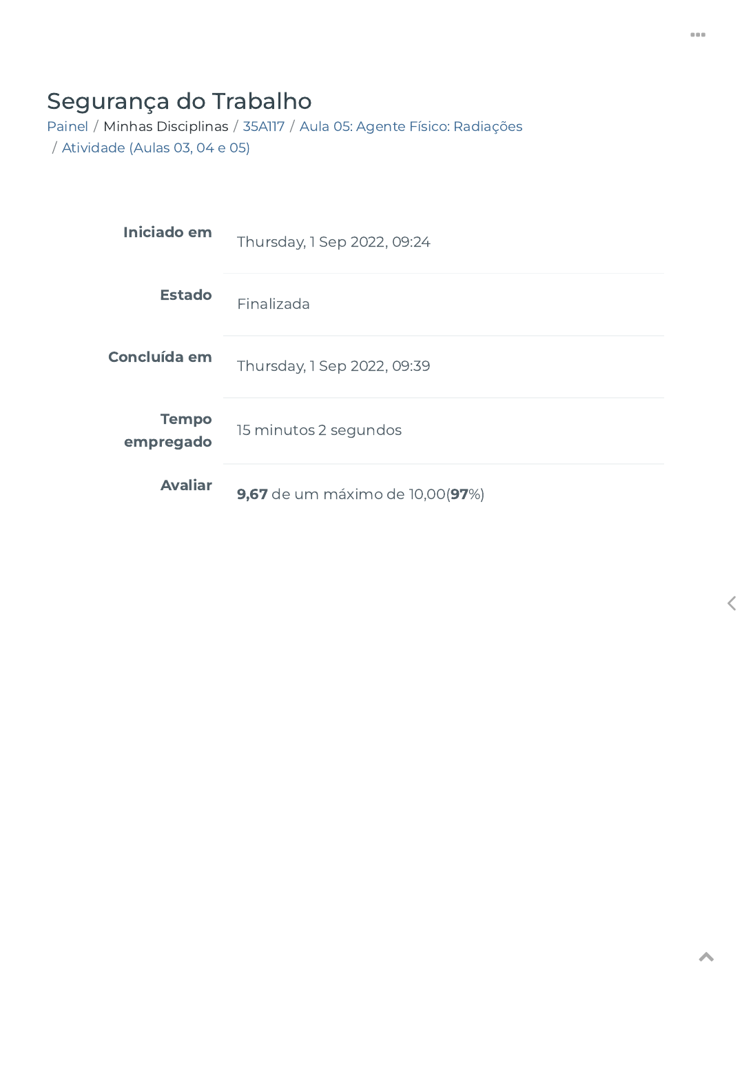 Painel / Minhas Disciplinas / 35A117 / Aula 05: Agente Físico: Radiações / Atividade (Aulas 03, 04 e 05) Segurança do Trabalho Iniciado em Thursday, 1 Sep 2022, 09:24 Estado Finalizada Concluída em Thursday, 1 Sep 2022, 09:39 Tempo empregado 15 minutos 2 segundos Avaliar 9,67 de um máximo de 10,00(97%) https://ava.politecnicabr.com.br/my/ https://ava.politecnicabr.com.br/course/view.php?id=1039 https://ava.politecnicabr.com.br/course/view.php?id=1039#section-7 https://ava.politecnicabr.com.br/mod/quiz/view.php?id=25501 https://ava.politecnicabr.com.br/ https://ava.politecnicabr.com.br/ Questão 1 Correto Atingiu 1,00 de 1,00 Assinale (V) Verdadeiro e (F) Falso, relacionado as radiações. ( ) Radiações ionizantes - Essa radiação pode ocasionar patologias como cânceres de pele, insolação, intermação, queimaduras, além de problemas na visão, por exemplo catarata, lesão no cristalino, lesões térmicas na retina. ( ) De acordo com a NR-15, em seu anexo 7, radiações não ionizantes são: micro-ondas, ultravioleta e laser. Segundo a norma, somente caracteriza insalubridade a exposição à radiação não ionizante sem a proteção adequada, e desde que elaborado laudo de inspeção realizada no local de trabalho. ( ) Segundo o Dicionário Houaiss, radiação ionizante é a radiação cuja energia é su�cientemente alta de modo a provocar a ionização ao atravessar um determinado meio. Escolha uma opção: a. V, F, V. b. F, V, V. c. F, F, F. d. F, F, V. e. V, V, V. https://ava.politecnicabr.com.br/ https://ava.politecnicabr.com.br/ Questão 2 Correto Atingiu 1,00 de 1,00 O ruído, além da disacusia, que corresponde ao estado mórbido em que certos sons produzem distúrbio da audição, dor ou mal- estar, pode provocar desconfortos ao trabalhador, entre outros: Escolha uma opção: a. todas as alternativas estão corretas. b. irritação causada pelo zumbido no ouvido. c. taquicardia - aceleração dos batimentos cardíacos. d. infarto agudo do miocárdio - obstrução de veias e/ou artérias. e. esforço, fadiga, concentração excessiva para realização de tarefas que exigem o uso da audição. https://ava.politecnicabr.com.br/ https://ava.politecnicabr.com.br/ Questão 3 Correto Atingiu 1,00 de 1,00 Com relação ao efeito da radioexposição aguda em adulto, associe as alternativas. Insu�ciência respiratória aguda, coma e óbito entre 14 e 36 h. Astenia, náuseas, vômitos (3 – 6h). Função medular atingida: linfopenia, leucopenia, trombopenia, anemia, recuperação em 6 meses. Morte de 50% das pessoas irradiadas. Função medular gravemente atingida. Pulmonar Rações gerais l Hematopoiétic DLso Hematopoiétic https://ava.politecnicabr.com.br/ https://ava.politecnicabr.com.br/ Questão 4 Correto Atingiu 1,00 de 1,00 Assinale a alternativa incorreta quanto a máxima exposição diária permitida ao ruído. Escolha uma opção: a. 114 d(B) é permitido diariamente 07min. b. 98 d(B) é permitido diariamente 1h15min. c. 105 d(B) é permitido diariamente 30min. d. 86 d(B) é permitido diariamente 7h. e. 93 d(B) é permitido diariamente 2h 40min. https://ava.politecnicabr.com.br/ https://ava.politecnicabr.com.br/ Questão 5 Correto Atingiu 1,00 de 1,00 Assinale a alternativa correta com relação as radiações. Escolha uma opção: a. A síndrome da radiação aguda caracteriza-se pela presença de alterações da derme, processos semelhantes à queimadura pelo sol; a hematopoiese é atingida; anemia; sangramentos e processos infecciosos frequentes; depressão intestinal; diarreias; e alteração no Sistema Nervoso Central (SNC). b. Quanto à proteção da mulher é que se trabalhar com material radioativo e estiver grávida, deverá comunicar seu empregador imediatamente, para seu afastamento da atividade e remanejamento para outra função que não apresente contato com a radiação. c. Não existe pro�laxia especí�ca para radiações ionizantes. Os efeitos e os agentes são imperceptíveis, o perigo de expor-se a uma super dosagem não está fora de cogitação. d. Todas as alternativas estão corretas. https://ava.politecnicabr.com.br/ https://ava.politecnicabr.com.br/ Questão 6 Correto Atingiu 1,00 de 1,00 Assinale (V) Verdadeiro e (F) Falso, referente aos exames auditivos. ( ) Impedanciometria - Serve para avaliar se ocorreu perda auditiva, medindo a integridade do sistema tímpano-ossicular e do re�exo estapédio. ( ) Audiometria - é um procedimento rápido e indolor, a pessoa �ca um uma cabine fechada enquanto o pro�ssional médico emite diferentes ruídos e em diferentes intensidades. ( ) Audiometria - procedimento simples, rápido e indolor em que, através do aparelho otoscópio, o pro�ssional observa o canal auditivo externo e a membrana timpânica. Otoscopia ( ) Otoscopia - é utilizada para diferenciar as patologias entre si, permitindo inferir sobre o funcionamento da tuba auditiva. Escolha uma opção: a. V, F, F, F. b. F, V, V, V. c. V, V, F, F. d. V, F, F, V. e. F, V, V, F. https://ava.politecnicabr.com.br/ https://ava.politecnicabr.com.br/ Questão 7 Correto Atingiu 1,00 de 1,00 Assinale (V) Verdadeiro ou (F) Falso, referente ao risco físico ruído. ( ) O som se propaga em qualquer meio material sólido, líquido ou gasoso, e sua velocidade será maior quanto mais denso for o meio. ( ) As ondas sonoras são de natureza mecânica, pois necessitam de um meio elástico para se propagarem, e essa propagação ocorre em diversas frequências: as perceptíveis pelo ouvido humano estão na faixa de 20 Hz a 20.000 Hz (Hertz). Escolha uma opção: a. F, V. b. V, F. c. V, V. d. F, F. https://ava.politecnicabr.com.br/ https://ava.politecnicabr.com.br/ Questão 8 Correto Atingiu 1,00 de 1,00 Assinale (V) Verdadeiro ou (F) Falso, referente as vibrações. ( ) A seleção do equipamento e a forma de posicioná-lo devem ser rigorosos, de modo a obter o melhor acoplamento entre o acelerômetro e o local da medição. ( ) A técnica para a men