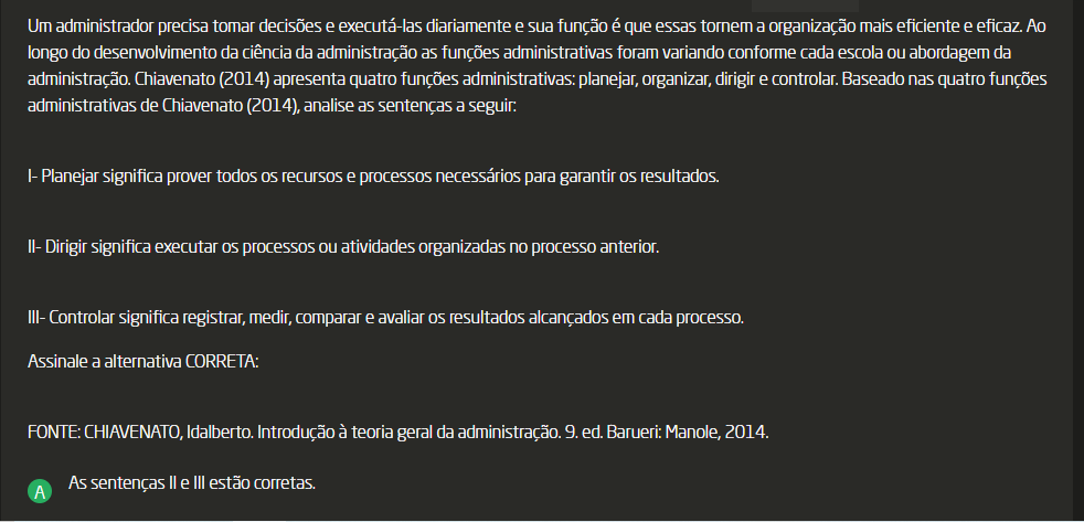Baseado nas quatro funções administrativas de Chiavenato (2014) analise as sentenças: I- Planejar significa prover todos recursos e processos necessários para garantir os resultados. II- Dirigir significa executar processos ou atividades organizadas no processo anterior. III- Controlar significa registrar, medir, comparar e avaliar os resultados alcançados em cada processo. Assinale a alternativa CORRETA: