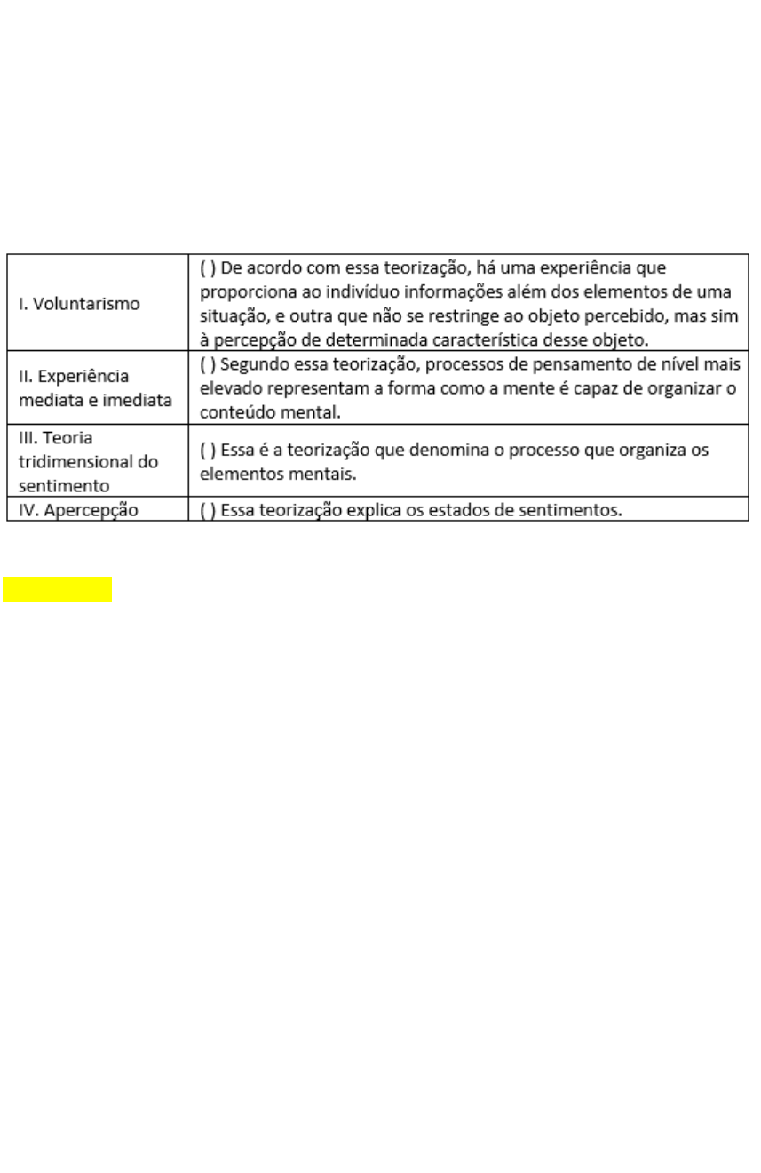 Unidade 1 Wilhelm Wundt é considerado, até os dias de hoje, o pai da Psicologia Moderna. Foi ele quem instalou o primeiro laboratório, lançou a primeira revista especializada e começou a trabalhar com a Psicologia Experimental como ciência. Para estudar a consciência, Wundt utilizava o método da introspecção, pois acreditava que apenas aquele que passa pela experiência é capaz de fazer observações sobre o que se passa em sua mente. A partir do método da introspecção, Wundt elaborou diferentes teorizações. Relacione, a seguir, os conceitos aos nomes dessas teorizações. Agora, assinale a opção que apresenta a sequência correta. II, I, IV e III. “Em 1962, 40 homens entre 20 e 50 anos participaram voluntariamente de uma pesquisa na Universidade de Yale, nos EUA, sobre a punição como método de aprendizagem. Em duplas, um dos participantes atuava como "professor", enquanto o outro fazia o papel de "aluno". Cada vez que o "aluno" errasse um exercício de memorização, o "professor" deveria lhe aplicar choques, que começavam em 15 volts e iam progressivamente a 450 volts. Na medida em que os choques eram aplicados, o "aluno" gritava de dor, pedia para sair do experimento ou se silenciava. Porém os "professores" invariavelmente eram ordenados a seguir com a pesquisa. Apenas uma pequena porcentagem interrompeu o experimento e deixou a sala. A grande maioria — 65% — continuou e chegou ao choque máximo, para surpresa do cientista político Stanley Milgram (1933—1984), que mais tarde se tornaria doutor em Psicologia Social. Ele buscava identificar a desistência dos "professores" como resposta recorrente, mas testemunhou uma relação de obediência a qualquer custo. Nenhum voluntário foi até o "aluno" verificar se ele estava bem.” (VELOSO, A. M. O desconcertante experimento de Milgram sobre o comportamento humano. Huffpost Brasil. 25 set. 2017. Disponível em: https://www.huffpostbrasil.com/2017/09/25/o-desconcertante-experimento-de- milgram-sobre-o-comportamento-humano_a_23219601/. Acesso em: 15 mar. 2019.) Considerando o controverso experimento realizado por Stanley Milgram e outros experimentos realizados ao longo do desenvolvimento da Psicologia, é possível afirmar que: Os questionamentos a respeito da ética e dos cuidados com os indivíduos que passavam por esses experimentos contribuíram para a criação de códigos de ética e de conduta para as pesquisas científicas. “Quando Mamie [Phipps Clark] nasceu em 1917, a população negra ainda vivia segregada e à margem de serviços de educação e saúde nos Estados Unidos. Para ajudar a reverter esse quadro, ela se dedicou ao estudo da psicologia e fez um mestrado sobre como a questão racial impacta a identidade de crianças negras. Em 1943, se tornou a primeira mulher negra a obter o doutorado na Universidade de Columbia (foi também a segunda pessoa afro-americana a alcançar o título, pois a primeira havia sido seu marido, Kenneth Clark). Junto com Kenneth, ficou conhecida pelos experimentos com bonecas brancas e negras, que mostraram como o racismo prejudica a autoimagem da população negra. Seu estudo ajudou a acabar com a segregação em escolas públicas em 1954.” (LOPES, L. Conheça 10 mulheres que mudaram a história da ciência mundial. Galileu. 8 mar. 2018. Disponível em: https://revistagalileu.globo.com/Ciencia/noticia/2018/03/conheca-10-mulheres- que-mudaram-historia-da-ciencia-mundial.html. Acesso em: 15 mar. 2019.) “Nise da Silveira (1905—1999) Psiquiatra renomada, a brasileira foi aluna de Carl Jung. Lutou contra métodos de tratamento comuns na sua época, como terapias agressivas de choque, confinamento e lobotomia. Durante a Intentona Comunista, em 1936, foi presa por possuir livros marxistas e acabou conhecendo o escritor Graciliano Ramos, que a transformou em uma personagem de seu livro “Memórias do Cárcere”.” (10 GRANDES mulheres da ciência. Galileu. 8 mar. 2017. Disponível em: https://revistagalileu.globo.com/Ciencia/noticia/2017/03/10-grandes-mulheres- da-ciencia.html. Acesso em: 15 mar. 2019.) Considerando os trechos expostos e a presença feminina na Psicologia tanto atualmente quanto no passado, pode-se afirmar que: A brasileira Nise da Silveira revolucionou o tratamento dado a pessoas com transtornos mentais, enquanto Mamie Clark contribuiu fortemente para o fim do racismo institucionalizado. Para se estabelecer como ciência, a Psicologia precisava de um objeto de estudo. Esse objeto era a mente humana, inicialmente entendida como uma entidade separada do corpo e responsável pelos processos cognitivos. Para estudá-la, no entanto, eram necessários métodos que permitissem analisar o homem e o mundo que o cerca. Durante os séculos XVIII e XIX, foram providenciados diversos deles. Analise, então, as informações a seguir e relacione cada conceito ao método que ele define. Agora, assinale a opção que apresenta a sequência correta. III, I e II. No século XIX, as liberdades e os interesses individuais começaram a ser questionados, uma vez que começaram a levar a conflitos e a colocar-se a favor de alguns poucos. Surgiram, então, movimentos reivindicatórios, pois os operários perceberam que conseguiam defender-se melhor dos abusos dos patrões se estivessem unidos. A administração pública, na tentativa de conter esses movimentos e manter a ordem social, também se fortaleceu. Cresceram, ainda, a indústria, a produção e o consumo em massa, diminuindo assim o espaço para as individualidades. Esse contexto propiciou um campo fértil para o desenvolvimento da Psicologia, porque: Fez-se necessário estabelecer uma ciência que desse conta da angústia gerada nos indivíduos ao perceberem sua subjetividade e, ao mesmo tempo, sua liberdade ilusória. Para entender o Associacionismo, que deu início às Teorias da Aprendizagem, é preciso entender a contribuição do filósofo John Locke. “O Ensaio sobre o entendimento humano, de John Loc