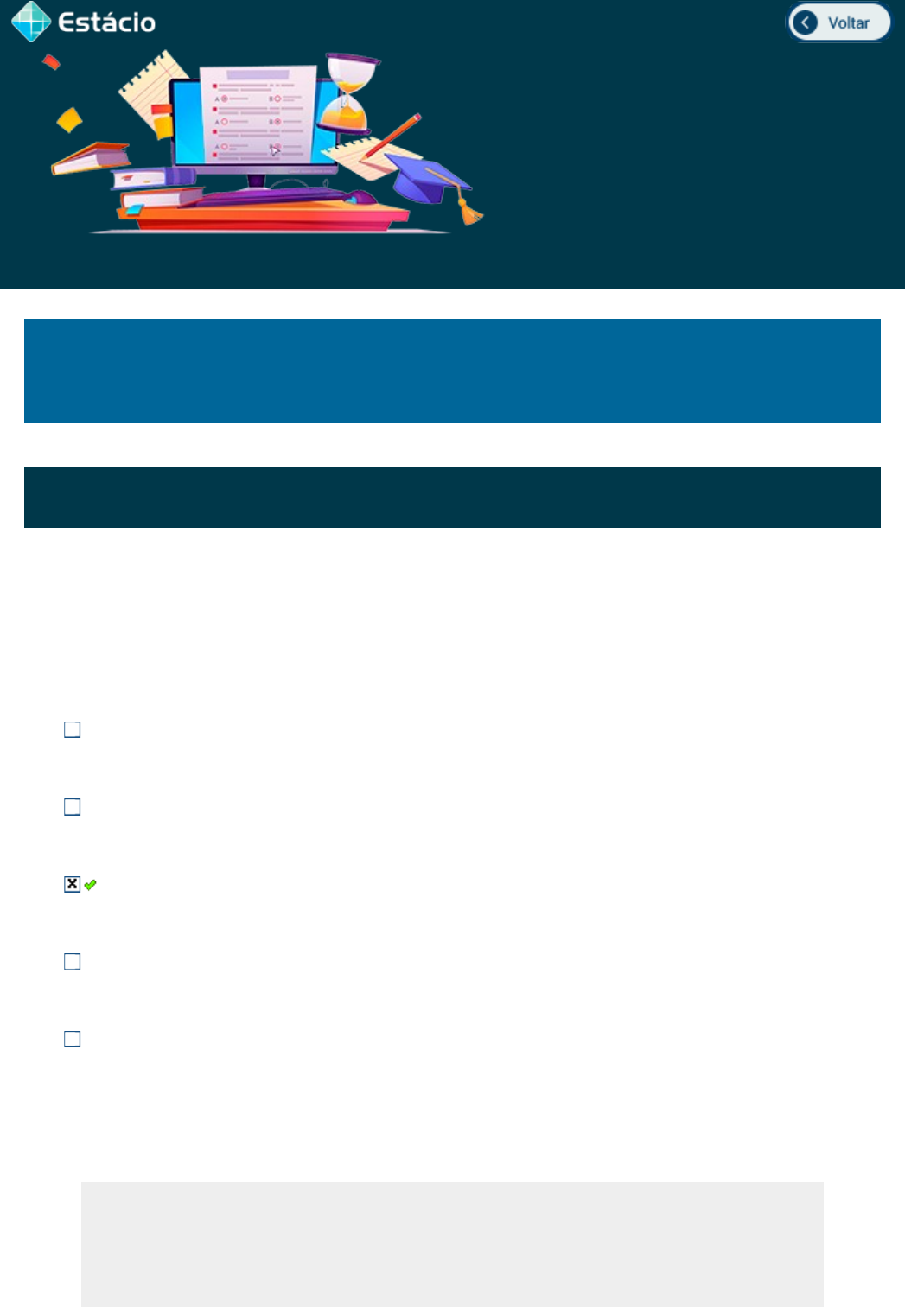 Simulado AV Teste seu conhecimento acumulado 1a Questão Acerto: 1,0 / 1,0 IADES - 2018 Para que uma meta seja realista, deve estar relacionada a uma métrica. Dessa forma, é necessário que tenha atributos em sua composição. Assinale a alternativa que apresenta os cinco atributos SMART de uma meta. Seletiva, maleável, atrativa, rápida e tangível Positiva, sustentável, desafiadora, gerenciável e específica Específica, medível, atingível, realista e com tempo definido Superável, medível, atingível, gerenciável e ecológica Específica, moderna, anual, realista e tangível Respondido em 01/05/2022 14:56:45 Explicação: O acrônimo SMART que em inglês quer dizer Specific/ Measurable/ Attainable/ Relevant/ Timely, tem como tradução o indicado na alternativa "Específica, medível, atingível, realista e com tempo definido". As demais alternativas trazem traduções distintas e que não condizem com os princípios apontados como importantes para a construção de objetivos e metas com excelência. 2a Questão Acerto: 1,0 / 1,0 Segundo Daniel Kahneman, ganhador do prêmio Nobel, nós temos dois tipos de possibilidades de tomada de decisão frente a algum obstáculo ou problema. Essas duas formas recebem o nome de: Intuitivo e emocional Intuitivo e racional Racional e destrutivo Racional e informacional Racional e irracional Respondido em 01/05/2022 14:53:38 Explicação: Daniel Kahneman coloca que temos dois centros de tomada de decisão. Um emocional, intuitivo e outro racional. No primeiro utilizamos a emoção e tomamos decisões rápidas e sem muita reflexão. Essas decisões são tomadas de forma intuitiva e são importantes para dar agilidade ao processo de tomada de decisão, principalmente em momentos de stress ou de perigo. Já o sistema racional procura verificar todas as alternativas e apontar o melhor caminho. Esse parece ser o melhor sistema para a tomada de decisões, mas ele é lento e dificilmente nós teremos todas as informações disponíveis para essa reflexão, ficando sempre uma decisão tomada encima de informações parciais, assimetria de informações. As demais alternativas trazem termos que não tem relação com a tomada de decisão ou que estão na contramão do que Kahneman propôs, como a irracional ou a informacional. 3a Questão Acerto: 1,0 / 1,0 Considerando a importância do autoconhecimento para orientar a carreira, indique qual dessas dimensões não formam parte desse conhecimento: Competências profissionais destacadas. Os valores que consideramos mais importantes. Fraquezas em relação a nossas atitudes. Nível de renda familiar. Propósitos na nossa vida. Respondido em 01/05/2022 15:28:42 Explicação: Gabarito: Nível de renda familiar. Justificativa: O nível de renda familiar não é um elemento expressivo do autoconhecimento em relação à gestão da carreira. Outras questões são mais relevantes, tais como: ter clareza dos nossos propósitos na vida, identificar quais são os valores mais importantes para nós, diferenciar nossas fortalezas profissionais, assim como reconhecer as competências que precisamos desenvolver. 4a Questão Acerto: 1,0 / 1,0 Existem vários setores no mercado em relação aos produtos comercializados. Indique a afirmação incorreta em relação a eles: O setor secundário é o que mais emprega no Brasil. Uma loja de sapatos é parte do setor terciário. O fornecimento de luz faz parte do setor secundário. O setor primário é o mais antigo e tradicional. O setor de serviços é complementar ao setor primário e secundário. Respondido em 01/05/2022 14:41:45 Explicação: Gabarito: O setor secundário é o que mais emprega no Brasil. Justificativa: O setor terciário -ou de serviços- é aquele que emprega a mais pessoas no Brasil. É o setor que mais cresceu no mundo nas últimas décadas. Pense em todas as áreas comerciais, nos servidores da administração pública ou nos transportes, por exemplo. São muitas atividades dedicadas a oferecer serviços que, em muitos casos, são derivados dos bens produzidos no setor primário e secundário. 5a Questão Acerto: 1,0 / 1,0 (CESGRANRIO, 2018 - Adaptada) A descrição do fundo de investimento é a seguinte: "Fundo destinado a pessoas físicas que procuram investimentos de longo prazo. Os recursos desse fundo são aplicados preponderantemente em ações negociadas em bolsa de valores com o objetivo de oferecer rendimento acima de outros fundos equivalentes. O investimento inicial é de R$ 25.000,00, e a taxa de administração é 0,50% (a.a.) sobre a rentabilidade, podendo chegar a 1% se o fundo ultrapassar em 120% a meta de rentabilidade estabelecida para o ano." De acordo com essas informações, estão sendo tratados nessa descrição qual tipo de fundo de investimento. Fundos de renda fixa Fundos de investimentos no exterior Fundos imobiliários Fundos de renda variável Fundos multimercado Respondido em 01/05/2022 15:31:53 Explicação: Os fundos de renda variáveis são os que possuem a maior parte de seus valores aplicados em papéis de maior risco, que podem oferecer maior rentabilidade. Como existe uma relação direta entre risco e rentabilidade, esses fundos se expõem a maiores riscos em busca dessa maior rentabilidade. Nesse caso, fundos de renda variáveis terão de aplicar a maioria de seu capital investido em ações e demais títulos variáveis para auferir essa rentabilidade maior. Os fundos multimercados investem em diversos tipos de papéis e mercados diferentes, não se concentrando em nenhum deles. Os fundos de renda variável investem preponderantemente em papeis de renda variável, ações e debêntures. Os fundos imobiliários investem em empreendimentos comerciais e industriais para aluguel. Os fundos de investimento no exterior são fundos nacionais que investem 100% de seus valores em fundos-mãe no exterior. 6a Questão Acerto: 1,0 / 1,0 Autoeficácia significa emoções que surgem como consequência do estresse negativo. 