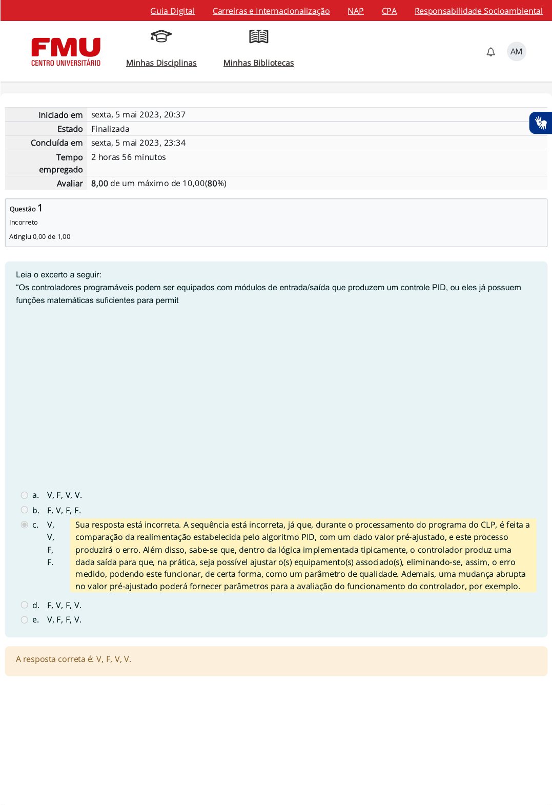 16/05/2023 21:29 N2 (A5): Revisão da tentativa https://ambienteacademico.com.br/mod/quiz/review.php?attempt=2152627&cmid=777028 1/10 Iniciado em sexta, 5 mai 2023, 20:37 Estado Finalizada Concluída em sexta, 5 mai 2023, 23:34 Tempo empregado 2 horas 56 minutos Avaliar 8,00 de um máximo de 10,00(80%) Questão 1 Incorreto Atingiu 0,00 de 1,00 Leia o excerto a seguir: “Os controladores programáveis podem ser equipados com módulos de entrada/saída que produzem um controle PID, ou eles já possuem funções matemáticas suficientes para permitir que esse controle seja executado. PID é essencialmente uma equação que o controlador usa para avaliar a variável controlada.” PETRUZELLA, F. D. Controladores lógicos programáveis. Porto Alegre: AMGH, 2014. p. 339. A respeito da implementação deste tipo de controlador no CLP, analise as afirmativas a seguir e assinale V para a(s) Verdadeira(s) e F para a(s) Falsa(s). I. ( ) Dentro do funcionamento básico da lógica PID, o controlador irá comparar a realimentação com um dado valor pré-ajustado. II. ( ) A saída é produzida pelas entradas através do controlador, de forma a corrigir o erro na prática, dentro do processo analisado. III. ( ) No processo, o erro observado, a ser controlado através do algoritmo PID, pode funcionar ainda como uma medida avaliável adicional. IV. ( ) A resposta do controlador PID pode ser testada a partir de várias medidas, como as mudanças no valor pré-ajustado. Assinale a alternativa que apresenta a sequência correta: a. V, F, V, V. b. F, V, F, F. c. V, V, F, F. Sua resposta está incorreta. A sequência está incorreta, já que, durante o processamento do programa do CLP, é feita a comparação da realimentação estabelecida pelo algoritmo PID, com um dado valor pré-ajustado, e este processo produzirá o erro. Além disso, sabe-se que, dentro da lógica implementada tipicamente, o controlador produz uma dada saída para que, na prática, seja possível ajustar o(s) equipamento(s) associado(s), eliminando-se, assim, o erro medido, podendo este funcionar, de certa forma, como um parâmetro de qualidade. Ademais, uma mudança abrupta no valor pré-ajustado poderá fornecer parâmetros para a avaliação do funcionamento do controlador, por exemplo. d. F, V, F, V. e. V, F, F, V. A resposta correta é: V, F, V, V. Guia Digital Carreiras e Internacionalização NAP CPA Responsabilidade Socioambiental Minhas Disciplinas Minhas Bibliotecas AM https://codely-fmu-content.s3.amazonaws.com/Moodle/GuiaDigital/Guia+digital/index.html https://carreiras.fmu.br/ https://codely-fmu-content.s3.amazonaws.com/Moodle/NAP/inicial/nap/fmu/index.html https://codely-fmu-content.s3.amazonaws.com/Moodle/CPA/landing_CPA/index.html https://portal.fmu.br/sustentabilidade https://ambienteacademico.com.br/ https://ambienteacademico.com.br/ https://ambienteacademico.com.br/course/view.php?id=236 16/05/2023 21:29 N2 (A5): Revisão da tentativa https://ambienteacademico.com.br/mod/quiz/review.php?attempt=2152627&cmid=777028 2/10 Questão 2 Correto Atingiu 1,00 de 1,00 Leia o trecho a seguir: “Em algumas aplicações, além das funções de controle normal, o CLP é responsável pela coleta de dados, executando o processamento necessário e estruturando os dados para a geração de relatórios. Como exemplo, é possível usar um CLP para contagem de peças e enviar automaticamente os dados para uma planilha na área de trabalho de um computador”. PETRUZELLA, F. D. Controladores lógicos programáveis. Porto Alegre: AMGH, 2014. p. 313. Nesse sentido, assinale a alternativa que apresenta o sistema responsável envolvido na situação de coleta de dados apresentada. a. Ethernet. b. Supervisor. c. Wi-Fi. d. Pro�bus. e. SCADA. Resposta correta. A alternativa está correta, pois o sistema SCADA (Supervisory Control and Data Acquisition, ou Supervisório para Aquisição de Dados) é responsável por coordenar o processo em tempo real, atuando junto com o sistema de controle associado, permitindo, assim, a coleta de dados. A resposta correta é: SCADA. Guia Digital Carreiras e Internacionalização NAP CPA Responsabilidade Socioambiental Minhas Disciplinas Minhas Bibliotecas AM https://codely-fmu-content.s3.amazonaws.com/Moodle/GuiaDigital/Guia+digital/index.html https://carreiras.fmu.br/ https://codely-fmu-content.s3.amazonaws.com/Moodle/NAP/inicial/nap/fmu/index.html https://codely-fmu-content.s3.amazonaws.com/Moodle/CPA/landing_CPA/index.html https://portal.fmu.br/sustentabilidade https://ambienteacademico.com.br/ https://ambienteacademico.com.br/ https://ambienteacademico.com.br/course/view.php?id=236 16/05/2023 21:29 N2 (A5): Revisão da tentativa https://ambienteacademico.com.br/mod/quiz/review.php?attempt=2152627&cmid=777028 3/10 Questão 3 Correto Atingiu 1,00 de 1,00 Observe a imagem a seguir, que apresenta um exemplo do esquema de acesso de uma dada rede até outra, com a porta de entrada (representada pelo termo em inglês gateway) permitindo a comunicação através de mais de um tipo de arquitetura e/ou protocolo de comunicação. Figura - Exemplo do esquema de acesso de uma rede à outra Fonte: Petruzella (2014, p. 305). #PraCegoVer: a imagem apresenta o esquema com um exemplo de acesso de uma rede à outra, trazendo o equipamento Siemens, seu gateway e, ao lado, o Omron e seu gateway, com ambas as portas conectadas ao barramento da rede. Em seguida, tem-se outros dois gateways lado a lado, associados cada um ao CLP da Allen-Bradley e da Gould, cujas comunicações são, respectivamente, em linha de dados e Modbus. PETRUZELLA, F. D. Controladores lógicos programáveis. Porto Alegre: AMGH, 2014. Considerando a imagem acima, do exemplo do esquema de acesso de uma rede à outra, analise as afirmativas a seguir e assinale V para a(s) verdadeira(s) e F para a(s) falsa(s). I. ( ) Caso a tradução de acesso à rede no exemplo seja a única função da porta, as portas serão referidas como pontes. II. ( ) As portas na p