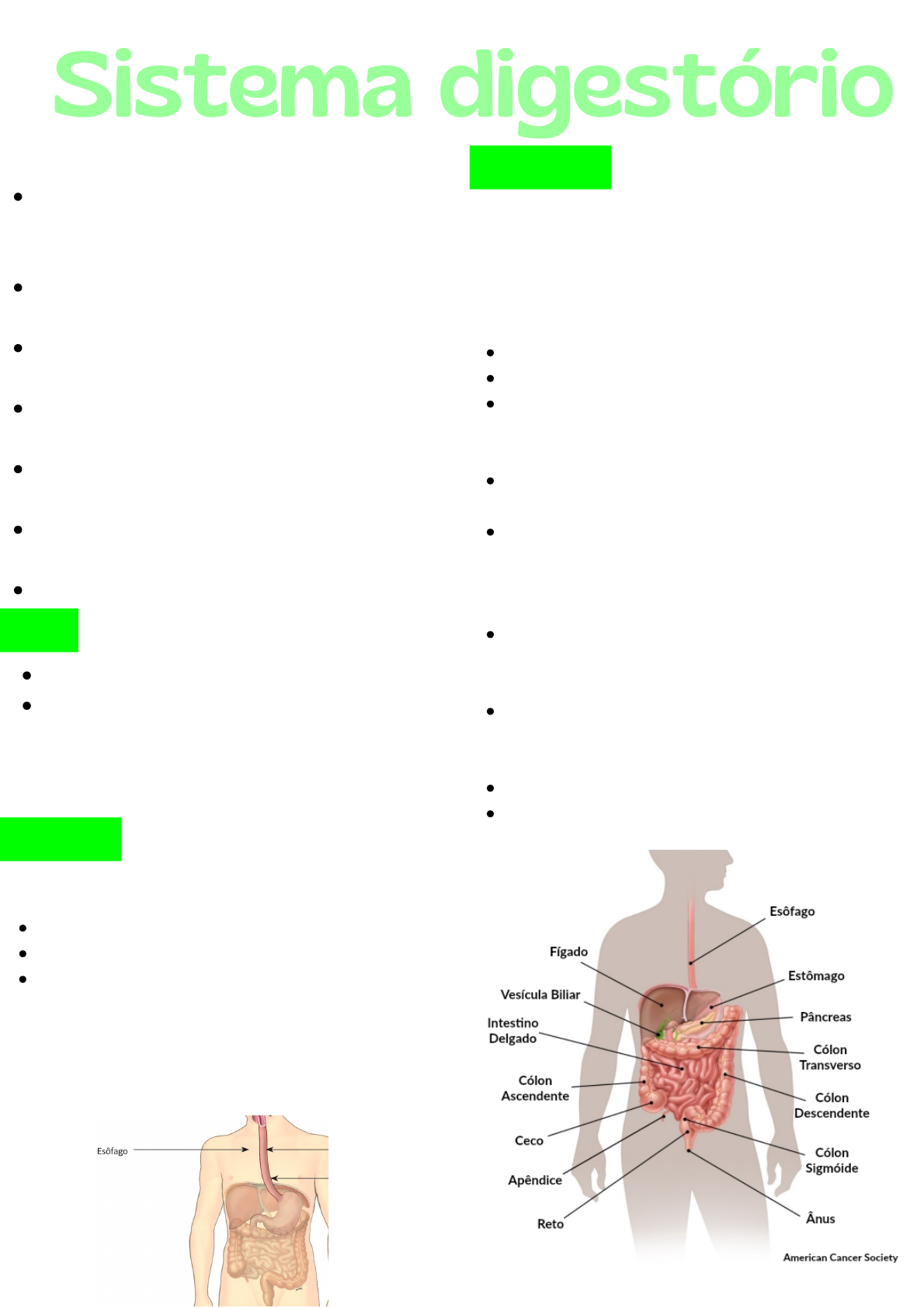 Sistema digestórioSistema digestório Mastigação: Desintegração parcial dos alimentos, processo mecânico e químico. Deglutição: Condução dos alimentos através da faringe para o esôfago. Ingestão: Introdução do alimento no estômago. Digestão: Desdobramento do alimento em moléculas mais simples. Absorção: Processo realizado pelos intestinos. Defecação: Eliminação de substâncias não digeridas do trato gastrointestinal. Funções Dentes: mastigação dos alimentos Língua: tem duas funções, que são a motora e a sensitiva. A motoro vai movimentar o alimento e a sensitiva que proporciona o sabor do alimento. Fundo Corpo Antro-pilórica Óstio cárdia que unem estômago ao esôfago na parte inicial. Óstio piloro: vai unir o estômago com o duodeno. a maior parte do estômago está no quadrante superior esquerdo, superiormente nesse mesmo quadrante está o diafragma. A outra parte está no quadrante superior direito e superiormente está o lóbulo esquerdo do fígado. Parte posterior esquerda está o baço Inferiormente no quadrante esquerdo está o colo transverso do intestino grosso Tubo muscular dilatado que vai armazenar o alimento temporariamente, todo seu revestimento interno tem a capacidade de absorção de pequena quantidade de água. O estômago é dividido em regiões: Possui duas válvulas que são: localização do estômago: Boca Servical Torácico Abdominal Tem aproximadamente 30cm. Ele é dividido em 3 regiões: A parte distal dele vai de encontro ao estômago. Óstio cárdia: tem a função de juntar e levar o alimento até o estômago Esôfago Estomago Duodeno: recebe esse nome por ter seu comprimento aproximadamente igual a largura de 12 dedos. tem aproximadamente 25 cm. É a principal porção do intestino delgado, pois é a região aonde ocorre em torno de 80% da digestão. Jejuno: recebe esse nome porque toda vez que você corta, ele está vazio. Não conseguimos delimitar aonde termina o jejuno, por conta que ele e o ílion possui semelhança entre si. A única diferença entre os dois é que ele é mais largo e tem sua coloração mais forte. Íleo: é a porção que uni o intestino delgado com o grosso é chamado óstio iliocecal. Ele se divide em três regiões Intestino delgado