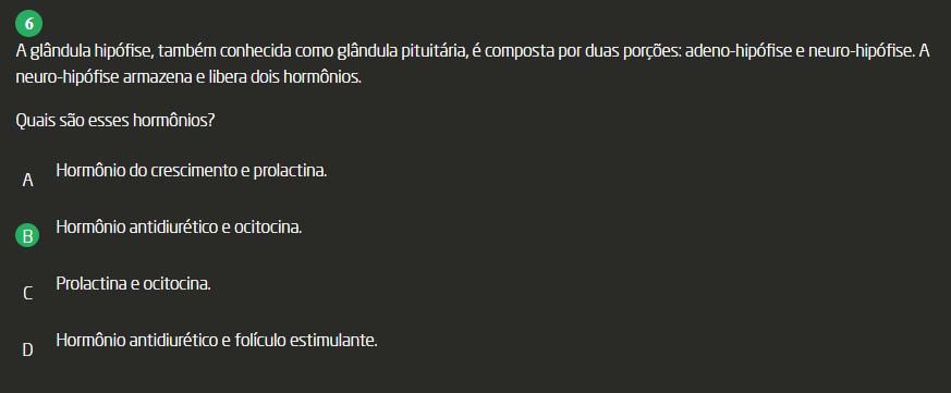A glândula hipófise é composta por duas porções: adeno-hipófise e neuro-hipófise. A neuro-hipófise armazena e libera dois hormônios. A) Hormônio do crescimento e prolactina. Hormônio antidiurético e ocitocina. B) Prolactina e ocitocina. Hormônio antidiurético e folículo estimulante. D) Nenhuma das alternativas.