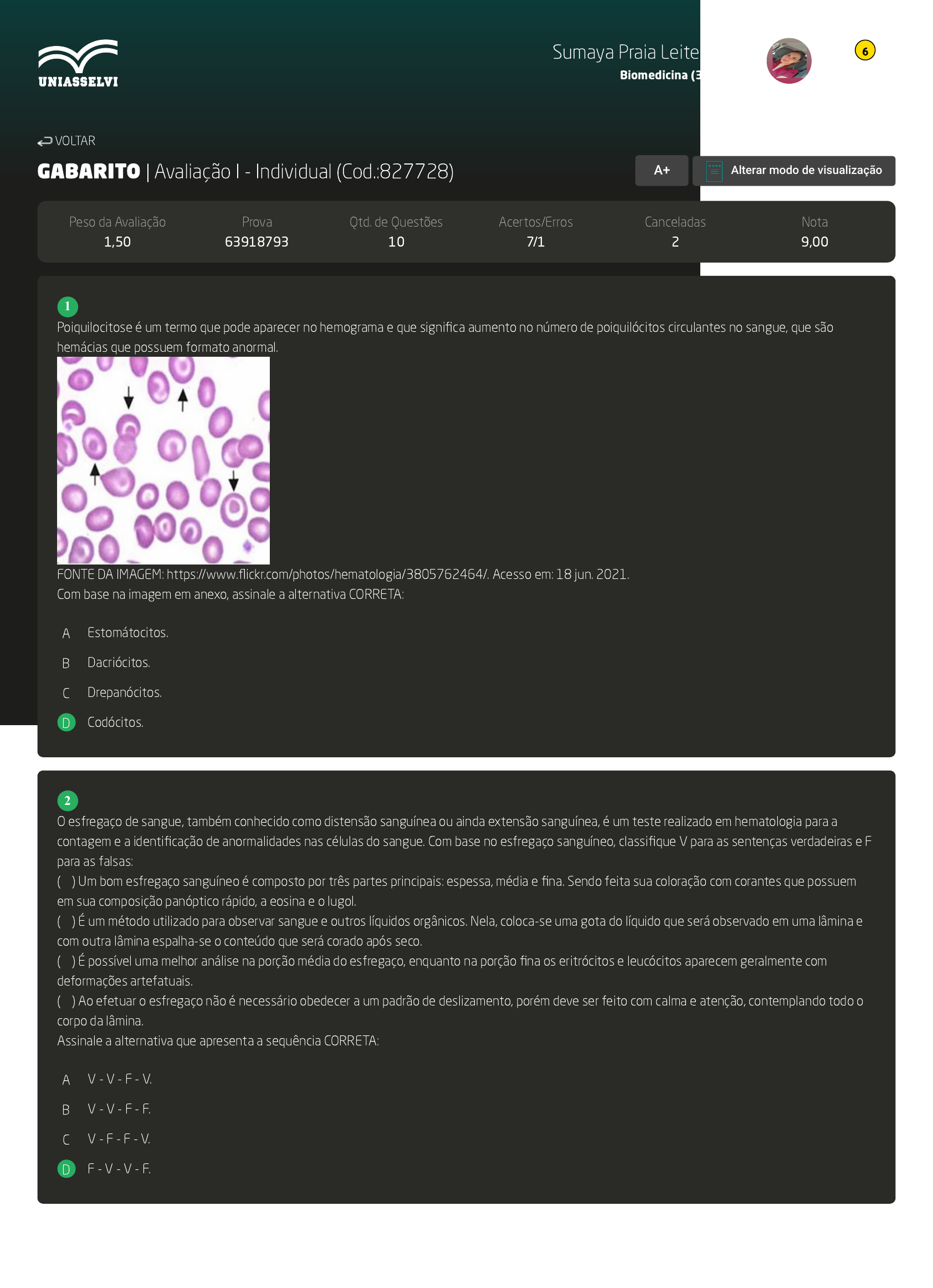 GABARITO | Avaliação I - Individual (Cod.:827728) Peso da Avaliação 1,50 Prova 63918793 Qtd. de Questões 10 Acertos/Erros 7/1 Canceladas 2 Nota 9,00 Poiquilocitose é um termo que pode aparecer no hemograma e que significa aumento no número de poiquilócitos circulantes no sangue, que são hemácias que possuem formato anormal. FONTE DA IMAGEM: https://www.flickr.com/photos/hematologia/3805762464/. Acesso em: 18 jun. 2021. Com base na imagem em anexo, assinale a alternativa CORRETA: A Estomátocitos. B Dacriócitos. C Drepanócitos. D Codócitos. O esfregaço de sangue, também conhecido como distensão sanguínea ou ainda extensão sanguínea, é um teste realizado em hematologia para a contagem e a identificação de anormalidades nas células do sangue. Com base no esfregaço sanguíneo, classifique V para as sentenças verdadeiras e F para as falsas: ( ) Um bom esfregaço sanguíneo é composto por três partes principais: espessa, média e fina. Sendo feita sua coloração com corantes que possuem em sua composição panóptico rápido, a eosina e o lugol. ( ) É um método utilizado para observar sangue e outros líquidos orgânicos. Nela, coloca-se uma gota do líquido que será observado em uma lâmina e com outra lâmina espalha-se o conteúdo que será corado após seco. ( ) É possível uma melhor análise na porção média do esfregaço, enquanto na porção fina os eritrócitos e leucócitos aparecem geralmente com deformações artefatuais. ( ) Ao efetuar o esfregaço não é necessário obedecer a um padrão de deslizamento, porém deve ser feito com calma e atenção, contemplando todo o corpo da lâmina. Assinale a alternativa que apresenta a sequência CORRETA: A V - V - F - V. B V - V - F - F. C V - F - F - V. D F - V - V - F. VOLTAR A+ Alterar modo de visualização 1 2 Sumaya Praia Leite Matos Biomedicina (3264199) 6 Referente ao estudo das hemácias, precisamos levar em consideração suas alterações em forma e tamanho. Nas alterações ocorridas pela forma que a hemácia se apresenta, caracterizamos esse fenômeno de poiquilocitose. Pensando na poiquilocitose, com base nas anomalias e suas possíveis causas, associe os itens, utilizando o código a seguir: I- Micrócito. II- Células em alvo. III- Dacriótico. IV- Acantócito. V- Macrócito. ( ) Abetalipoproteinemia. ( ) Hemoglobinopatia SC. ( ) Anemia ferropriva. ( ) Anemia megaloblástica. ( ) Mielofibrose.Assinale a alternativa que apresenta a sequência CORRETA: A V - III - I - II - IV. B V - II - I - III - IV. C IV - II - I - V - III. D IV - I - II - III - V. [Laboratório Virtual – Coloração de lâmina hematológica] Os corantes utilizados para colorações de lâminas hematológicas são uma mistura de corantes de características neutras, dependentes do pH da solução corante, que em condições apropriadas coram os componentes celulares. É de extrema importância que seja realizada uma coloração apropriada para a correta identificação celular e diagnóstico do paciente. Com relação às observações feitas no experimento de coloração de lâmina hematológica, assinale a alternativa CORRETA: A A lâmina de hematologia deve ser emergida nos recipientes contendo os corantes pelo tempo aproximado de 3 minutos em cada corante. B Se faz necessária a coloração da lâmina hematológica, tendo como objetivo principal corar as células sanguíneas para identificar alterações celulares induzidas por processos infecciosos ou doenças hematológicas, como por exemplo anemias e leucemias. C Nas leituras realizadas na objetiva de 100x não se faz necessário o uso de óleo de imersão. D Após a coloração da amostra, não é necessário realizar a lavagem com água deionizada da lâmina, visto que ela já foi lavada no corante 3. A anemia demonstra que há uma redução da massa ou quantidade total de glóbulos vermelhos em um indivíduo. A massa de glóbulos vermelhos é medida através da dosagem de hemoglobina, que é quem confere a tonalidade avermelhada ao sangue. Existem vários tipos de anemias. Sobre a anemia hemolítica, avalie as asserções a seguir e a relação proposta entre elas: I- Nas anemias hemolíticas imunes, notamos a ação de anticorpos que atingem a membrana eritrocitária, quase sempre distinta de fatores extrínsecos, de causas desconhecidas. PORQUE II- A avaliação laboratorial para a investigação dessa anemia consiste nos testes de coombs direto ou indireto, contagem de reticulócitos, dosagem da bilirrubina indireta e dosagem Desidrogenase Láctica (DHL). Assinale a alternativa CORRETA: A A asserção I é uma proposição verdadeira, e a II é uma proposição falsa. B As asserções I e II são proposições falsas. C A asserção I é uma proposição falsa, e a II é uma proposição verdadeira. D As asserções I e II são proposições verdadeiras, mas a II não é uma justificativa da I. 3 Atenção: Esta questão foi cancelada, porém a pontuação foi considerada. 4 5 Sumaya Praia Leite Matos Biomedicina (3264199) 6 Na sua forma normal, os eritrócitos são encontrados em forma de disco bicôncavo. Em condições patológicas, estes podem assumir formas irregulares, que chamamos de poiquilocitose. FONTE DA IMAGEM: https://www.shutterstock.com/pt/image-photo/echinocyte-702203947. Acesso em: 18 jun. 2021. Com base na imagem anexa, assinale a alternativa CORRETA: A Esquizócitos. B Equinócitos. C Acantócitos. D Macrócitos. Segundo a Organização Mundial de Saúde (OMS), a anemia é definida como a condição na qual o conteúdo de hemoglobina no sangue está abaixo do normal, levando à diminuição da capacidade de transporte de oxigênio. Com base no exposto, classifique V para as sentenças verdadeiras e F para as falsas: ( ) Anemia falciforme é patologia hereditária, por apresentar em seu sistema genético a substituição de adenina por timina (GAG = GTG), causando uma modificação da valina ao invés do ácido glutâmico, ocorrendo distúrb