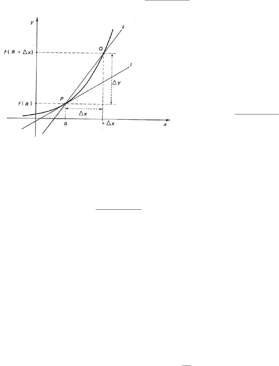 Universidade Federal Fluminense/ Departamento de Análise GAN00145 – Matemática para Economia 1/ Professora Ana Maria Luz / 2001.1 1 A Derivada de uma Função Na aula passada vimos como calcular a derivada de uma função f em um número fixo x=a. f ′(a) = 0∆x lim → ∆x f(a)∆x)f(a −+ Se fizermos ∆x tender a zero, o ponto Q se moverá sobre a curva y = f(x) e tenderá ao ponto P. Além disso, a reta secante s irá girar em torno de P e tenderá para a reta tangente t. Logo, quando ∆x tende a zero, o coeficiente angular de s tende para o coeficiente angular de t, ou seja, mt = 0∆x lim → ∆x f(a)∆x)f(a −+ Vamos mudar nosso ponto de vista e vamos variar o número “a”. Se substituirmos “a” na expressão acima por x, podemos escrever a seguinte definição: Definição 2.3: Dada uma função f(x), a função definida por f ′(x) = 0∆x lim → ∆x f(x)∆x)f(x −+ é chamada de (função) derivada de f(x) Exemplo 3.6 : a) Determine a derivada de f(x) = x2. b) Determine a derivada de f(x) = x3. Observações: 1 – O limite indicado na definição de derivada pode existir para alguns valores de x e deixar de existir para outros. Se o limite existe (é finito) para x = a, dizemos que a função é derivável (diferenciável) em a. Uma função derivável (diferenciável) é aquela que é derivável em cada ponto de seu domínio. O domínio de f ´ é o conjunto {x, f ´(x) existe) e pode ser menor que o domínio de f. 2 – A notação f ′usada na definição anterior tem a vantagem de enfatizar que a derivada de f é uma outra função de x que está associada de certa maneira com a função f dada. Se a função é apresentada na forma y = f(x), com a variável dependente explícita, então o símbolo y′ é usado em lugar de f ′(x). A derivada de y = f(x) é também indicada por dx dy e algumas vezes por Dx y. 2 Interpretação Geométrica: A derivada f ′(x) expressa o coeficiente angular da reta tangente à curva y = f(x) em função da coordenada x do ponto de tangência (desde que o limite exista). Tendo em mente a interpretação geométrica da função derivada a partir do gráfico de uma função f podemos esboçar o gráfico da derivada f ´. Ao lado temos o gráfico de f(x)=x3 e abaixo da sua derivada f(x)=3x2 Taxa de Variação: A derivada f ′(x) expressa a taxa de variação (instantânea) de y = f(x) em relação a x. Em Economia, o termo “marginal” é freqüentemente usado como um sinônimo de “derivada de” ou “taxa de variação instantânea de”. Por exemplo, se C é a função custo tal que C(x) é o custo da produção de x unidades de uma mercadoria, C′(x) é chamado de custo marginal da produção de x unidades e C′ de função custo marginal. Desse modo, o custo marginal é a taxa de variação do custo da produção em relação ao número de unidades produzidas. Lembremos do exemplo da aula passada: Suponha que o custo semanal, em reais, para a fabricação de x geladeiras seja dado pela função C(x) = 8.000 + 400x – 0,2x2 com 0 ≤ x ≤ 400. Determine a taxa de variação da função custo em relação a x quando x = 250. Solução: Queremos determinar a taxa de variação de C(x) em relação a x quando x = 250 0 x lim →∆ x C(250) x) C(250 ∆ −∆+ = 0 x lim →∆ x 500.95x)250(2,0 x) 400(250 8.000 2 ∆ −∆+−∆++ = 0 x lim →∆ x 500.95x0,2x100500.12x 400 100.000 8.000 2 ∆ −∆−∆−−∆++ = 0 x lim →∆ x x0,2 x 300 2 ∆ ∆−∆ = 0 x lim →∆ x x)20, x(300 ∆ ∆−∆ = 0 x lim →∆ x)2,0300( ∆− = 300 Resposta: O custo aumenta R$300,00 por geladeira quando estão sendo fabricadas 250 geladeiras. A operação de encontrar a derivada de uma função é chamada derivação ou diferenciação e pode ser efetuada aplicando-se a definição de derivada. No entanto, como esse processo é usualmente demorado, precisamos de algumas regras (teoremas que são provados a partir da definição de derivada) que possibilitem encontrar a derivada de certas funções mais facilmente. 3 Regras básicas de derivação Sendo c ∈ IR, n ∈ Q e u e v funções reais de variável x. 1) Regra da constante: Se f(x) = c então f ′(x) = 0 2) Regra da identidade: Se f(x) = x então f ′(x) = 1 3) Regra da potência: Se f(x) = xn então f ′(x) = n.xn – 1 4) Regra da soma: Se f(x) = u + v então f ′(x) = u′ + v′ 5) Regra do produto: Se f(x) = uv então f ′(x) = u′v + uv′ 6) Regra do produto por uma constante: Se f(x) = c.u então f ′(x) = c.u′ 7) Regras do quociente: a) Se f(x) = v u e v ≠ 0 então f ′(x) = 2 '' v uv vu − b) Se f(x) = v c e v ≠ 0 então f ′(x) = 2 ' v cv − Exemplos 3.7: 1) f(x) = 5x4 – 2x3 + x2 – 3x 2) f(x) = 3x + 4 x 3) f(x) = (2x + 1)(3x2 + 5x) 4) f(x) = x 1 5) f(x) = 3 2x5 7 6) f(x) = 1 2x 7 5x − + 7) Determine o coeficiente angular da reta tangente ao gráfico de f(x) = x3 – 2x no ponto (– 1, 1). 8) Seja C(x) = 110 + 4x + 0,02x2 o custo de produção de x brinquedos. Determine o custo marginal quando x = 50 9) Se C(x) = 75x + 1250 e R(x) = – x3 + 30x2 são, respectivamente, as funções custo e receita para x unidades de um produto fabricado e vendido por uma empresa, determine a função lucro marginal