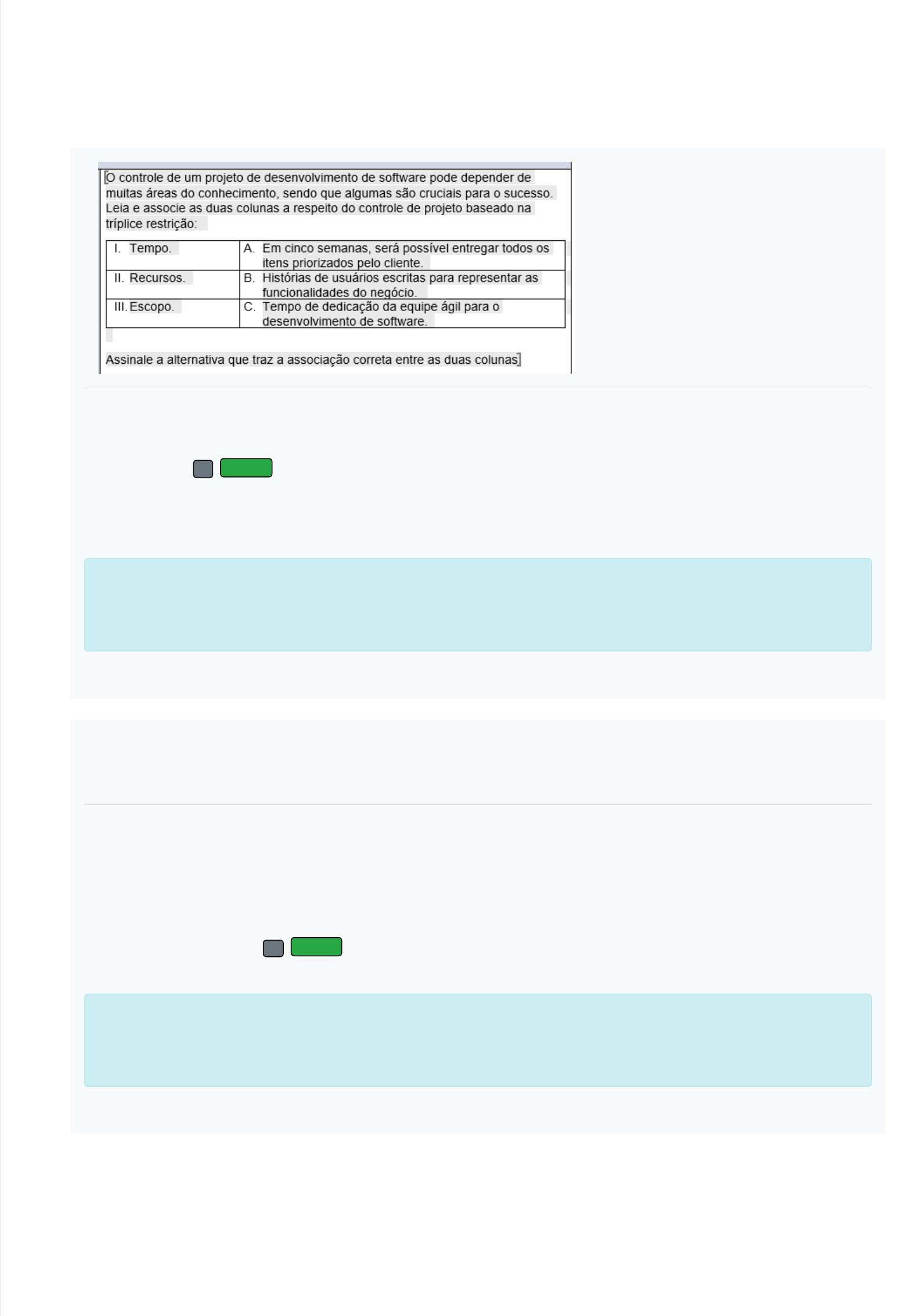09/05/2023, 12:33 Cosmos · Cosmos https://kroton.platosedu.io/lms/m/aluno/disciplina/index/2874927/6553515 1/4 Gerenciamento ágil dos sistemas Professor(a): Marco Ikuro Hisatomi (Mestrado acadêmico) 1) 2) Prepare-se! Chegou a hora de você testar o conhecimento adquirido nesta disciplina. A Avaliação Virtual (AV) é composta por questões objetivas e corresponde a 100% da média final. Você tem até cinco tentativas para “Enviar” as questões, que são automaticamente corrigidas. Você pode responder as questões consultando o material de estudos, mas lembre-se de cumprir o prazo estabelecido. Boa prova! Alternativas: I – C; II – A; III – B. I – A; II – C; III – B. CORRETO I – B; II – C; III – A. I – C; II – B; III – A. I – A; II – B; III – C. Código da questão: 57716 “Quando há envolvimento de times diferentes, uma diferença fundamental entre o desenvolvimento e a evolução é que o primeiro estágio da implementação da mudança requer uma compreensão do programa” (SOMMERVILLE, 2018, p. 235). Qual alternativa corresponde melhor ao objetivo dessa compreensão do programa citada pelo autor? Alternativas: Analisar o custo e o esforço necessário por parte dos usuários para testar o sistema. Analisar o impacto da mudança nas documentações de operação do sistema para o usuário final. Criar um cenário de teste para ser aplicado antes da entrega. Analisar o impacto da mudança para certificar-se de que não afetará outra parte do sistema ou na integração com outros sistemas do mesmo ambiente operacional. CORRETO Analisar os sistemas de mobile, principalmente porque existem muitas instalações. Código da questão: 57774 Resolução comentada: tempo: relaciona-se a prazo; recursos: todos os itens envolvidos necessários para o desenvolvimento do sistema, inclusive os esforços da equipe ágil; escopo: relacionado às regras de negócio do cliente. Resolução comentada: segundo o autor, tecnicamente, o engenheiro de software deve conhecer o suficiente para manter os níveis de qualidade quanto ao funcionamento do sistema e das integrações com outros sistemas. 09/05/2023, 12:33 Cosmos · Cosmos https://kroton.platosedu.io/lms/m/aluno/disciplina/index/2874927/6553515 2/4 3) 4) 5) Alternativas: I – A; II – C; III – B. I – C; II – A; III – B. I – A; II – B; III – C. I – C; II – B; III – A. CORRETO I – B; II – A; III – C. Código da questão: 57733 A disciplina da gestão da qualidade está se tornando mais valorizada no processo de desenvolvimento de sistemas, acrescentando maior garantia de produtos seguros e úteis aos usuários finais. Sobre a camada da sustentação da engenharia de software (PRESSMAN, 2016, p. 16), assinale a alternativa correta. Alternativas: A base da sustentação é o foco na qualidade. CORRETO Entende-se por camada da engenharia de software somente os métodos e processos. A disciplina da gestão da qualidade só depende da cultura organizacional. A camada-base são as ferramentas do desenvolvimento. Métodos da engenharia de software é a base da sustentação. Código da questão: 57745 O dimensionamento quanto ao tamanho de uma história do usuário é importante para o projeto de desenvolvimento de software ágil, por se tratar de características: I. Tamanhos semelhantes/equivalentes tendem a terem eficiência e eficácia na estimativa global do projeto. II. Quanto maior a amplitude de tamanho da história do usuário, o projeto se torna melhor gerenciável. III. Acredita-se que histórias do usuário mais extensas facilitam a sua estimativa. IV. A história do usuário que envolve o maior número de entidades e operações são mais completas e objetivas. V. Uma história do usuário deve ser escrita pelo próprio usuário, garantindo que ele conheça as regras de negócio e determina a prioridade. São verdadeiras: Alternativas: III, IV e V, apenas I, II e V, apenas I e V, apenas CORRETO I, II e IV, apenas Resolução comentada: mudanças de recursos: de origem causada por fator interno. Adaptação às novas tecnologias: de origem causada por fator externo com grande impacto no desenvolvimento de software. Atualização de requisitos: alteração da forma de atribuir pontuação nas provas do aluno. Resolução comentada: a qualidade é conquistada por meio do acúmulo de esforços, com o foco na qualidade (PRESSMAN, 2016), sendo esta a base fundamental da sustentação da engenharia de software. 09/05/2023, 12:33 Cosmos · Cosmos https://kroton.platosedu.io/lms/m/aluno/disciplina/index/2874927/6553515 3/4 6) 7) 8) II e III, apenas Código da questão: 57719 Fazem parte dos fatores que influenciam no custo de um projeto de software, baseado no Cocomo II, conforme o modelo pós-arquitetura, dentre os 17 atributos: ( ) Tamanho da base de dados (do produto). ( ) Complexidade do produto (do produto). ( ) Experiência de aplicação (de pessoal). ( ) Restrição de armazenamento (de plataforma). ( ) Cronograma de desenvolvimento necessário (de projeto). Assinale a alternativa que contenha a sequência correta: Alternativas: F – F – F – V – V. V – V – V – V – V. CORRETO V – V – F – F – V. V – V – V – V – F. V – V – F – V – F. Código da questão: 57730 Pressman (2016, p. 804) afirma que “o tipo mais comum de reengenharia é _____. Alguns sistemas legados têm uma arquitetura de programa razoavelmente sólida, mas os módulos individuais foram codificados de uma maneira que dificulta entendê-los, testá-los e _____. Nesses casos, _____ dentro dos módulos suspeitos pode ser reestruturado”. Escolha a alternativa que preenche corretamente as lacunas. Alternativas: A engenharia direta; reestruturá-los; o código. A reengenharia reversa; mantê-los; a arquitetura. A reestruturação dos dados; alterá-los; as estruturas. A reestruturação dos documentos; atualizá-los; os comentários. A reestruturação de código; mantê-los; o c
