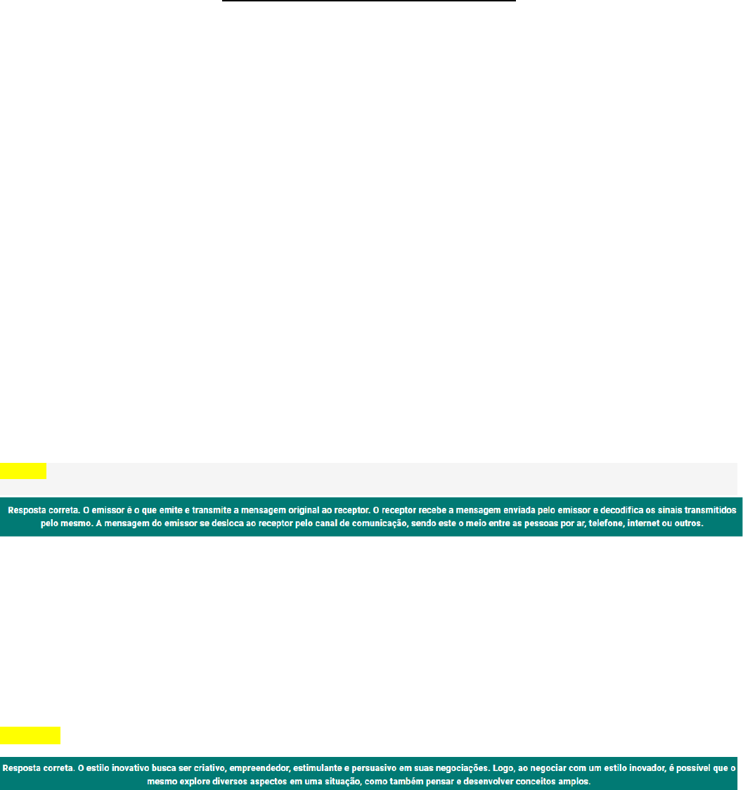 ESTRATÉGIAS DE NEGOCIAÇÃO – N2 Leio o trecho a seguir: “As pessoas negociam sempre, muitas vezes até inconscientemente, mesmo não percebendo que o fazem. Entretanto, são poucas as pessoas que atingem o ápice numa negociação, ou seja, o acordo. Quando negociam, elas mantêm algum tipo de relacionamento, comunicam-se por meio de canais, tornando este processo um caso de comunicação interpessoal.” MARTINELLI, D. P. Negociação empresarial:enfoque sistêmico e visão estratégica. Barueri: Manole, 2002. p. 4. Para que a comunicação seja realizada de forma efetiva, as informações devem ser trocadas de forma clara no canal de comunicação. A partir do exposto, associe tais níveis às suas características: I - Emissor. II. Receptor. III. Canal de comunicação. ( ) É o meio em que ocorre a comunicação entre os indivíduos. ( ) É o que transmite a mensagem original. ( ) É o que recebe e decodifica os sinais transmitidos. A partir das relações feitas anteriormente, assinale a alternativa que apresenta a sequência correta: III, I, II. Leia o trecho a seguir: Os negociadores possuem estilos pessoais; assim, conhecer esses estilos auxilia os mesmos em suas negociações, possibilitando traçar a melhor estratégia em seus negócios, exibindo um comportamento criativo, empreendedor, estimulante e persuasivo que desenvolva conceitos amplos. Sobre o comportamento criativo, assinale a alternativa correta que contemple esse estilo. Inovador Leia o trecho a seguir: “A comunicação está na raiz da evolução do ser humano e foi ela que viabilizou o desenvolvimento da espécie, possibilitando que os indivíduos discutissem suas ideias, expressassem sua visão de mundo, compartilhassem seus desejos e, assim, construíssem uma sociedade organizada na medida do possível e em permanente transformação”. IAMIN, G. P. Negociação: conceitos fundamentais e negócios internacionais. Curitiba: Intersaberes, 2016. p. 33. A partir do texto apresentado e do conteúdo estudado sobre comunicação interpessoal nas negociações, analise as afirmativas a seguir e assinale V para a(s) verdadeira(s) e F para a(s) falsa(s). I. A comunicação é essencial para os negociadores, pois é por intermédio dela que os negociadores se comunicam. II. Para comunicar com outra pessoa, é necessário somente falar, pois o bom negociador explica detalhadamente os seus objetivos. III. A comunicação entre os negociadores pode ocorrer por meio de várias ações, como a fala, a escrita e a linguagem corporal. IV. Para a comunicação das negociações ser completa, é necessário esclarecer dúvidas e dar retorno do que está sendo entendido do assunto. Assinale a alternativa que apresenta a sequência correta. V, F, V, V Leia o trecho a seguir: “Se uma pessoa organizada consegue ser muito mais produtiva, em uma empresa, a organização pode trazer resultados ainda mais promissores. Uma empresa organizada consegue estruturar seu planejamento estratégico e atingir seus objetivos. Um caminho para conseguir isso é dividir sua empresa em áreas e atribuir as atividades que deverão ser executadas e os responsáveis por cada uma delas. Com isso, é possível ter resultados e, consequentemente, mais eficiência nos trabalhos realizados, evitando atropelos”. SEBRAE. Organização. Como organizar sua empresa. Saiba como ter um negócio mais produtivo e eficiente por meio de organização e divisão de tarefas. [2020]. Disponível em: https://www.sebrae.com.br/sites/PortalSebrae/ufs/sp/cursos_eventos/como-organizar-sua-empresa,9982f8ba5a17a510VgnVCM1000004c00210aRCRD. Acesso em: 10 abr. 2020. A partir do apresentado, analise as asserções a seguir e a relação proposta entre elas. I. Os departamentos são classificados como áreas, setores e segmentos. Pois: II. São resultantes do agrupamento das atividades desenvolvidas por um determinado setor. As asserções I e II são proposições verdadeiras, e a II é uma justificativa correta da I Leia o excerto a seguir sobre a negociação integrativa. “No caso do ganha-ganha, como o nome indica, ambas as partes saem ganhando. Em outras palavras, pode-se dizer que o acordo é favorável a todos na negociação. Todas as estratégias usadas e estabelecidas procuram um consenso para que todos se sintam confortáveis nas condições estabelecidas.” VASQUES, E. F. (org.). Negociação comercial. São Paulo: Pearson Education do Brasil, 2015. p. 95. A partir do excerto apresentado e do conteúdo estudado sobre a negociação integrativa, assinale a alternativa correta. As questões envolvidas na negociação integrativa são múltiplas. Leia o texto a seguir: “O conceito de comunicação está sujeito a algumas complicações adicionais quando se trata da comunicação humana. Cada pessoa tem seu próprio sistema cognitivo, suas percepções, seus valores pessoais e suas motivações, construindo um padrão pessoal de referência que torna bastante singular sua interpretação das coisas.” DAYCHOUM, M. Negociação conceitos e técnicas. Rio de Janeiro: Brasport, 2016. p. 19. A partir do apresentado, analise as asserções a seguir e a relação proposta entre elas. I. O canal de comunicação é o meio utilizado na comunicação interpessoal entre emissor e receptor, para a troca de mensagens. Pois: II. Este meio possibilita que as empresas realizem a sua comunicação com os seus negociadores e/ou clientes da melhor forma possível, por meio do ar, da internet, da televisão, do rádio, do jornal e de outros elementos. As asserções I e II são proposições verdadeiras, e a II é uma justificativa correta da I. Leia o texto a seguir: “Com efeito, é muito difícil identificarmos precisamente qual é o primeiro movimento que ocorre em uma negociação, mas certamente podemos afirmar que ele acontece bem antes do momento no qual os participantes se encontram pessoalmente. [...] No caso da negociação empresarial, podemos indicar que o primeiro 