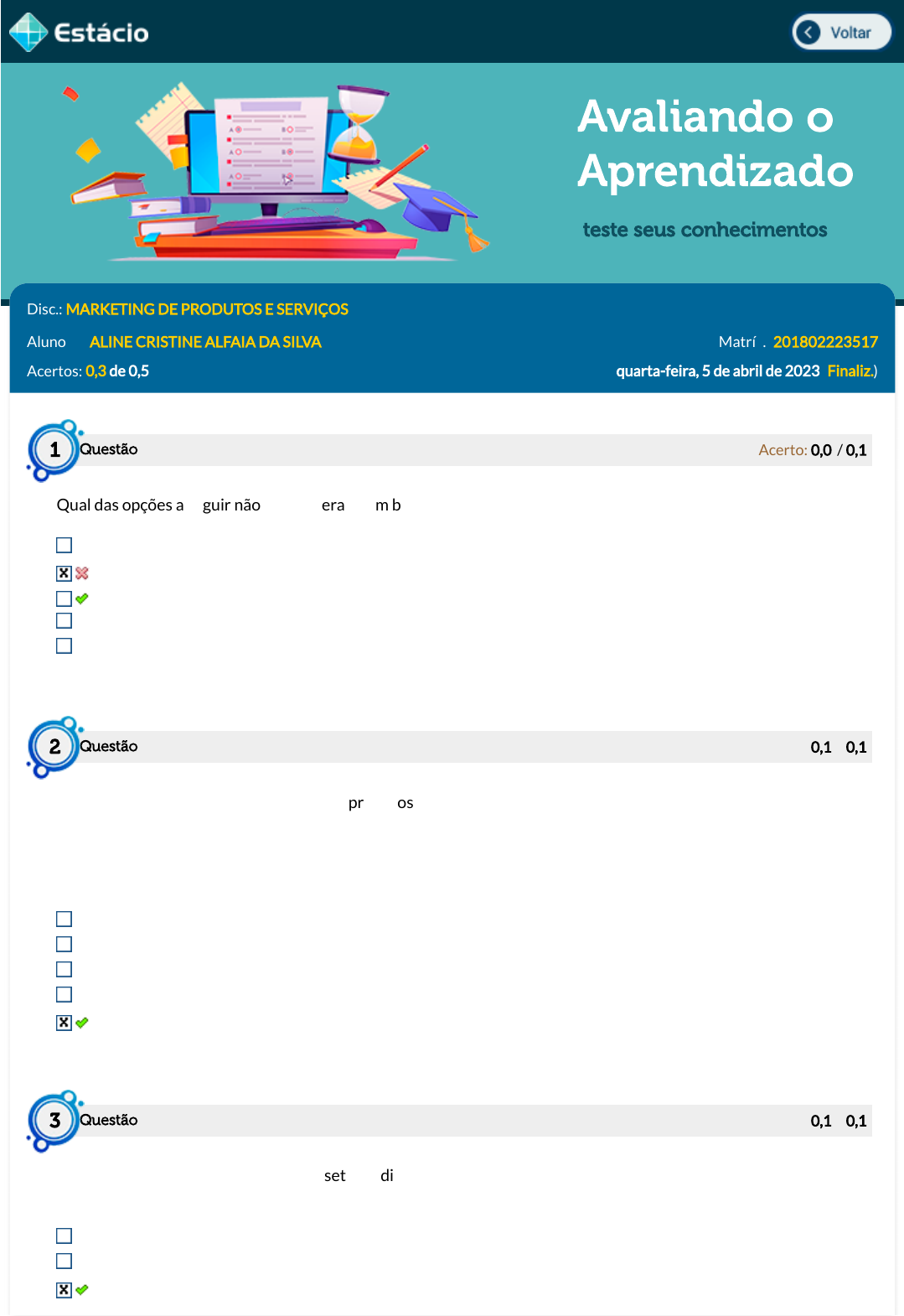 Avaliando o Aprendizado teste seus conhecimentos Disc.: MARKETING DE PRODUTOS E SERVIÇOS Aluno(a): ALINE CRISTINE ALFAIA DA SILVA Matríc.: 201802223517 Acertos: 0,3 de 0,5 quarta-feira, 5 de abril de 2023 (Finaliz.) Acerto: 0,0 / 0,1 Qual das opções a seguir não é considerado um bem de consumo? Bens de compra. Bens não procurados. Bens de capital. Bens especiais. Bens de conveniência. Respondido em 05/04/2023 13:58:44 Acerto: 0,1 / 0,1 Se uma empresa expande suas vendas de produtos existentes em um mercado em crescimento, intensi�cando a distribuição e promoção de produtos, com preços mais competitivos, está usando qual estratégias de marketing de bens? Assinale a alternativa que responde corretamente à pergunta. Desenvolvimento de produtos. Diversi�cação. Desenvolvimento do mercado. Desenvolvimento de serviços. Penetração no mercado. Respondido em 06/04/2023 14:18:15 Acerto: 0,1 / 0,1 A economia pode ser dividida em três setores distintos: o primário, o secundário e o terciário. Assinale a alternativa que apresenta corretamente uma atividade exercida pelo terceiro setor. Produção de bens de consumo. Pecuária. Exercício da Medicina. Questão1 Questão2 Questão3 https://simulado.estacio.br/alunos/inicio.asp javascript:voltar(); Geração de energia. Extrativismo mineral. Respondido em 05/04/2023 14:04:39 Acerto: 0,1 / 0,1 De acordo com Kotler & Keller (2019), o comportamento do consumidor é in�uenciado por fatores culturais, sociais e pessoais. Assim, as marcas precisam conhecer a jornada do cliente, para que possam oferecer o produto ou serviço certo, na hora certa. Assinale a alternativa correta em relação aos fatores que motivam a escolha de compra do consumidor: o marketing precisa estar atento à tendência crescente do consumidor em decidir comprar apenas pela in�uência da propaganda e não pelas in�uências culturais, sociais e pessoais as in�uências familiares e de outras instituições não chegam a ser determinantes nos desejos e no comportamento de um consumidor as decisões de compra também são in�uenciadas por características pessoais como idade, ocupação, circunstâncias econômicas, personalidade, autoimagem e estilo de vida as pessoas têm sua opinião própria em relação a produtos e serviços e os grupos de referência não fazem grande diferença na formação de suas escolhas a escolha de um produto ou de uma marca raramente é afetada pelas circunstâncias econômicas do consumidor Respondido em 06/04/2023 14:27:14 Acerto: 0,0 / 0,1 Telecine investe na experiência do usuário para Conteúdo 29/09/2020 O Telecine como hub de cinema tem o objetivo de contemplar não só a pluralidade da indústria, mas também atender aos mais diversos per�s de usuários. A plataforma passou a oferecer 28 opções de avatares para o usuário personalizar o seu acesso ao serviço de streaming. Essa atualização surgiu a partir do pedido de uma usuária que buscava mais opções disponíveis. Outro exemplo foi a inclusão de legendas em português na sessão de Bacurau, que aconteceu no YouTube do Telecine em celebração ao Dia do Cinema Brasileiro e reuniu cerca de 200 mil espectadores, atendendo a um pedido de de�cientes auditivos que utilizam as legendas como importante ferramenta de inclusão. (Fonte: Portal Mundo do Marketing, 29.09.2020) Com base no artigo, avalie as a�rmativas a seguir: I. O Telecine busca �delizar seus públicos e aumentar a credibilidade da empresa investindo em marketing de serviços. II. Ao atender pedidos de segmentos menores do mercado, o Telecine descarta outros potenciais clientes que poderiam se tornar assinantes do canal. III. Quando o Telecine oferece legendas a pedido de de�cientes auditivos, demonstra uma fragilidade em seu marketing de relacionamento. Assinale a alternativa correta: I, II e III estão corretas Apenas II está correta I e III estão corretas Apenas I está correta II e III estão corretas Respondido em 06/04/2023 14:26:08 Questão4 Questão5