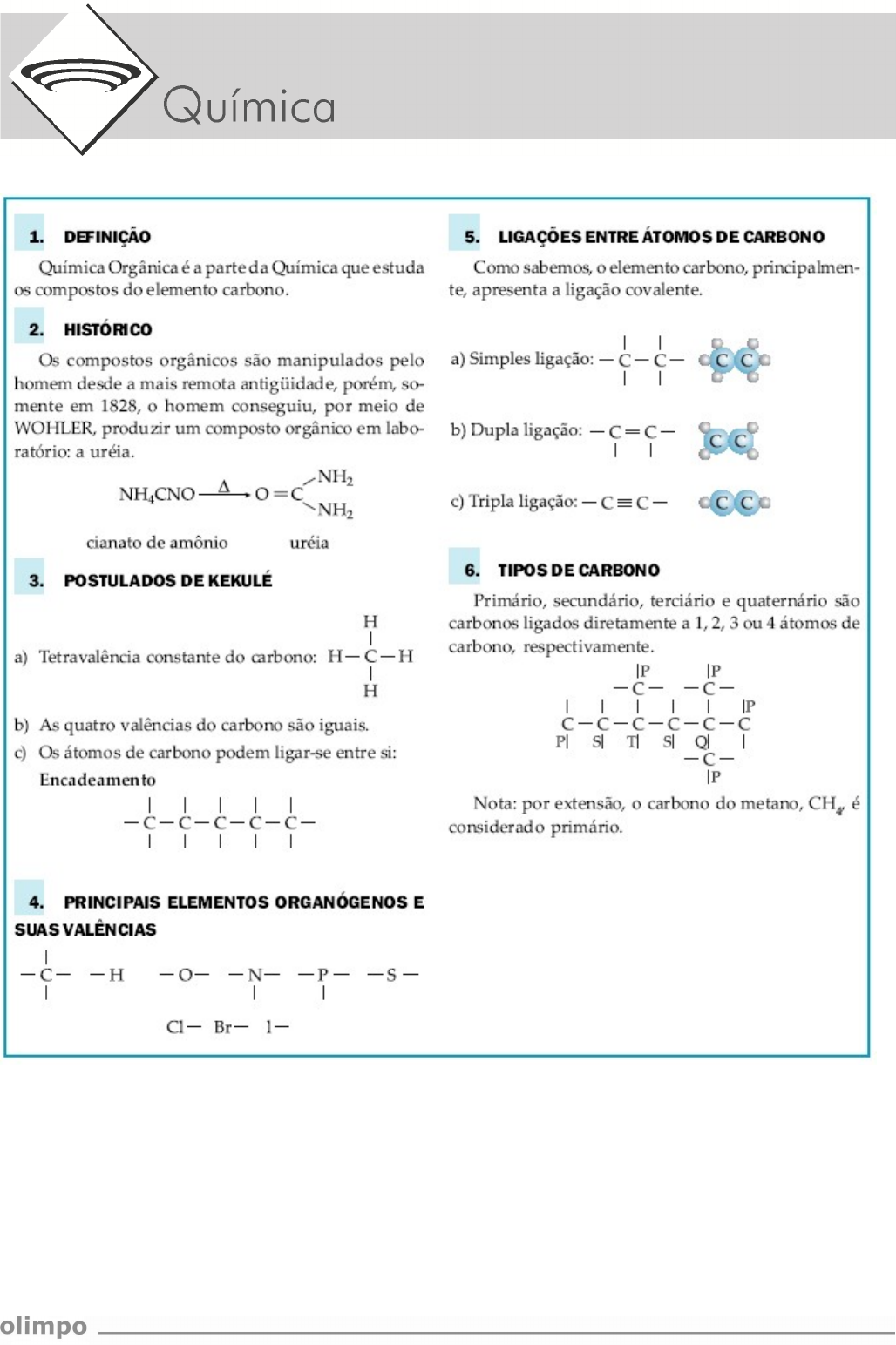 INTRODUÇÃO À QUÍMICA ORGÂNICA Avaliação Produtiva 2 EXERCÍCIOS DE APLICAÇÃO 01. (Vunesp-SP) Para os químicos dos séculos 18 e 19, os compostos orgânicos proviriam somente de se- res vivos e os inorgânicos dos materiais inanimados, como os minerais. A produção de substâncias orgânicas pelos seres vivos estaria associada a uma “força vital”. Em 1828, Wöhler obteve a ureia (H2NCONH2), constituinte típico da urina, a partir do aquecimento do composto inorgânico cianato de amônio (NH4 +NCO–). a) Escreva a equação química da reação de Wöhler e classifique as duas substâncias, de acordo com suas funções químicas. b) Explique por que a experiência de Wöhler colocou em dúvida a teoria da “força vital”. 02. (UERJ-RJ) “O Ministério da Saúde adverte: fumar pode causar câncer de pulmão.” Um dos responsáveis por esse mal causado pelo cigarro é o alcatrão, que corresponde a uma mistura de substâncias aromáticas, entre elas o benzeno, naftaleno e antraceno. As fórmulas moleculares dos três hidrocarbonetos citados são, respectivamente: a) C6H12, C12H12, C18H20 b) C6H12, C12H10, C18H18 c) C6H6, C10H10, C14H14 d) C6H6, C10H8, C14H10 03. (Mackenzie-SP) O inseticida dicloro-difenil-tricloroetano (DDT), cuja fórmula estrutural é apresenta: a) três carbonos terciários. b) somente carbonos secundários. c) um carbono quaternário. d) somente carbonos primários. e) somente um carbono terciário Exercícios Complementares 3 04. (UNB-DF) Entre as substâncias normalmente usadas na agricultura, encontram-se o nitrato de amônio (fertilizante), o naftaleno (fumigante de solo) e a água. A fórmula estrutural do naftaleno, nome científico da naftalina, é mostrada na figura adiante. Acerca dessas substâncias, julgue os itens a seguir. 1) A fórmula molecular do naftaleno é C10H10. 2) As substâncias citadas são moleculares. 3) Em uma molécula de naftaleno, há dezesseis ligações covalentes simples entre os átomos de carbono. 05. (UERJ-RJ) A maior parte das drogas nos anticoncepcionais de via oral é devido à fórmula estrutural plana, abaixo, incompleta: Qual alternativa abaixo é correta? a) Faltam 12 hidrogênios na estrutura. b) É um composto quaternário. c) Apresenta fórmula molecular C12H10O2N. d) Não é um composto orgânico. e) Apresenta somente 1 carbono primário. 06. (FEI-SP) A fenolftaleína pode ser obtida a partir da reação entre anidrido ftálico e o fenol. Qual o número de carbono terciário presente na molécula de fenolftaleína? a) 2 b) 3 c) 4 d) 5 e) 6 07. (UFPB-PB) Na fórmula do veronal abaixo (um barbitúrico), os números de carbonos primários, secundários, terciários e quaternários são, respectivamente: a) 5, 2, 0, 1 b) 4, 2, 0, 1 c) 4, 2, 1, 1 d) 2, 2, 2, 1 e) 3, 4, 0, 0 Avaliação Produtiva 4 08. Julgue os itens abaixo. 1. O número de compostos orgânicos conhecidos é maior que o de inorgânicos. 2. São elementos organógenos: C, H, O e N. 04. Os compostos orgânicos têm muita resistência ao calor. 08. O carbono é trivalente. 16. O carbono é um dos poucos elementos químicos capazes de formar cadeias. 32. Wöhler, em 1828, obteve ureia em laboratório, por meio de uma reação que abalou profundamente a teoria da força vital. E tal obtenção, ele partiu do aquecimento de cianeto de amônio. 64. Atualmente, a Química Orgânica estuda apenas os compostos sintetizados por seres vivos. Soma ( ) 09. Quantos átomos de carbono secundário há no composto? a) 1 b) 2 c) 3 d) 4 e) 5 10. Dadas as cadeias carbônicas, quantos átomos de hidrogênio faltam nessas estruturas? 11. (UFSE-SE) Wöhler conseguiu realizar a primeira síntese de substância dita “orgânica” a partir de uma substância dita “inorgânica”. A substância obtida por Wöhler foi: a) ureia. b) ácido úrico. c) ácido cítrico. d) vitamina C. e) acetona. 12. Completar as ligações que faltam, com átomos de hidrogênio. 13. Completar as ligações que faltam, colocando simples, dupla ou tripla ligação. Exercícios Complementares 5 14. (Cesulon-PR) O composto de fórmula estrutural: apresenta compostos primários, secundários, terciários e quaternários, respectivamente: a) 7, 3, 1, 1 b) 7, 4, 1, 1 c) 6, 3, 1, 1 d) 5, 4, 1, 1 e) 7, 4, 1, 3 15. (UFSC-SC) Assinale, abaixo, o(s) composto(s) tipicamente orgânico(s). Soma ( ) Avaliação Produtiva 6 16. (Uniube-MG) O ácido úrico é o produto final da excreção da degradação de purinas. As doenças gota, leucemia, policetemia e hepatite resultam numa excreção aumentada desta molécula representada pela fórmula estrutural: A fórmula molecular do ácido úrico é: a) C5H4N4O3 b) C5H4N3O6 c) C5H3N3O3 d) C4H6N2O2 e) C4H5N4O3 17. (UFPR-PR) A respeito dos compostos orgânicos, é correto afirmar que: 1. os compostos orgânicos podem ser sintetizados pelos organismos vivos, daí a qualificação de orgânicos. 2. os compostos orgânicos são compostos de carbono, embora algumas substâncias que contêm esse elemento sejam estruturadas também entre os compostos inorgânicos (CO2, HCN, etc.). 04. a existência de um grande número de compostos de carbono está relacionada com a capacidade do átomo de carbono de formar cadeias, associada à sua tetracovalência. 08. nos compostos de carbono o tipo de ligação mais frequente é a covalente. 16. os compostos orgânicos são regidos por leis e princípios próprios não aplicáveis aos compostos inorgânicos. Soma ( ) 18. (Fuvest-SP) Cite dois procedimentos experimentais para distinguir uma amostra de composto inorgânico e outra amostra de composto orgânico, ambas sólidas. Explique sua resposta. 19. No eugenol, composto de odor agradável de fórmula: e utilizado como anti-séptico bucal, o número de átomos de carbono secundário é: a) 2 b) 7 c) 10 d) 3 e) 8 20. (UNITAU-SP) Observe a fórmula As quantidades totais de átomos de carbono primário, secundário e terciário são, respectivamente: a) 5, 2 e 2. b) 3, 2 e 2. c) 3