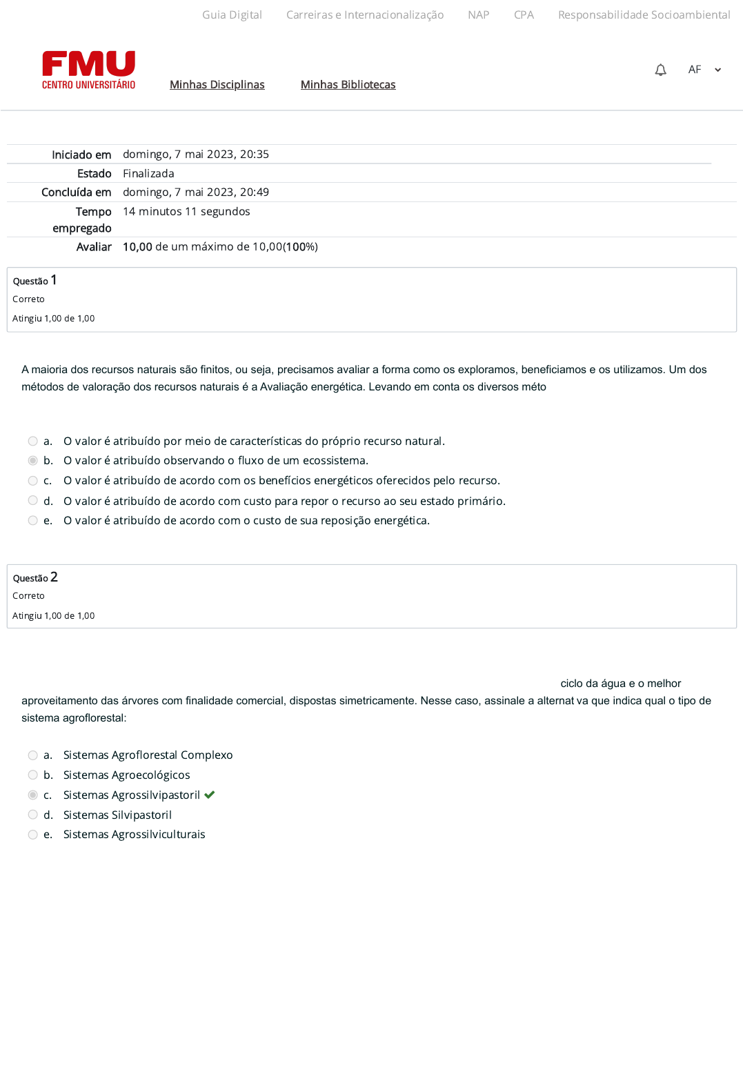 07/05/2023 20:49 Atividade 4 (A4): Revisão da tentativa https://ambienteacademico.com.br/mod/quiz/review.php?attempt=2162856&cmid=783280 1/5 Iniciado em domingo, 7 mai 2023, 20:35 Estado Finalizada Concluída em domingo, 7 mai 2023, 20:49 Tempo empregado 14 minutos 11 segundos Avaliar 10,00 de um máximo de 10,00(100%) Questão 1 Correto Atingiu 1,00 de 1,00 Questão 2 Correto Atingiu 1,00 de 1,00 A maioria dos recursos naturais são finitos, ou seja, precisamos avaliar a forma como os exploramos, beneficiamos e os utilizamos. Um dos métodos de valoração dos recursos naturais é a Avaliação energética. Levando em conta os diversos métodos existentes, assinale a alternativa que melhor descreve o método citado: a. O valor é atribuído por meio de características do próprio recurso natural. b. O valor é atribuído observando o �uxo de um ecossistema. c. O valor é atribuído de acordo com os benefícios energéticos oferecidos pelo recurso. d. O valor é atribuído de acordo com custo para repor o recurso ao seu estado primário. e. O valor é atribuído de acordo com o custo de sua reposição energética. Nos sistemas agroflorestais (SAFs) é fundamental agregar benefícios entre os diversos elementos presentes no ambiente. Em determinada situação temos em vista a criação de animais com um microclima adequado, gerar uma influência positiva no ciclo da água e o melhor aproveitamento das árvores com finalidade comercial, dispostas simetricamente. Nesse caso, assinale a alternativa que indica qual o tipo de sistema agroflorestal: a. Sistemas Agro�orestal Complexo b. Sistemas Agroecológicos c. Sistemas Agrossilvipastoril d. Sistemas Silvipastoril e. Sistemas Agrossilviculturais Guia Digital Carreiras e Internacionalização NAP CPA Responsabilidade Socioambiental Minhas Disciplinas Minhas Bibliotecas AF https://codely-fmu-content.s3.amazonaws.com/Moodle/GuiaDigital/Guia+digital/index.html https://carreiras.fmu.br/ https://codely-fmu-content.s3.amazonaws.com/Moodle/NAP/inicial/nap/fmu/index.html https://codely-fmu-content.s3.amazonaws.com/Moodle/CPA/landing_CPA/index.html https://portal.fmu.br/sustentabilidade https://ambienteacademico.com.br/ https://ambienteacademico.com.br/ https://ambienteacademico.com.br/course/view.php?id=236 07/05/2023 20:49 Atividade 4 (A4): Revisão da tentativa https://ambienteacademico.com.br/mod/quiz/review.php?attempt=2162856&cmid=783280 2/5 Questão 3 Correto Atingiu 1,00 de 1,00 Questão 4 Correto Atingiu 1,00 de 1,00 Leia o excerto a seguir: “Problemas de sanidade e de produtividade, observados em SAFs do Projeto RECA na Amazônia (Reflorestamento Econômico Consorciado Adensado), evidenciam as dificuldades de manejo quando os agricultores não conhecem a dinâmica e o consórcio das espécies locais e priorizam as comerciais, diminuindo a biodiversidade do sistema. Por isso, os SAFs devem ser implantados e manejados conforme o conhecimento dos agricultores [...]”. PALUDO, Rafael. COSTABEBER, José Antônio. Sistemas agroflorestais como estratégia de desenvolvimento rural em diferentes biomas brasileiros. Rev. Bras. de Agroecologia. v. 7, n. 2, 2012, p. 74. Em relação às limitações na implementação dos SAFs como método de recuperação ecológica, analise as afirmativas a seguir e assinale V para a(s) Verdadeira(s) e F para a(s) Falsa(s). I. ( ) A maioria dos técnicos e engenheiros agrícolas são capacitados para implementação dos SAFs para recuperação e conservação ecológica. II. ( ) Para que os SAFs se tornem uma escolha viável para muitos produtores é preciso ampliar os consórcios de crédito rural nesse segmento. III. ( ) Tendo em vista a quantidade de informação a respeito dos SAFs atualmente é a primeira opção dos consumidores. IV. ( ) Para que as iniciativas em SAFs ofereçam os resultados necessários, o planejamento tem que atender a gestão, produção e comercialização de acordo com as necessidades desse sistema e peculiaridades da área. Assinale a alternativa que apresenta a sequência correta: a. V, V, V, V. b. F, V, F, V. c. V, V, F, V. d. F, F, F, F. e. V, V, F, F. Em um sentido generalista ou global, o crescimento populacional vem ocorrendo sem o devido planejamento, o que gera um impacto ambiental. Com esse aumento exponencial, aumenta-se o consumo e consequentemente a necessidade de produção de alimentos, pensando-se também nas formas que esses alimentos estão sendo produzidos e ofertados. Indique os três parâmetros que permitem equacionar essa forma de impacto: a. População, Estabilidade e Consumo. b. População, Consumo e Tecnologia. c. Equanimidade, Consumo e Tecnologia. d. Equanimidade, Estabilidade e Consumo. e. População, Equanimidade e Tecnologia. Guia Digital Carreiras e Internacionalização NAP CPA Responsabilidade Socioambiental Minhas Disciplinas Minhas Bibliotecas AF https://codely-fmu-content.s3.amazonaws.com/Moodle/GuiaDigital/Guia+digital/index.html https://carreiras.fmu.br/ https://codely-fmu-content.s3.amazonaws.com/Moodle/NAP/inicial/nap/fmu/index.html https://codely-fmu-content.s3.amazonaws.com/Moodle/CPA/landing_CPA/index.html https://portal.fmu.br/sustentabilidade https://ambienteacademico.com.br/ https://ambienteacademico.com.br/ https://ambienteacademico.com.br/course/view.php?id=236 07/05/2023 20:49 Atividade 4 (A4): Revisão da tentativa https://ambienteacademico.com.br/mod/quiz/review.php?attempt=2162856&cmid=783280 3/5 Questão 5 Correto Atingiu 1,00 de 1,00 Questão 6 Correto Atingiu 1,00 de 1,00 Leia o trecho a seguir: “A diversidade de espécies encontradas na forma de sementes dispersadas, dormentes no solo ou plântulas, indica o estado de conservação do ecossistema e a sua capacidade de auto regeneração ou resiliência, cujo grau pode determinar a necessidade de intervenção humana. ” CHAMI, Luciane Belmonte et al., Mecanismos de regeneração natural em diferentes ambientes de remanescente de Floresta Ombrófila Mista, São Francisc