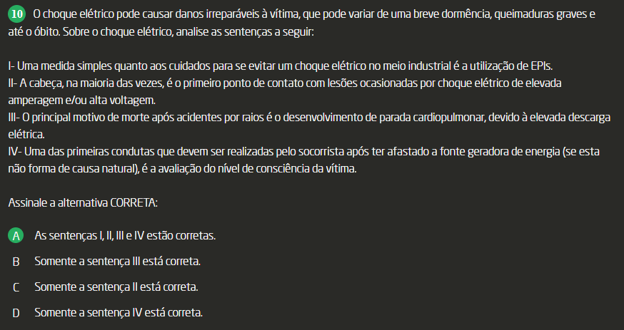 I- Uma medida simples quanto aos cuidados para se evitar um choque elétrico no meio industrial é a utilização de EPIs. II- A cabeça, na maioria das vezes, é primeiro ponto de contato com lesões ocasionadas por choque elétrico de elevada amperagem e/ou alta voltagem. III- O principal motivo de morte após acidentes por raios é o desenvolvimento de parada cardiopulmonar, devido à elevada descarga elétrica. IV- Uma das primeiras condutas que devem ser realizadas pelo socorrista após ter afastado a fonte geradora de energia (se esta não for a causa) é a avaliação do nível de consciência da vítima. A) As sentenças I, II, III e IV estão corretas. B) Somente a sentença III está correta. C) Somente a sentença II está correta. D) Somente a sentença IV está correta.