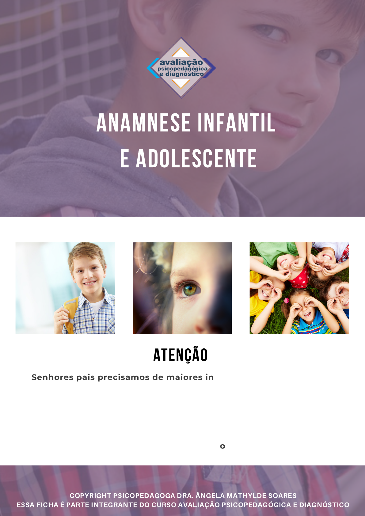 ANAMNESE INFANTIL E ADOLESCENTE Atenção Senhores pais precisamos de maiores informações sobre seu filho para assisti-lo com maior qualidade. Toda a equipe de professores, diretora, psicóloga e outros profissionais desta escola terão acesso a estes dados e poderão assim, conhecer melhor esta criança. Qualquer dúvida entre em contato com nossa equipe. COPYRIGHT PSICOPEDAGOGA DRA. ÂNGELA MATHYLDE SOARES ESSA FICHA É PARTE INTEGRANTE DO CURSO AVALIAÇÃO PSICOPEDAGÓGICA E DIAGNÓSTICO INFORMAÇÕES DE IDENTIFICAÇÃO DA CRIANÇA NOME DA CRIANÇA: DATA DE NASCIMENTO: IDADE: SEXO: ( ) F ( ) M COPYRIGHT PSICOPEDAGOGA DRA. ÂNGELA MATHYLDE SOARES ESSA FICHA É PARTE INTEGRANTE DO CURSO AVALIAÇÃO PSICOPEDAGÓGICA E DIAGNÓSTICO ENDEREÇO: TELEFONE: ( ) TELEFONE: ( ) ACOMPANHADO POR: ESTUDA: ( ) SIM ( ) NÃO INSTITUIÇÃO ESCOLARIDADE: ESCOLA: (PARTICULAR OU PÚBLICA) FILIAÇÃO PAI: MÃE: PROFISSÃO E ESCOLARIDADE DOS PAIS: PRINCIPA IS INFORMAÇÕES FORNECIDAS PELO PA IS / FAMILIARES QUEIXA PRINCIPAL: HISTÓRIA DA QUEIXA (INICIO DO PROBLEMA, EVOLUÇÃO CLÍNICA) COPYRIGHT PSICOPEDAGOGA DRA. ÂNGELA MATHYLDE SOARES ESSA FICHA É PARTE INTEGRANTE DO CURSO AVALIAÇÃO PSICOPEDAGÓGICA E DIAGNÓSTICO 1. infância REFLUXO: ( ) SIM ( ) NÃO OBS.: ALEITAMENTO: ( ) SEIO DURAÇÃO: ______ ANOS _____ MÊS (ES) ( ) MAMADEIRA – QUAL BICO? ( ) COMUM ( ) ORTODÔNTICO DURAÇÃO: ______ ANOS _____ MÊS (ES) USOU BICO: ( ) SIM ( ) NÃO ( ) QUAL BICO? ( ) COMUM ( ) ORTODÔNTICO NÃO DURAÇÃO: ______ ANOS _____ MÊS (ES) 1. Desenvolvimento da Linguagem EM QUAL IDADE A CRIANÇA: BALBUCIOU: ______ ANOS _____ MÊS (ES) ( ) NÃO SABE OU NÃO LEMBRA PRONUNCIOU A PRIMEIRA PALAVRA: ______ ANOS _____ MÊS (ES) ( ) NÃO SABE OU NÃO LEMBRA DISSE A PRIMEIRA FRASE: : ______ ANOS _____ MÊS (ES) ( ) NÃO SABE OU NÃO LEMBRA A CRIANÇA SE COMUNICA ATRAVÉS DE: ( ) GESTOS ( ) PALAVRAS ( ) PALAVRAS E GESTOS ( ) OUTROS COPYRIGHT PSICOPEDAGOGA DRA. ÂNGELA MATHYLDE SOARES ESSA FICHA É PARTE INTEGRANTE DO CURSO AVALIAÇÃO PSICOPEDAGÓGICA E DIAGNÓSTICO 2. Desenvolvimento motor EM QUAL IDADE A CRIANÇA COMEÇOU A: ARRASTAR: ______ ANOS _____ MÊS (ES) ( ) NÃO SABE OU NÃO LEMBRA CONTROLE CERVICAL E ESCAPULAR: ______ ANOS _____ MÊS (ES) ( ) NÃO SABE OU NÃO LEMBRA ENGATINHAR: ______ ANOS _____ MÊS (ES) ( ) NÃO SABE OU NÃO LEMBRA SENTAR: ______ ANOS _____ MÊS (ES) ( ) NÃO SABE OU NÃO LEMBRA ANDAR: ______ ANOS _____ MÊS (ES) ( ) NÃO SABE OU NÃO LEMBRA APRESENTA ALGUM ASPECTO INDICATIVO DE PROBLEMAS DE POSTURA? QUAL? 1. Comportamento OUTROS: ( ) SONO TRANQUILO ( ) SONO AGITADO ( ) TÍMIDA ( ) EXTROVERTIDA ( ) IRRITADA ( ) CALMA ( )CHUPA DEDO ( ) ROÍ UNHA ( ) CHUPA BICO ( ) INQUIETA ( ) ESTABANADA ( ) DIFICULDADE EM MEMORIZAR ( ) SONOLÊNCIA DURANTE O DIA ( ) INSÔNIA ( ) DESATENTA ( ) DIFICULDADE EM LIMITES E REGRAS ( ) AGRESSIVIDADE ( ) ENURESE ( ) PROBLEMAS COM AUTO ESTIMA ( ) ATIVIDADES FÍSICAS ( ) OUTROS COPYRIGHT PSICOPEDAGOGA DRA. ÂNGELA MATHYLDE SOARES ESSA FICHA É PARTE INTEGRANTE DO CURSO AVALIAÇÃO PSICOPEDAGÓGICA E DIAGNÓSTICO 2. PRINCIPA IS DOENÇAS OCORRIDAS NA INFÂNCIA ( ) NÃO TEVE ( ) OTITES FREQUENTES ( ) MENINGITE ( ) HEPATITE ( ) SARAMPO ( ) CATAPORA ( )BRONQUITE ( ) LARINGITE/ FARINGITE/ AMIDALITES FREQUENTE ( ) RUBÉOLA ( ) CÓLERA ( ) ASMA ( ) ACIDENTE GRAVE ( ) ALERGIA OUTRAS: ( ) EXAME DE OFTALMOLOGIA ( ) AUDIOMETRIA ( ) PAC ( ) EXAMES CLÍNICOS ( ) P300 ( ) PESQUISA GENÉTICA ( ) MAPEAMENTO COGNITIVO ( ) AVALIAÇÃO NEUROPSICOLÓGICA ( ) EXAMES DE INVESTIGAÇÃO MÉDICA ( ) EXAMES DE INVESTIGAÇÃO FONOAUDIOLÓGICA ( ) EXAME DE INVESTIGAÇÃO FISIOTERÁPICA ( ) OUTROS 3. EXAME FEITOS OU PEDIDOS POR OUTROS PROFISSIONA IS . TOMA ALGUM MEDICAMENTO? QUAL (IS), DOSAGEM? ( ) SIM ( ) NÃO OUTROS 4. TRATAMENTO E MEDICAMENTO COPYRIGHT PSICOPEDAGOGA DRA. ÂNGELA MATHYLDE SOARES ESSA FICHA É PARTE INTEGRANTE DO CURSO AVALIAÇÃO PSICOPEDAGÓGICA E DIAGNÓSTICO JÁ REALIZOU TRATAMENTO COM ALGUM PROFISSIONAL? QUAL (IS): NOME E CONTATO DO PROFISSIONAL (IS) FINALIZOU O TRATAMENTO? ( ) SIM ( ) NÃO ( ) OUTRO OBS. HISTÓRICO FAMILIAR OBS. COPYRIGHT PSICOPEDAGOGA DRA. ÂNGELA MATHYLDE SOARES ESSA FICHA É PARTE INTEGRANTE DO CURSO AVALIAÇÃO PSICOPEDAGÓGICA E DIAGNÓSTICO DIFICULDADES ESCOLARES ( ) PROBLEMA DE LEITURA ( ) PROBLEMA NA ESCRITA ( ) PROBLEMA COM CÁLCULOS ( ) BAIXO RENDIMENTO ESCOLAR ( ) LETRA ILEGÍVEL ( ) OUTROS COPYRIGHT PSICOPEDAGOGA DRA. ÂNGELA MATHYLDE SOARES ESSA FICHA É PARTE INTEGRANTE DO CURSO AVALIAÇÃO PSICOPEDAGÓGICA E DIAGNÓSTICO 1. OUTRAS INFORMAÇÕES RELEVANTES CONTATO COM A ESCOLA: 1. SOCIALIZAÇÃO ( ) BEM ADAPTADO À ESCOLA ( ) BOM RELACIONAMENTO COM OS PROFESSORES ( ) TEM AMIGOS ( ) BOM RELACIONAMENTO COM A FAMÍLIA ( IRMÃO, PRIMOS, PAIS) ( ) ACOMPANHA A TURMA ( ) OUTROS OBS. COPYRIGHT PSICOPEDAGOGA DRA. ÂNGELA MATHYLDE SOARES ESSA FICHA É PARTE INTEGRANTE DO CURSO AVALIAÇÃO PSICOPEDAGÓGICA E DIAGNÓSTICO ESTRATÉGIAS ENCAMINHAMENTO ( ) SIM ( ) NÃO QUAIS: PORQUE? OBSERVAÇÃO: ANEXO CADERNOS, PROVAS, XEROX DE EXAMES E RELATÓRIOS ANTERIORES ( ) SIM ( ) NÃO ( ) SOLICITAR QUAIS ? COPYRIGHT PSICOPEDAGOGA DRA. ÂNGELA MATHYLDE SOARES ESSA FICHA É PARTE INTEGRANTE DO CURSO AVALIAÇÃO PSICOPEDAGÓGICA E DIAGNÓSTICO BOLETIM: OBSERVAÇÃO: ORGANIZAÇÃO: CALIGRAFIA: PROVAS: COPYRIGHT PSICOPEDAGOGA DRA. ÂNGELA MATHYLDE SOARES ESSA FICHA É PARTE INTEGRANTE DO CURSO AVALIAÇÃO PSICOPEDAGÓGICA E DIAGNÓSTICO ESPAÇO PARA O GENEAGRAMA: RELATÓRIOS: OUTROS: SÍNTESE DIAGNOSTICA: COPYRIGHT PSICOPEDAGOGA DRA. ÂNGELA MATHYLDE SOARES ESSA FICHA É PARTE INTEGRANTE DO CURSO AVALIAÇÃO PSICOPEDAGÓGICA E DIAGNÓSTICO PORQUE? CONDUÇÃO INTERVENTIVA INDICAÇÃO DE INTERVENÇÕES CONJUNTA: ( ) FONOAUDIOLOGIA ( ) PSICOLOGIA ( ) TERAPIA OCUPACIONAL ( ) FISIOTERAPIA ( ) MEDICO ( ) PROFESSORES AUXILIAR ( ) OUTROS ASSINATURA DO RESPONSÁVEL: DATA: APÓS A CONCLUSÃO A INSTITUIÇÃO DE ENSINO SERÁ INFORMADA DO RESULTADO DESTE PROCESSO INVESTIGADO? ( ) SIM ( ) 