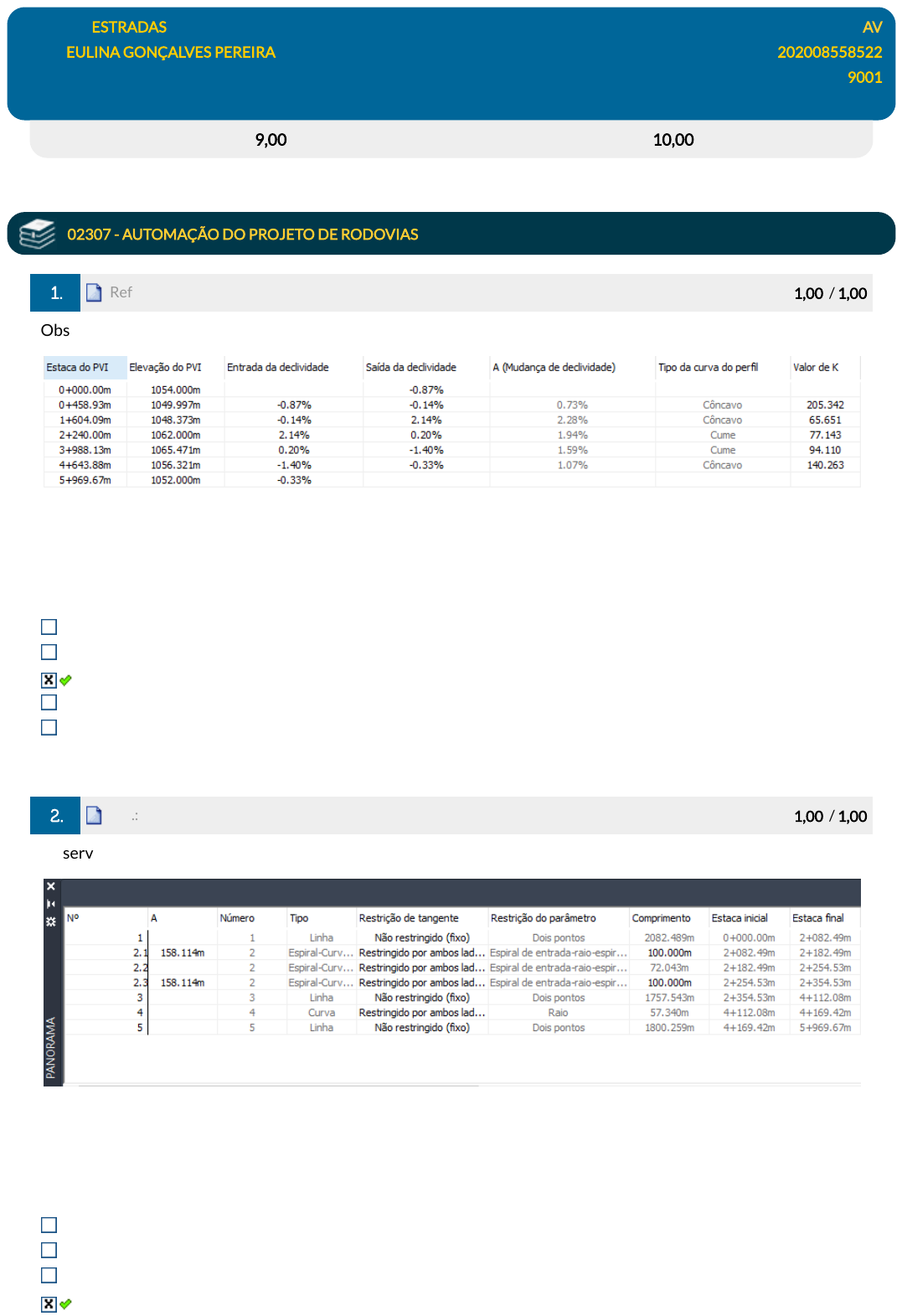 11/05/2023, 13:44 EPS https://simulado.estacio.br/alunos/ 1/4 Disciplina: ESTRADAS AV Aluno: EULINA GONÇALVES PEREIRA 202008558522 Turma: 9001 CCE2003_AV_202008558522 (AG) 18/10/2022 23:52:23 (F) Avaliação: 9,00 pts Nota SIA: 10,00 pts 02307 - AUTOMAÇÃO DO PROJETO DE RODOVIAS 1. Ref.: 6053729 Pontos: 1,00 / 1,00 Observe a janela a seguir: Captura de tela do software AutoCAD Civil 3D. A partir da primeira curva da tabela, é possível deduzir que: A cota do PIV é de 1062,00 m. O greide a jusante do PIV é um aclive. Os dois greides, de entrada e de saída, podem ser considerados declives. A inclinação do greide a jusante do PIV é de 2,14%. A inclinação do greide a montante do PIV é de 0,14%. 2. Ref.: 6053914 Pontos: 1,00 / 1,00 Observe a janela a seguir: Captura de tela do software AutoCAD Civil 3D. A partir da primeira curva da tabela, é possível deduzir que: Trata-se de uma curva circular sem transição. A espiral de saída e de entrada tem comprimentos diferentes. Trata-se de uma curva circular composta por três arcos circulares. A espiral de saída da curva tem comprimento de 5 estacas de 20 m. javascript:alert('C%C3%B3digo da quest%C3%A3o: 6053729.'); javascript:alert('C%C3%B3digo da quest%C3%A3o: 6053914.'); 11/05/2023, 13:44 EPS https://simulado.estacio.br/alunos/ 2/4 A espiral de entrada da curva tem comprimento de 72,043 m. 02409 - ELEMENTOS DE PROJETO DE FERROVIAS 3. Ref.: 6056318 Pontos: 0,00 / 1,00 Um trem de bitola métrica possui V = 40km/h e passa por uma curva de raio de 400m. Arredondando para o múltiplo de estaca inteira mais próximo, calcule a superelevação a ser adotada dessa curva. 30,6mm 32,6mm 34,6mm 36,6mm 28,6mm 4. Ref.: 6056316 Pontos: 1,00 / 1,00 O limite de superelevação para uma bitola internacional é de: 0,1m 0,16m 0,1435m 0,2m 0,12m 02623 - MOVIMENTOS DE TERRA E DRENAGEM 5. Ref.: 6047988 Pontos: 1,00 / 1,00 Um terreno de dimensões 30 × 15m e com superfície regularizada necessita ter sua cota rebaixada em 10cm. Considerando que haverá um empolamento de 20%, a terra excedente a ser transportada será de: 6. Ref.: 6048244 Pontos: 1,00 / 1,00 Observe a planilha de volumes a seguir: Estaca Corte ( ) Aterro ( ) 90 339,46 91 274,73 92 218,26 93 156,38 94 106,6 40m3 50m3 48m3 45m3 54m3 m 2 m 2 javascript:alert('C%C3%B3digo da quest%C3%A3o: 6056318.'); javascript:alert('C%C3%B3digo da quest%C3%A3o: 6056316.'); javascript:alert('C%C3%B3digo da quest%C3%A3o: 6047988.'); javascript:alert('C%C3%B3digo da quest%C3%A3o: 6048244.'); 11/05/2023, 13:44 EPS https://simulado.estacio.br/alunos/ 3/4 95 76,8 96 23,15 97 9,66 10,28 98 3,12 28,23 99 46,18 100 50,26 Extraído de ANTAS, P.M. et al.Estradas -Projeto geométrico e de terraplenagem. 1ª ediçãoEditora Interciência, Rio de Janeiro-RJ. 2010. As estacas que apresentam uma compensação lateral são: 96 e 98 96 e 99 95 e 96 95 e 97 97 e 98 02742 - PROCESSOS DE PROJETO DE RODOVIAS 7. Ref.: 6040839 Pontos: 1,00 / 1,00 Um projeto referente ao detalhamento da estrutura como a da foto a seguir é chamado de projeto de Fonte: https://www.shutterstock.com/pt/image-photo/viaduto-13-ferrovia-do-trigo-aerial-1847556553 superestrutura. ligação. obra de arte especial. obra de arte corrente. drenagem. 8. Ref.: 6040563 Pontos: 1,00 / 1,00 Quais estudos são importantes para o desenvolvimento dos estudos de traçado? Estudos topográ�cos. Estudos sociais. Estudos geotécnicos. Estudos hidrológicos. javascript:alert('C%C3%B3digo da quest%C3%A3o: 6040839.'); javascript:alert('C%C3%B3digo da quest%C3%A3o: 6040563.'); 11/05/2023, 13:44 EPS https://simulado.estacio.br/alunos/ 4/4 Estudos geológicos. 02753 - PROJETO GEOMÉTRICO DE RODOVIAS 9. Ref.: 6056531 Pontos: 1,00 / 1,00 Calcule a superlargura em uma curva horizontal, sendo dados os seguintes elementos: Largura do veículo: Lv = 2,50m; Distância entre os eixos do veículo: 6,10 m (E); Distância entre a frente do veículo e o eixo dianteiro: 1,20 m (Bd); Raio da curva: 200 m; Velocidade de projeto: V = 80 km/h; Faixas de tráfego de 3,6 m (Lb = 7,2 m); Número de faixas: 2. Das opções a seguir, arredonde o resultado para o múltiplo de 0,20 m imediatamente superior. 1,00 m 0,60 m 0,20 m 0,40 m 0,80 m 10. Ref.: 6056530 Pontos: 1,00 / 1,00 Numa rodovia de Classe I, temos: , . Se uma curva nessa rodovia tem raio de 600 m, calcule a superelevação a ser adotada e escolha a mais adequada dentre as opções abaixo: 6,9% 7,2% 8,1% 7,8% 7,5% emáx = 8 V = 100km/h javascript:alert('C%C3%B3digo da quest%C3%A3o: 6056531.'); javascript:alert('C%C3%B3digo da quest%C3%A3o: 6056530.');