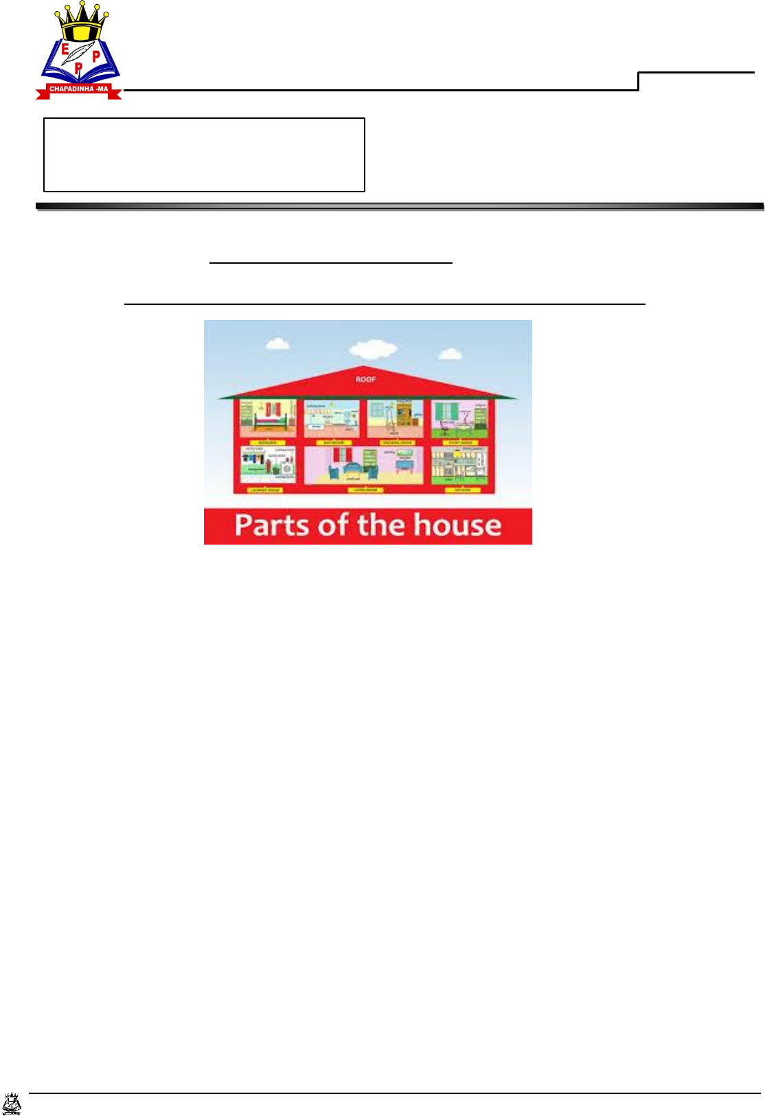 ESCOLA “O Pequeno Príncipe”Chapadinha –MA “Educação se faz com Responsabilidade e Competência” - 1º Bimestre 2020 / Ensino Fundamental – Anos Iniciais Ensino Fundamental – Anos Iniciais ESCOLA “O Pequeno Príncipe” 3º ANO ATIVIDADE DE REVISÃO 04|06|2020 PARTS OF THE HOUSE (PÁGINAS 39 a 40) QUESTÕES 1 a 5 1) ESCREVA EM INGLÊS OS CÔMODOS DA CASA: a) SALA DE ESTAR _____________________ b) BANHEIRO __________________ c) COZINHA __________________ d) LAVANDERIA __________________ 2) ASSINALE CORRETAMENTE COM (X) A QUESTÃO CORRETA QUANTO À TRADUÇÃO: a) ( ) GARAGE – COZINHA b) ( ) BEDROOM – QUARTO c) ( ) ATTIC – SALA DE ESTAR d) ( ) DINING ROOM – BANHEIRO INGLÊS ESCOLA “O Pequeno Príncipe”Chapadinha –MA “Educação se faz com Responsabilidade e Competência” - 1º Bimestre 2020 / Ensino Fundamental – Anos Iniciais 3) DESENHE UM DOS CÔMODOS DE SUA CASA E ESCREVA O NOME EM INGLÊS : ( RESPOSTA PESSOAL ) 4) COMPLETE COM A LETRA QUE ESTÁ FALTANDO AOS CÔMODOS DA CASA: a) B A T ____ R O O M c) ____ I T C H E N b) G A R A G _____ d) A T ____ I C 5) QUAL CÔMODO DA CASA VOCÊ MAIS GOSTA? ESCREVA -O EM INGLÊS: _____________________________ FARM ANIMALS – (PÁGINAS 47 a 49) QUESTÕES 6 a 10 6) OBSERVE O DIÁLOGO DA PÁGINA 47 E COMPLETE COM AS PALAVRAS QUE FALTAM NAS FRASES ABAIXO: a) I _____________ THE DUCKS AND THE RABBITS. b) THERE IS A ______________. c) IT IS MY ____________ TIME IN A FARM. d) WE CAN HAVE FUN WITH THE ___________ , THE __________, AND THE PIGS. ESCOLA “O Pequeno Príncipe”Chapadinha –MA “Educação se faz com Responsabilidade e Competência” - 1º Bimestre 2020 / Ensino Fundamental – Anos Iniciais 7) CIRCULE OS NOMES DOS ANIMAIS EM INGLÊS : COELHO | CAVALO | PORCO | GALINHA DOG PIG CAT CHICKEN HORSE LION RABBIT 8) FAÇA UM DESENHO DE UM ANIMAL DA FAZENDA QUE VOCÊ GOSTA MUITO: (RESPOSTA PESSOAL) 9) QUAL O INGLÊS DE CAVALO? MARQUE A RESPOSTA CORRETAMENTE: a) ( ) RABBIT c) ( ) HORSE b) ( ) CHICKEN d) ( ) DUCK 10 ) O ANIMAL COW VIVE: a) ( ) IN A FARM b) ( ) IN A PARK YOU ARE VERY INTELLIGENT! (VOCÊ É MUITO INTELIGENTE!)
